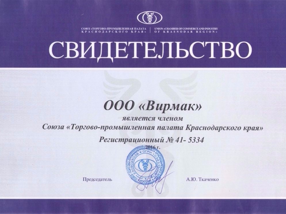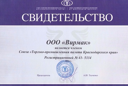 Сентябрь 2016 года. Компания ВИРМАК — член Торгово-промышленной палаты РФ