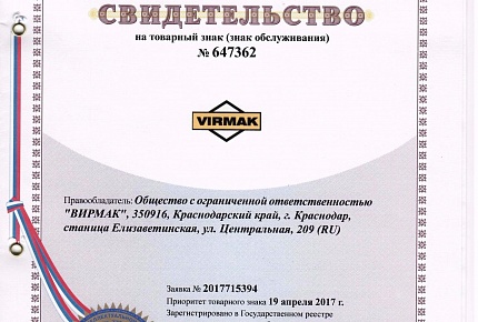 19 апреля 2017 года компания ВИРМАК получила свидетельство на товарный знак.