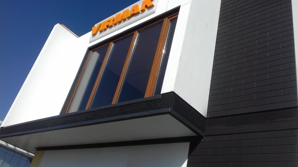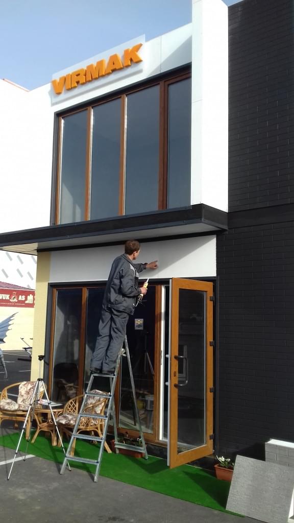 На павильоне компании ВИРМАК (павильон был построен за четыре дня к международной выставке YUG BUILD 2016) были использованы СИП панели с ЦСП структурированные «под кирпич».
