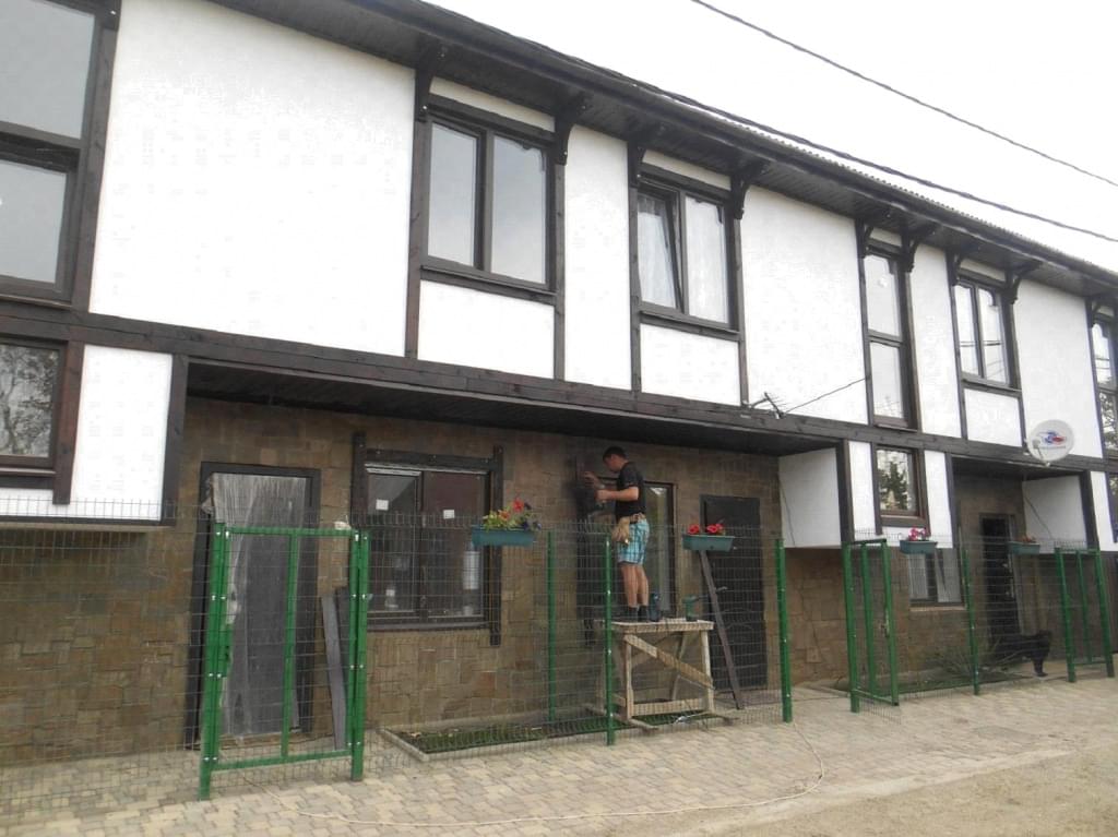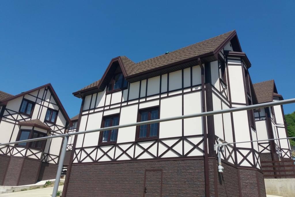 На примере трехквартирного «таун-хауса» Вы можете ознакомиться с применением немецкого стиля «фахверк» в наружной отделке второго этажа и применением натурального камня в наружной отделке на первом.