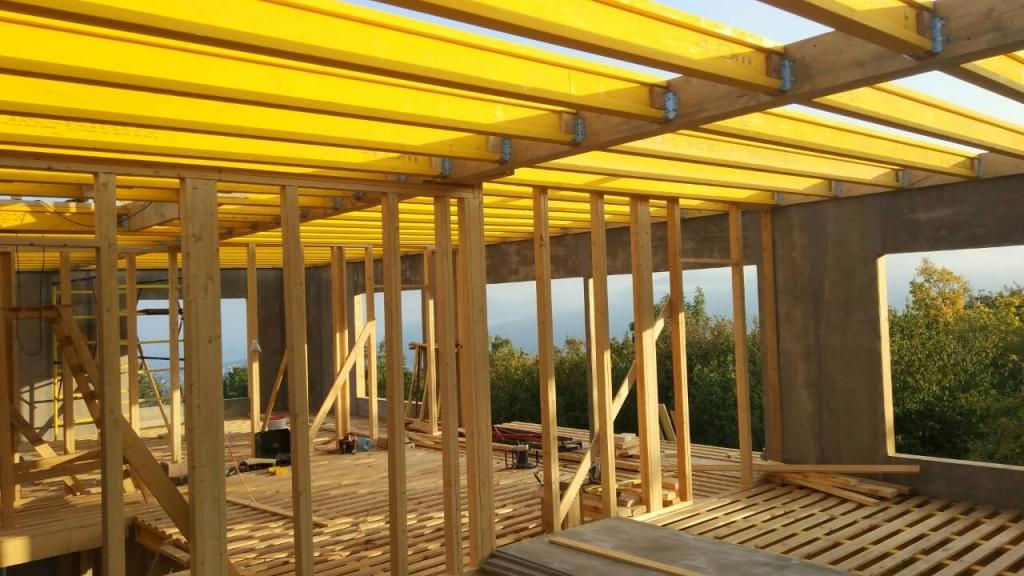 В межэтажных перекрытиях в качестве несущих лаг мы применяем двутавровые балки собственного производства с влагостойкой 24 мм. фанерой в сердечнике.