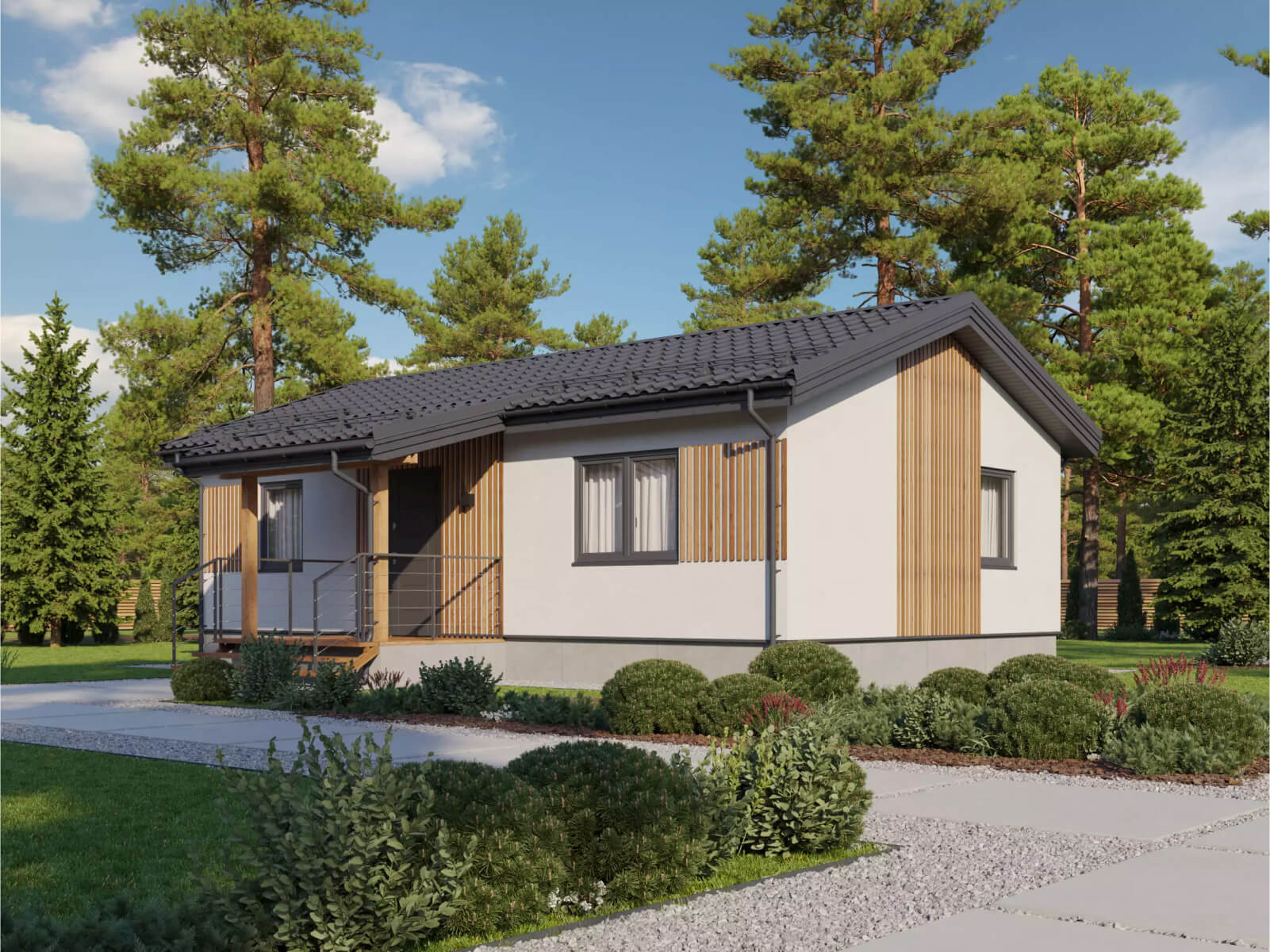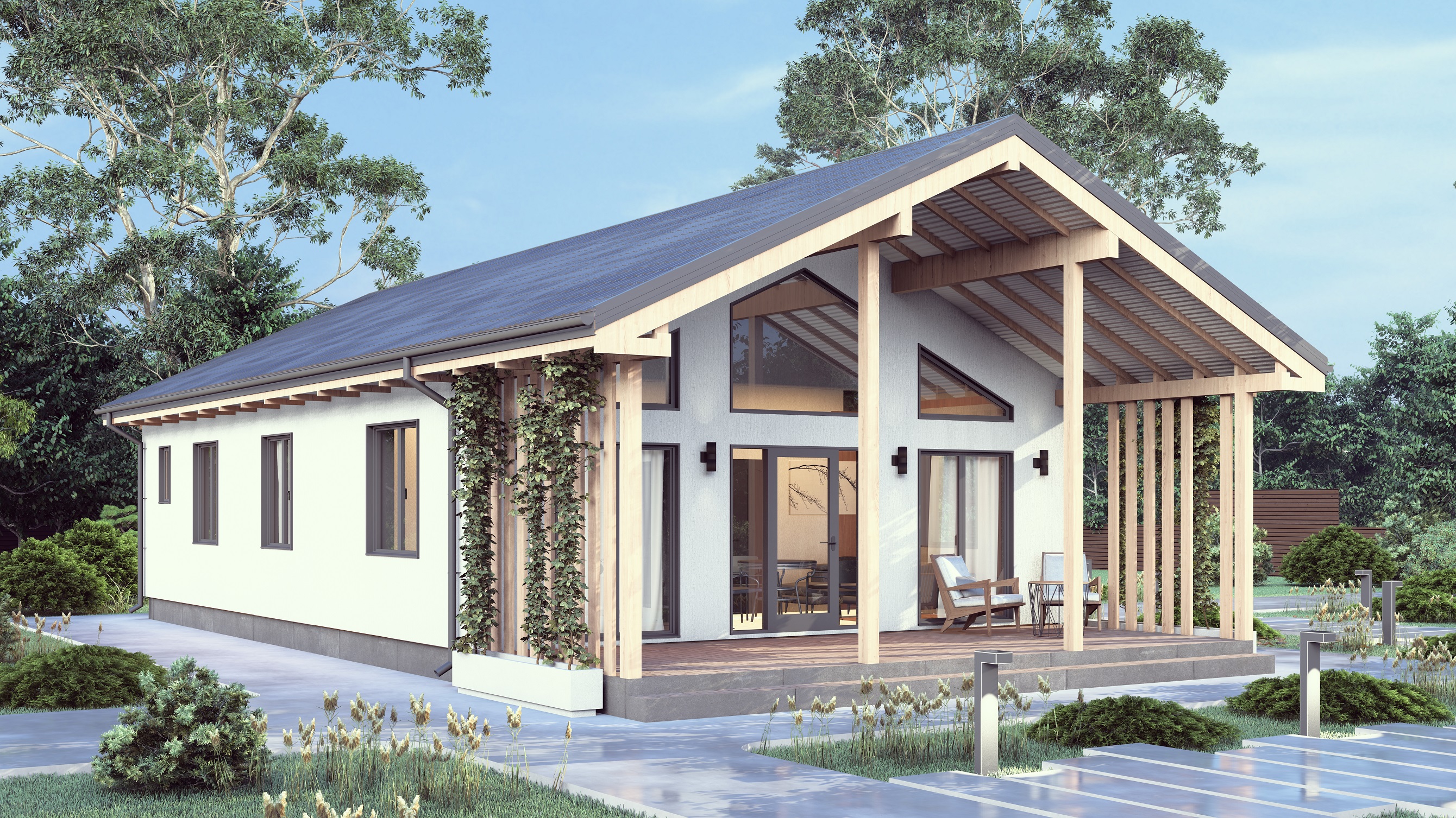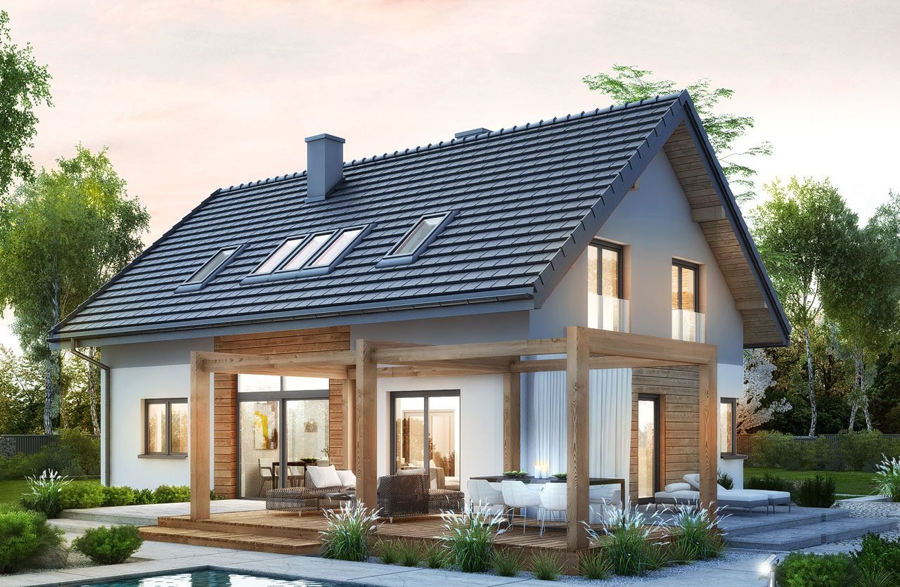 Современный европейский стиль основан на принципах рационализма и практичности. Обычно это одноэтажные дома с мансардой и простой двухскатной кровлей, возможно наличие эркеров и балконов. Открытая планировка, теплая цветовая гамма и функциональность – вот основные отличия домов этого стиля.