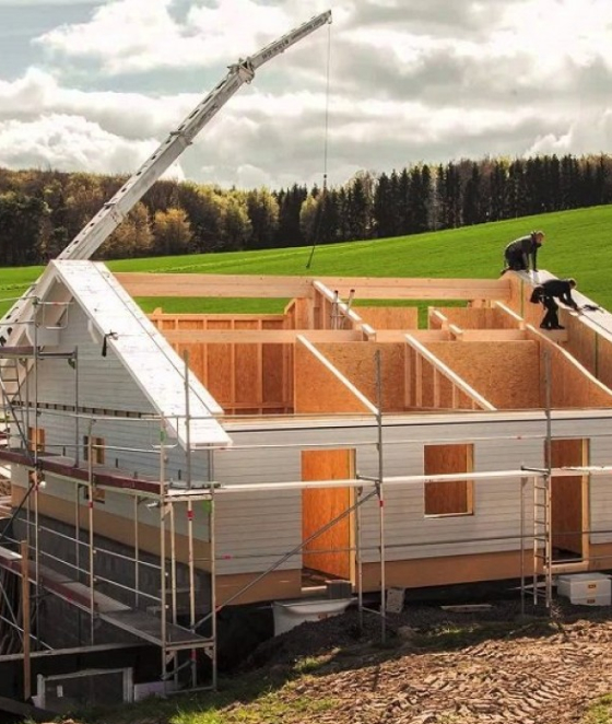 Построить дом заводского изготовления из крупных стеновых панелей и стропильных деревянных ферм с МЗП.