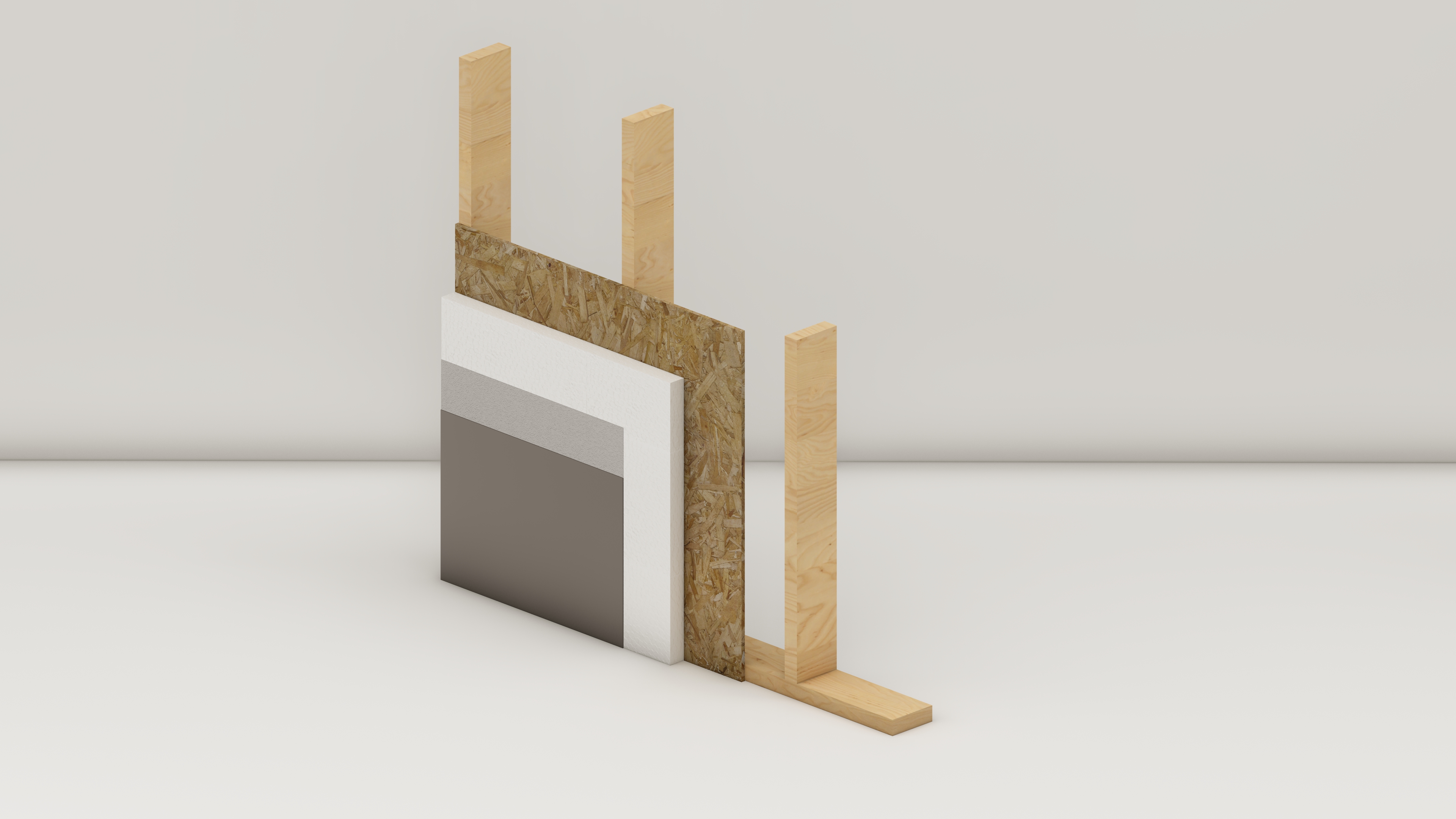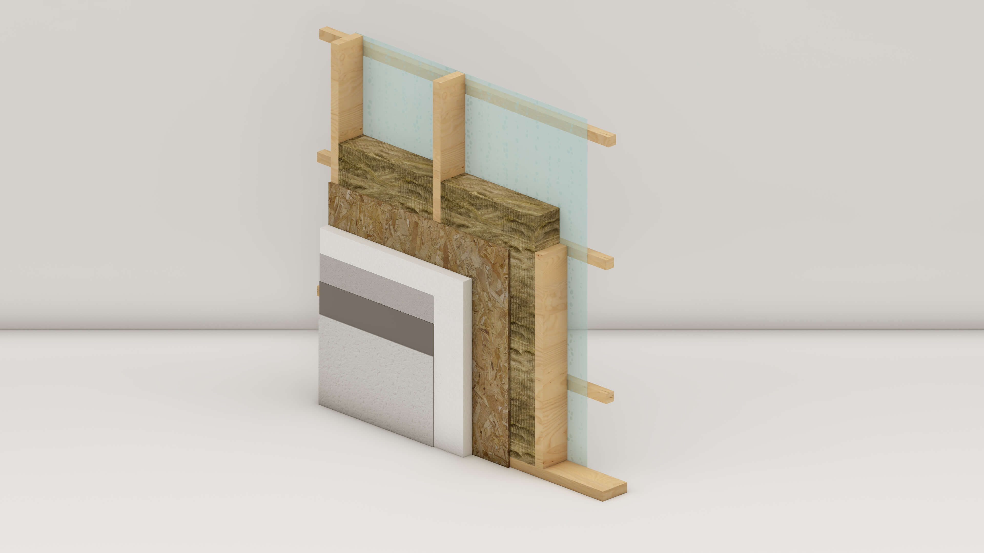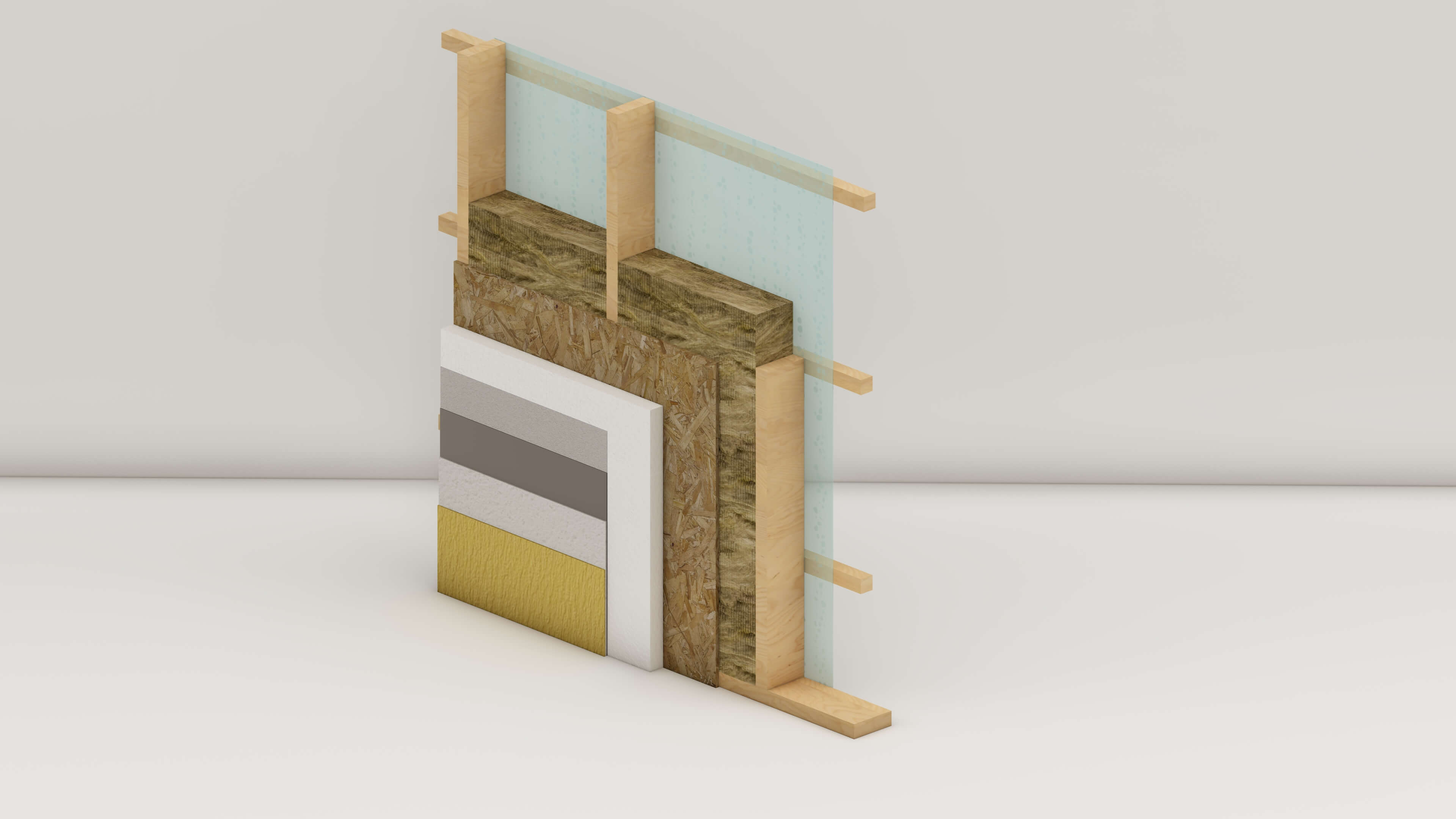 Несущий каркас с наружной обшивкой листами ОСБ и наружной отделкой системой СФТК, как и в комплектации №1, плюс утепление каркаса с защитой изнутри пароизоляцией и фиксацией рейкой шагом 600 мм, для удобства разводки коммуниуаций в конструкии стены под листовым материалом.