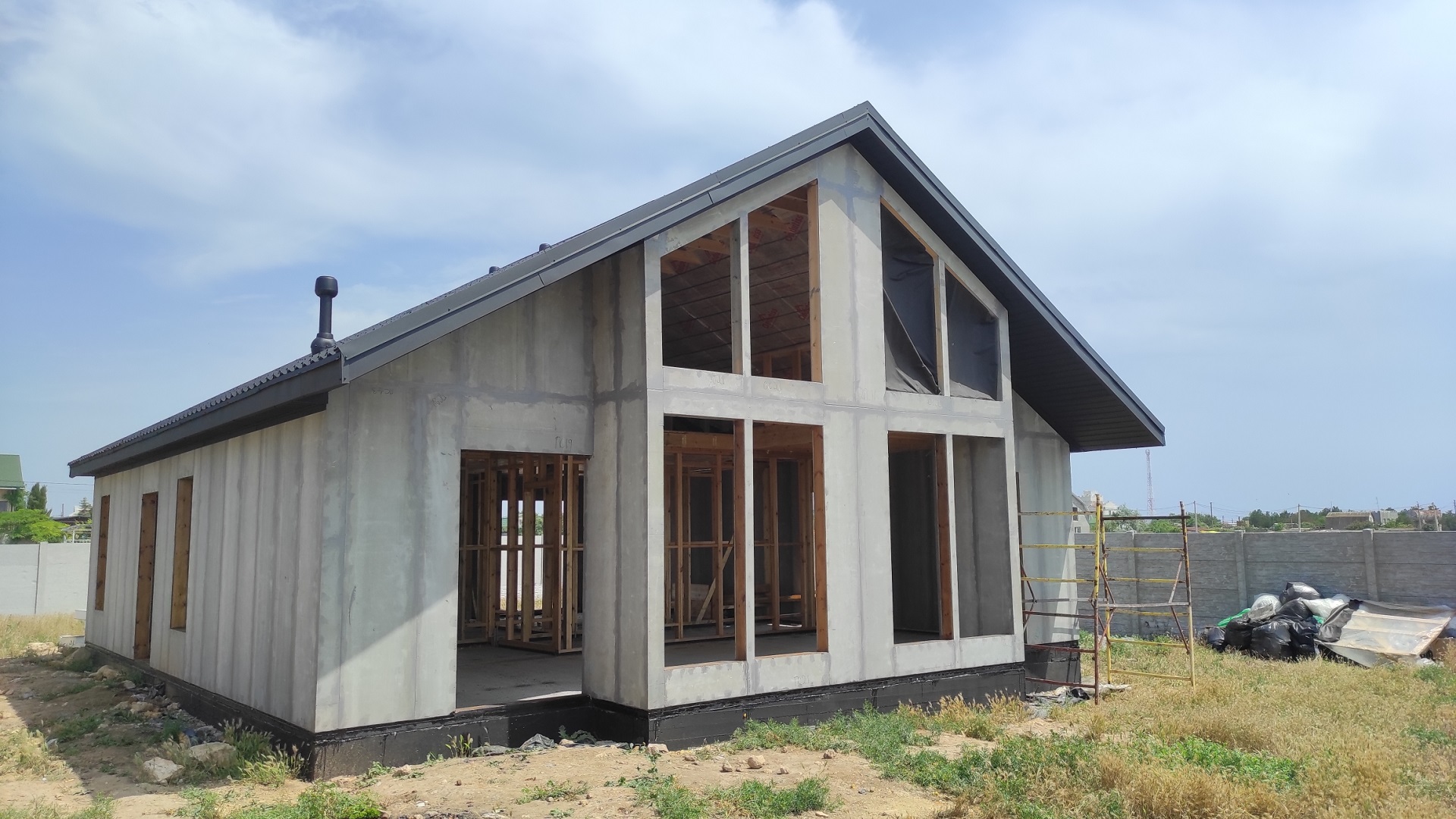 *в данной комплектации желателен монтаж окон для своевременной отделки «оконных откосов», а также возможна замена ОСБ на ЦСП, а также возможна установка внутри каркаса листов ГСПВ или ГВЛВ на временный крепеж.