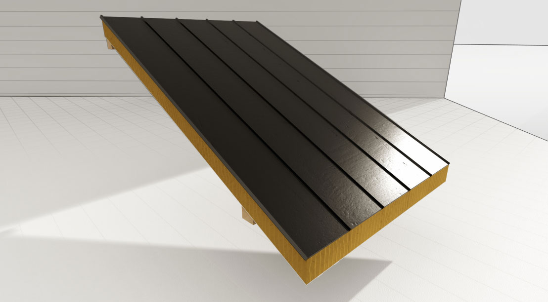 • Трехслойная сендвич панель кровельная толщиной 100/150/200 мм, состоящая из нижниго листа металла 0,5 мм с ребрами жесткости в белом цвете и верхнего листа металла 0,5 мм в цвете графит с замком КликФальц. Утеплитель между листами - ИзоверСендвичЛайф плотности более 64 кг/м3