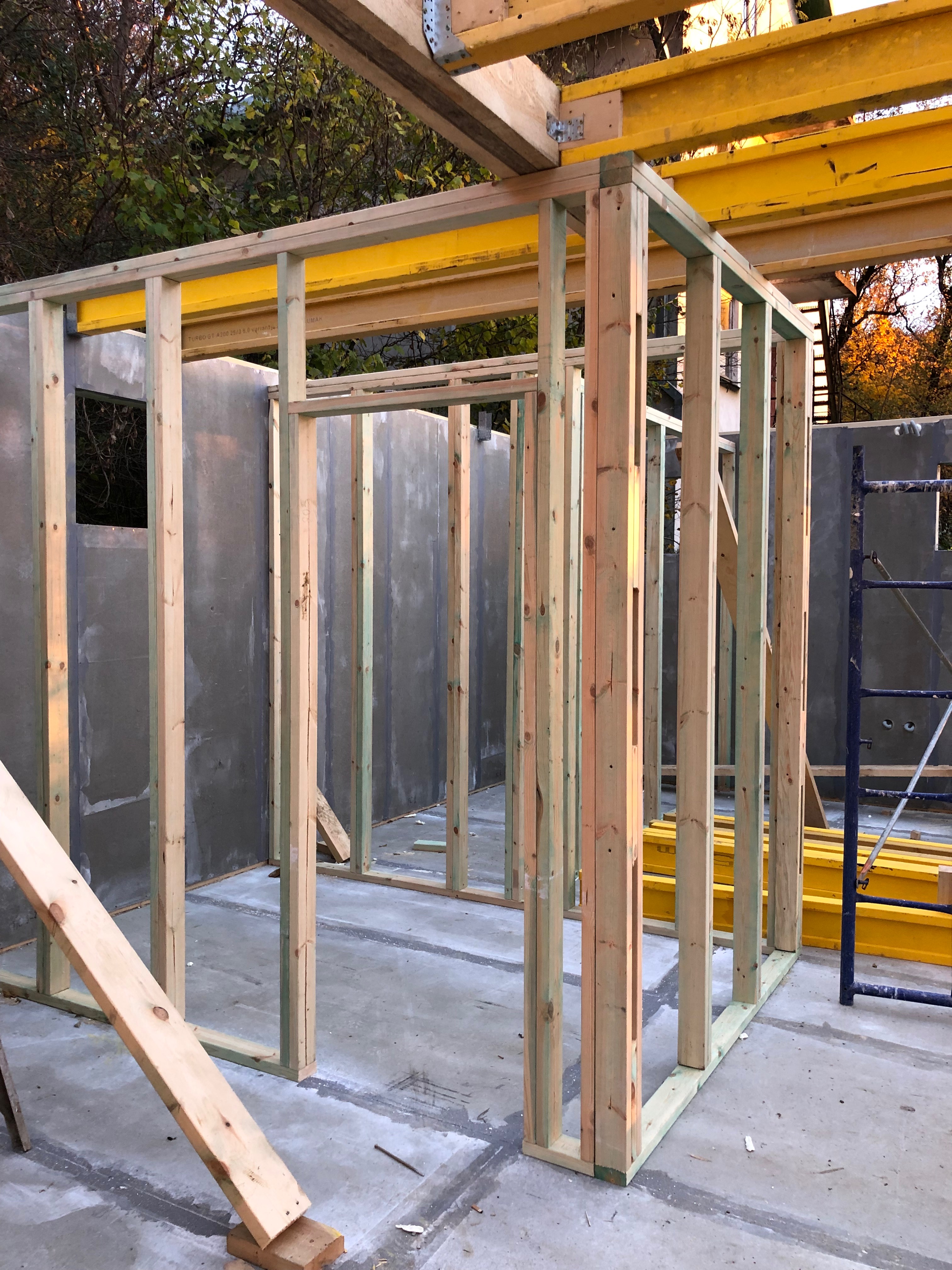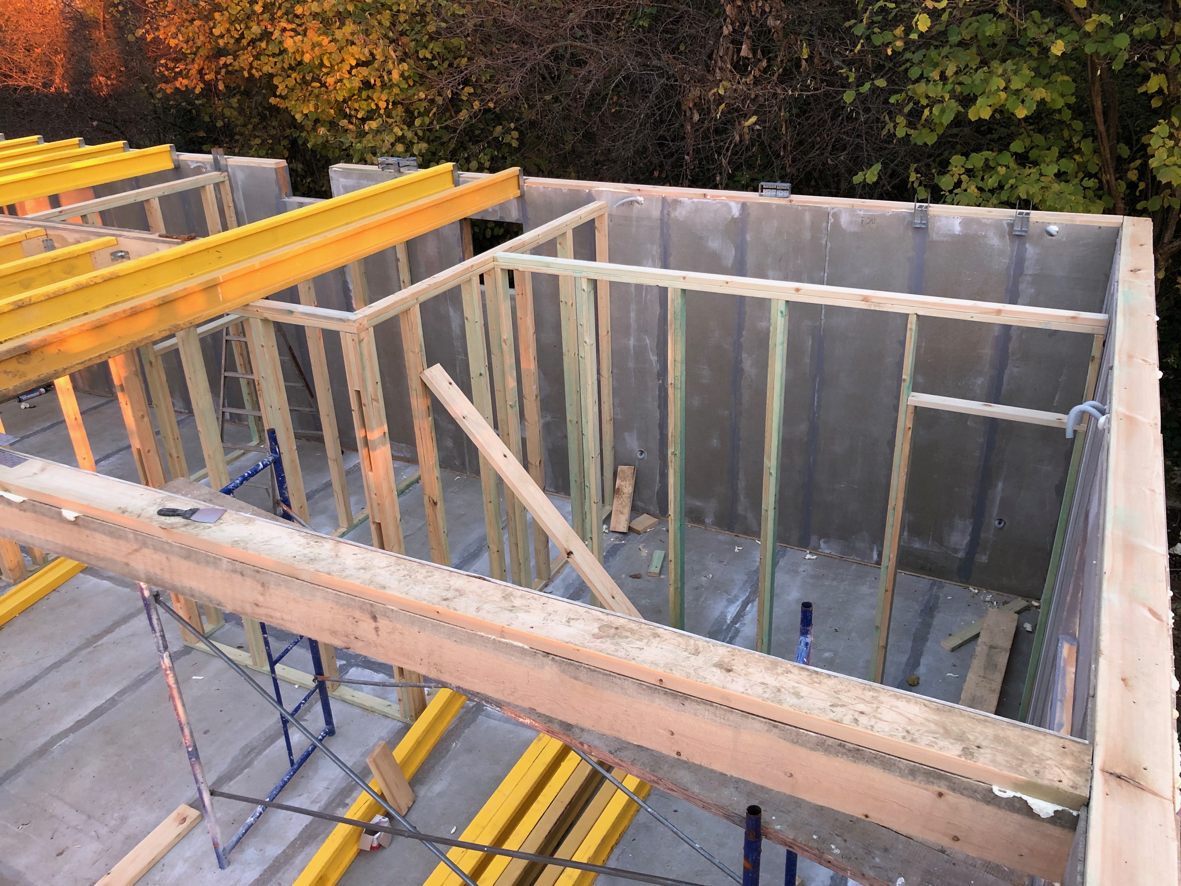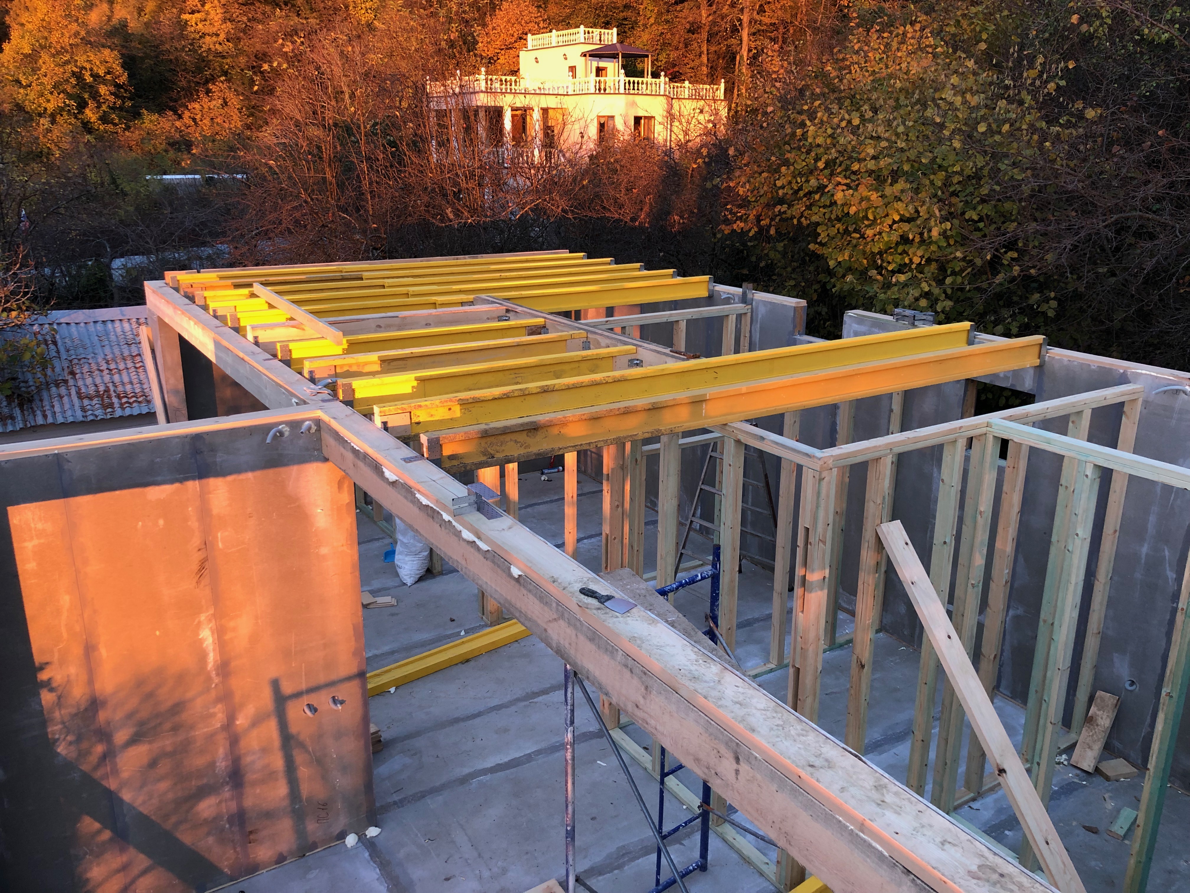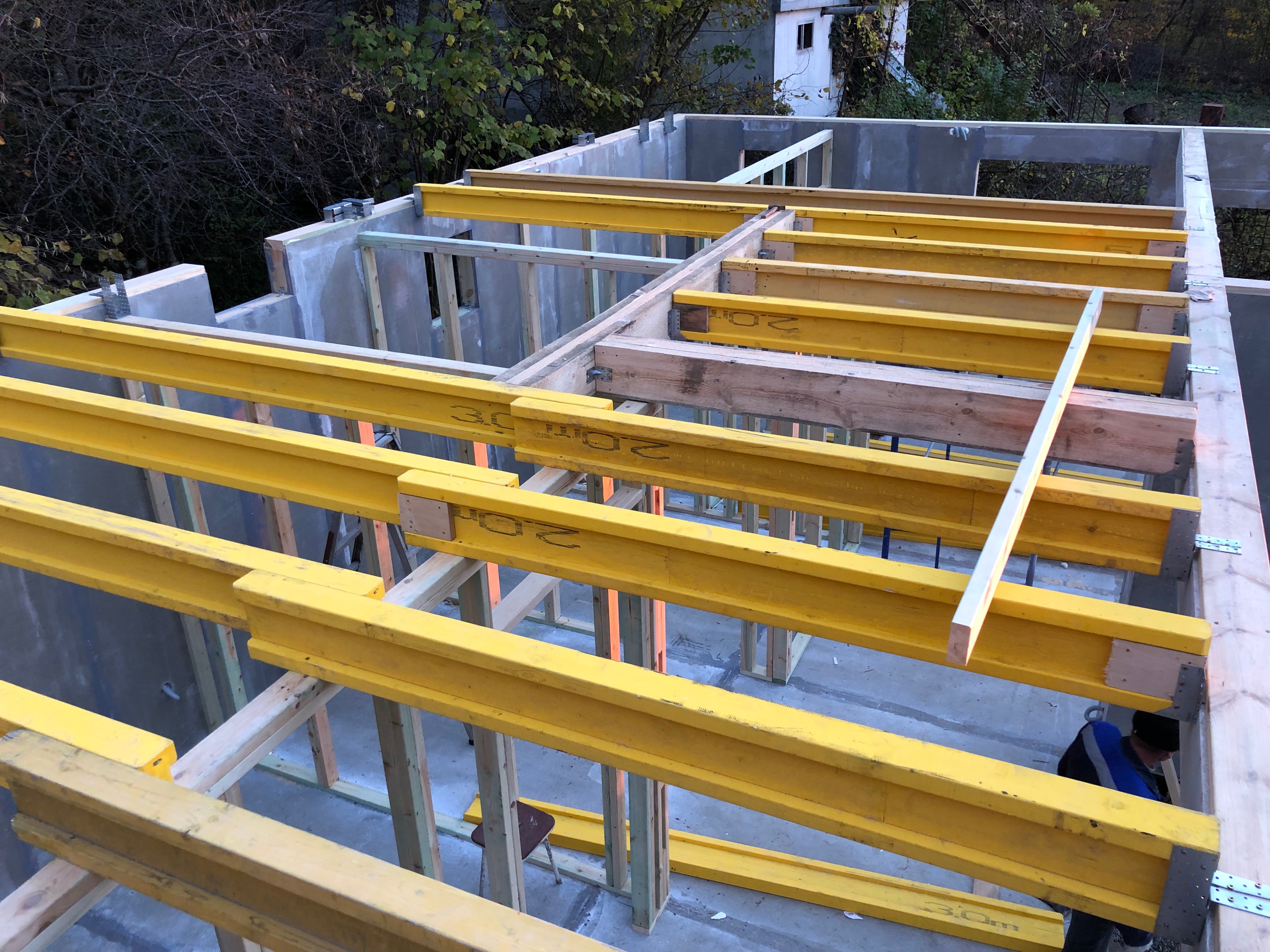 В межэтажных перекрытиях в качестве несущих лаг мы применяем двутавровые балки собственного производства с влагостойкой 24 мм. фанерой в сердечнике.