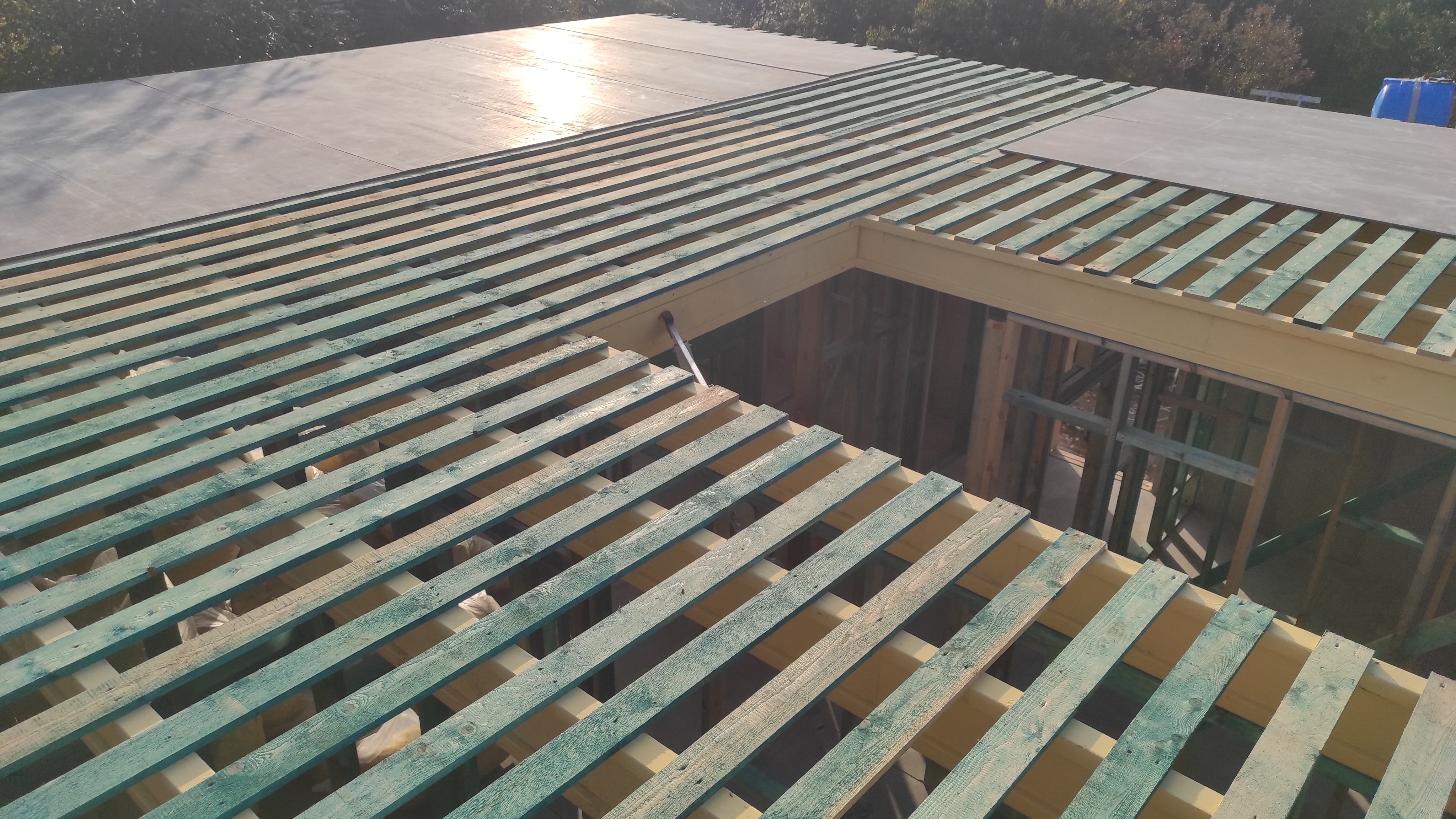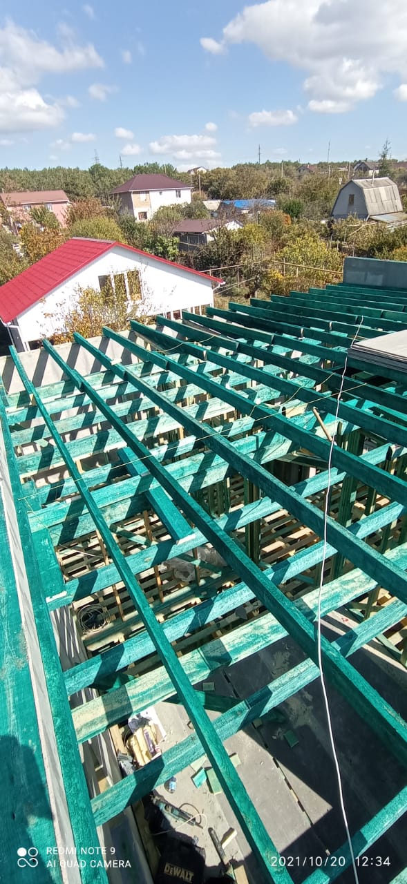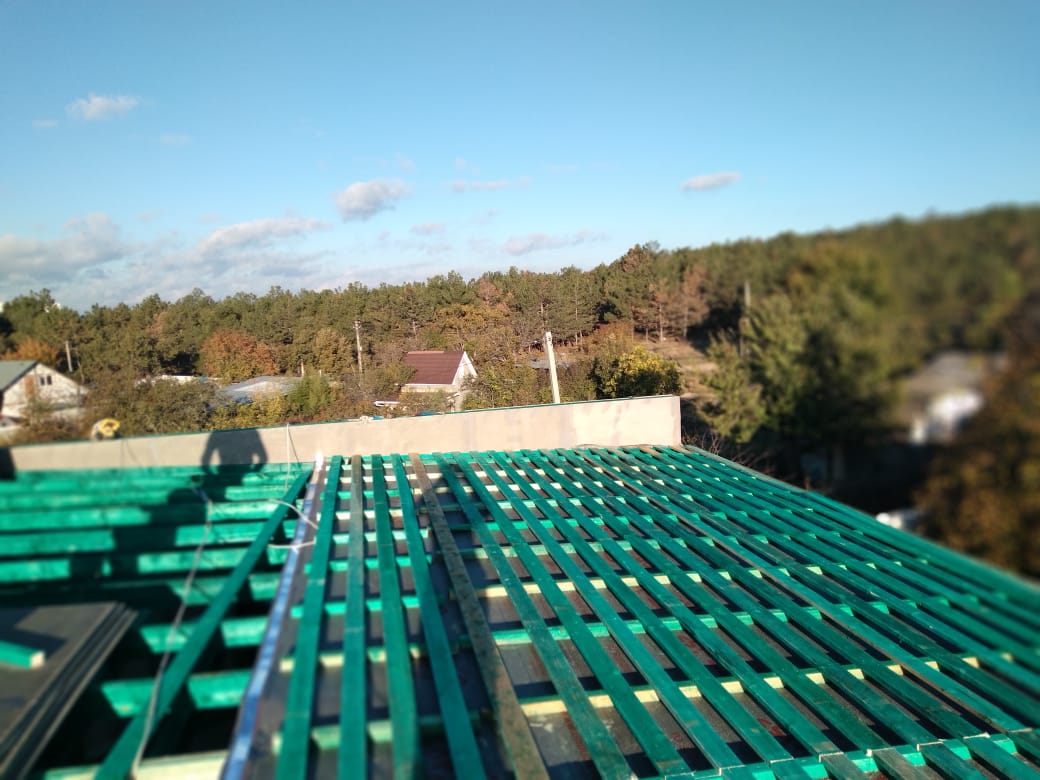 Кровля может быть построена из бруса 150х50мм или SIP панелей. В качестве кровельного материала можно использовать: металлочерепицу, битумную и керамическую черепицу. Также производим кровельные шовные сэндвич-панели.
