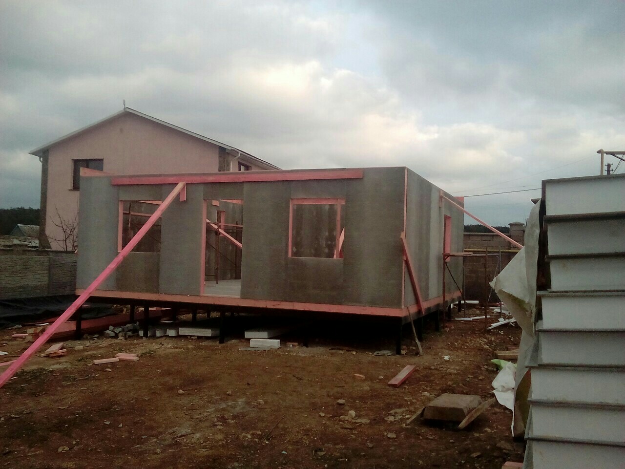Дом 128 квадратных метров.Два этажа (второй этаж - мансардный). Дом из СИП панелей с ЦСП (структурированы под "короед")