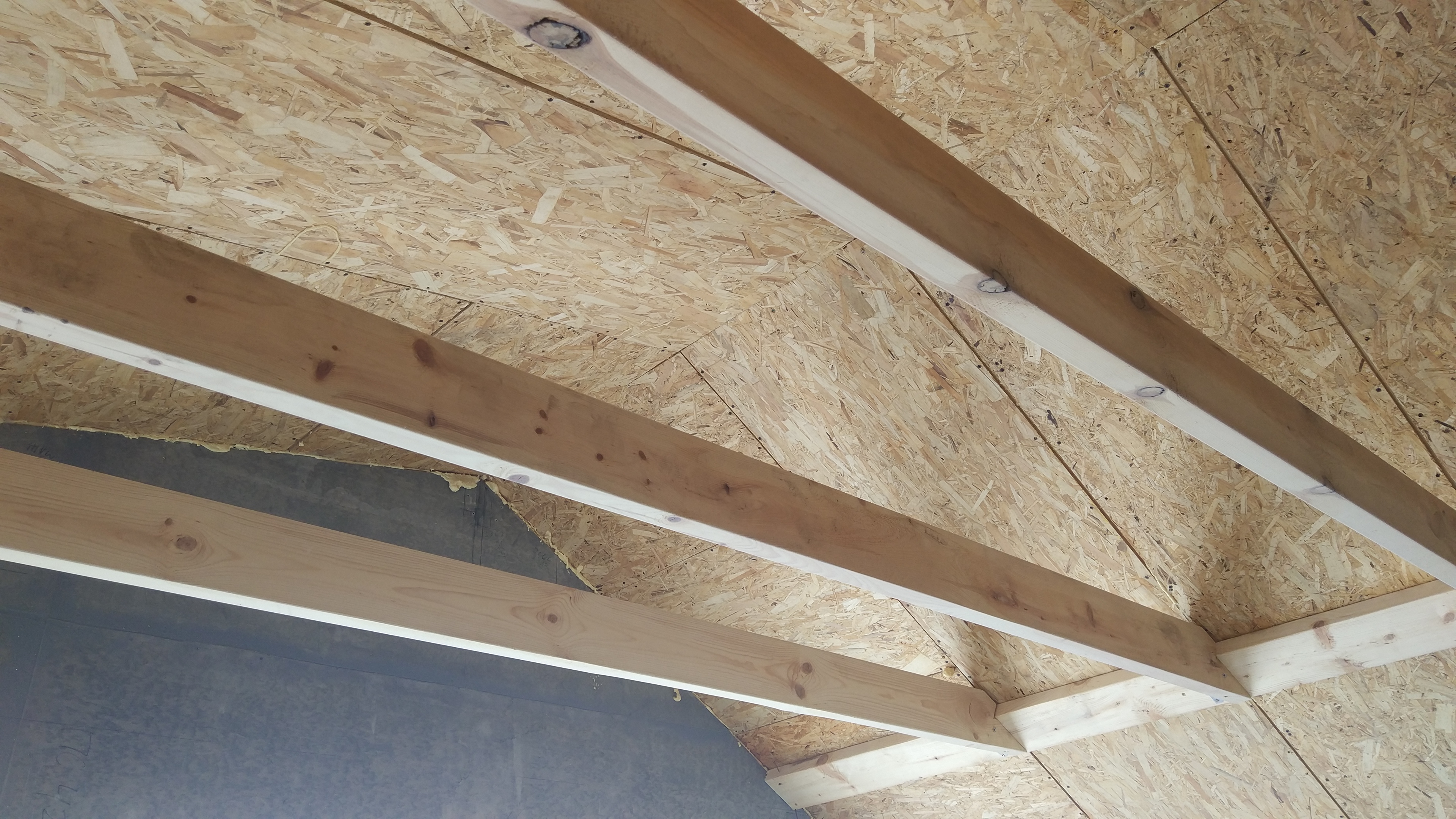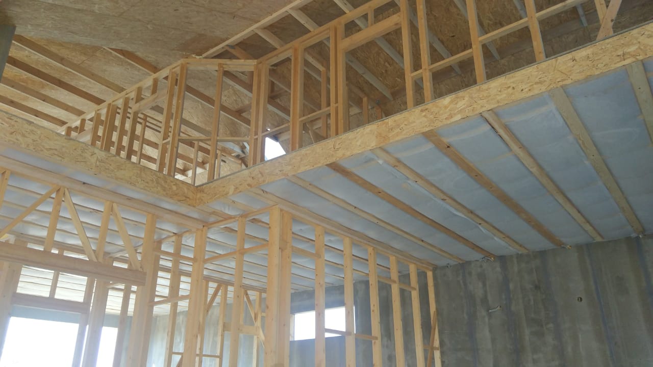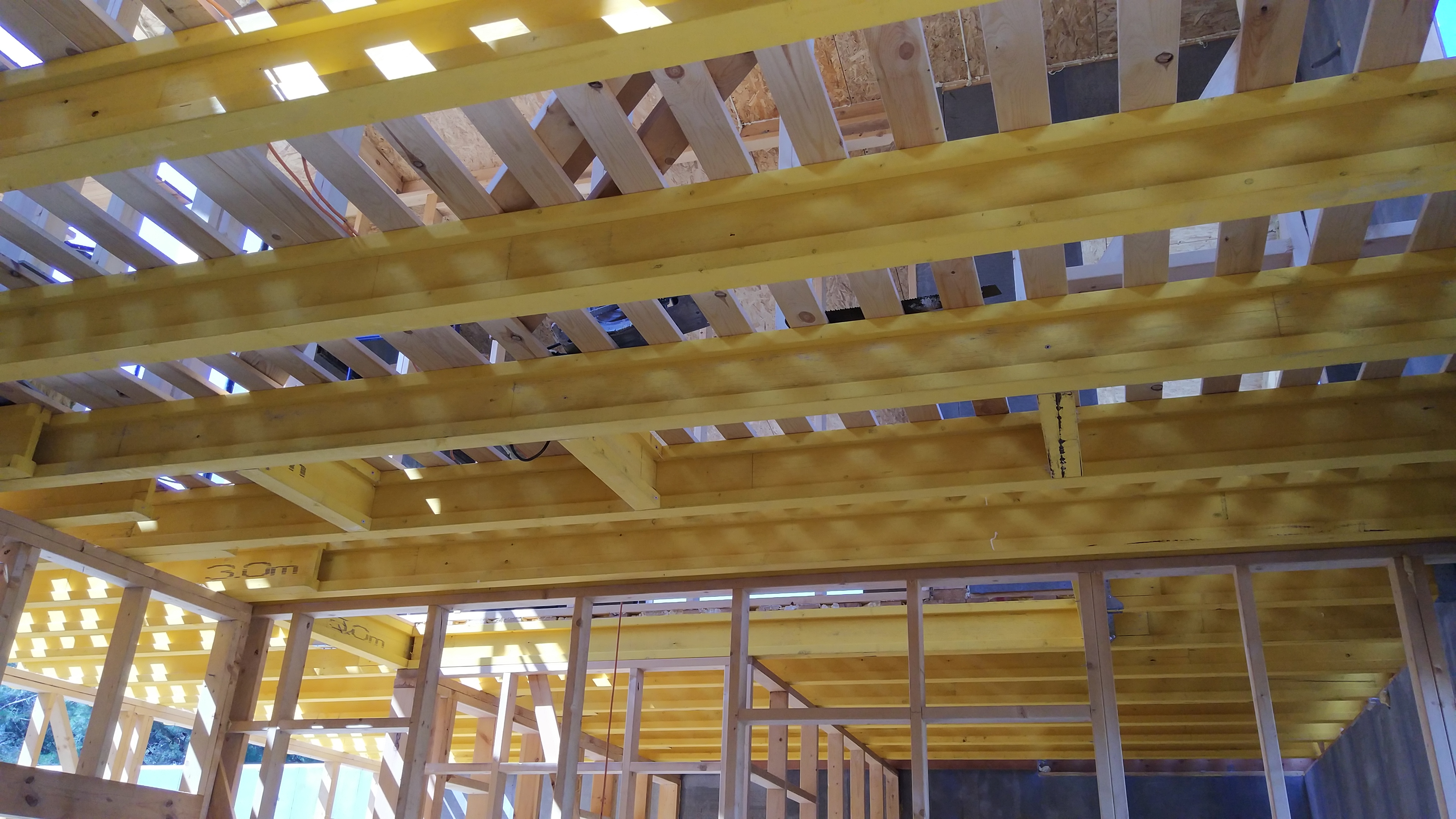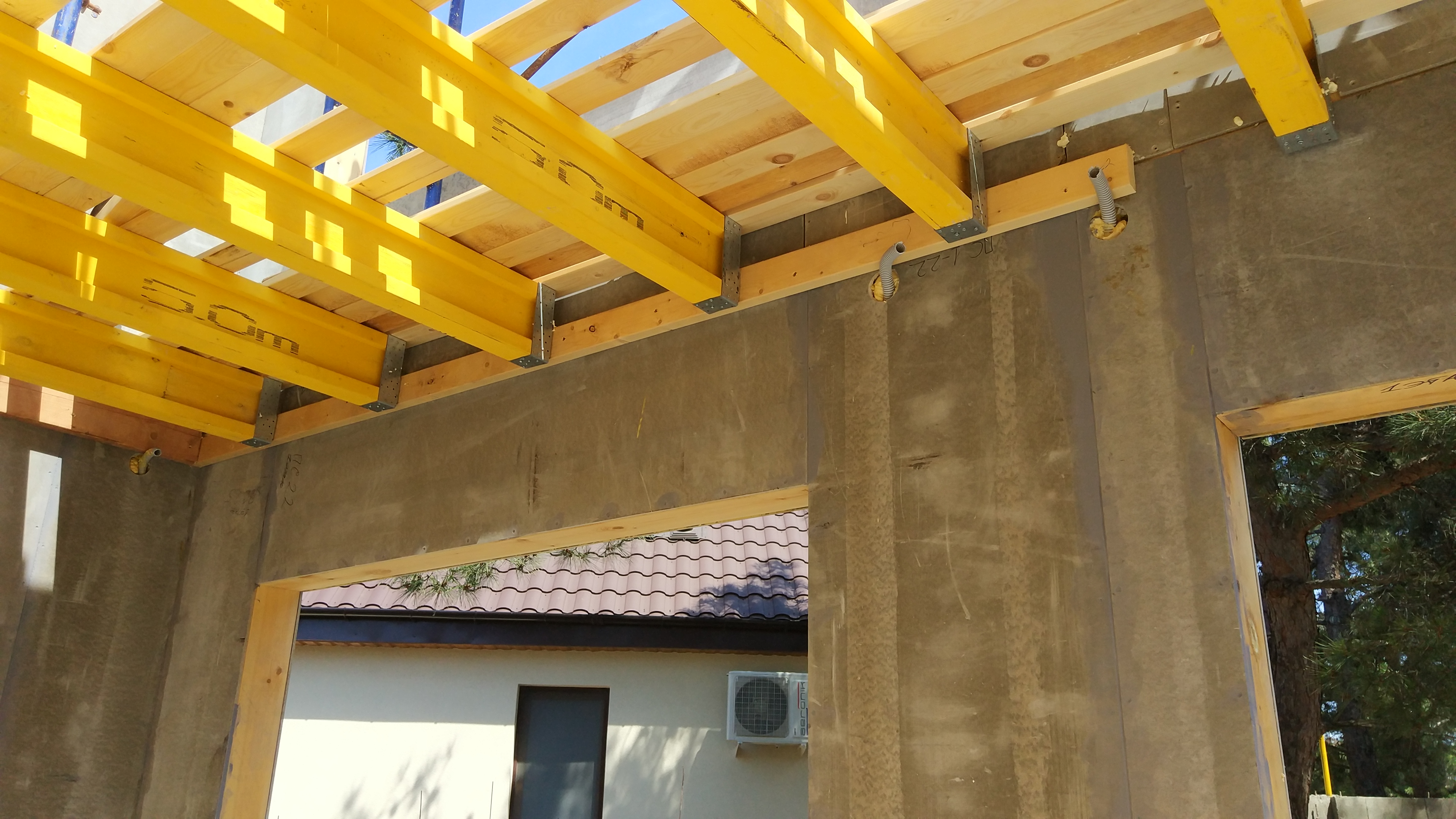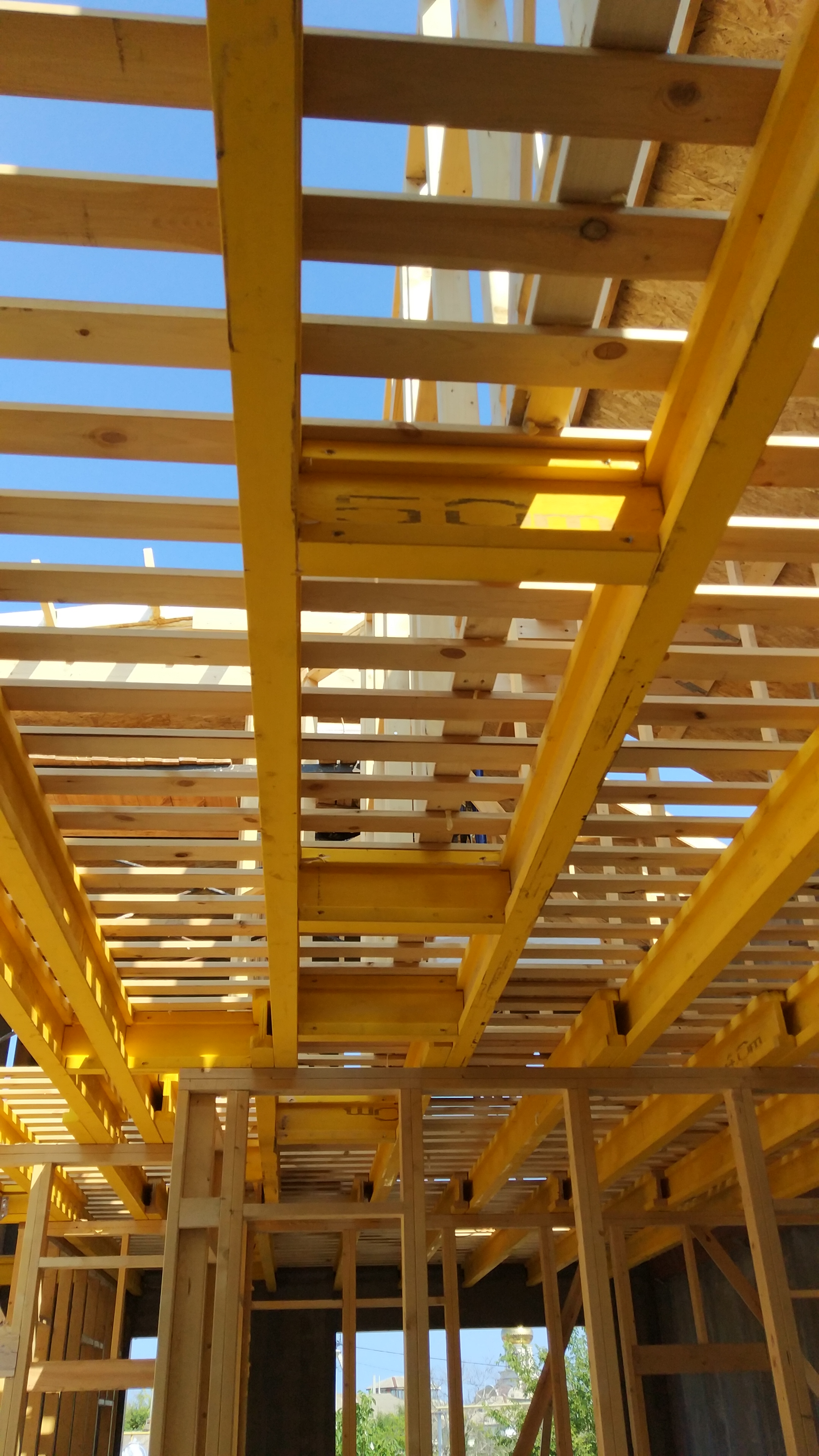 В межэтажных перекрытиях в качестве несущих лаг мы применяем двутавровые балки собственного производства с влагостойкой 24 мм. фанерой в сердечнике.