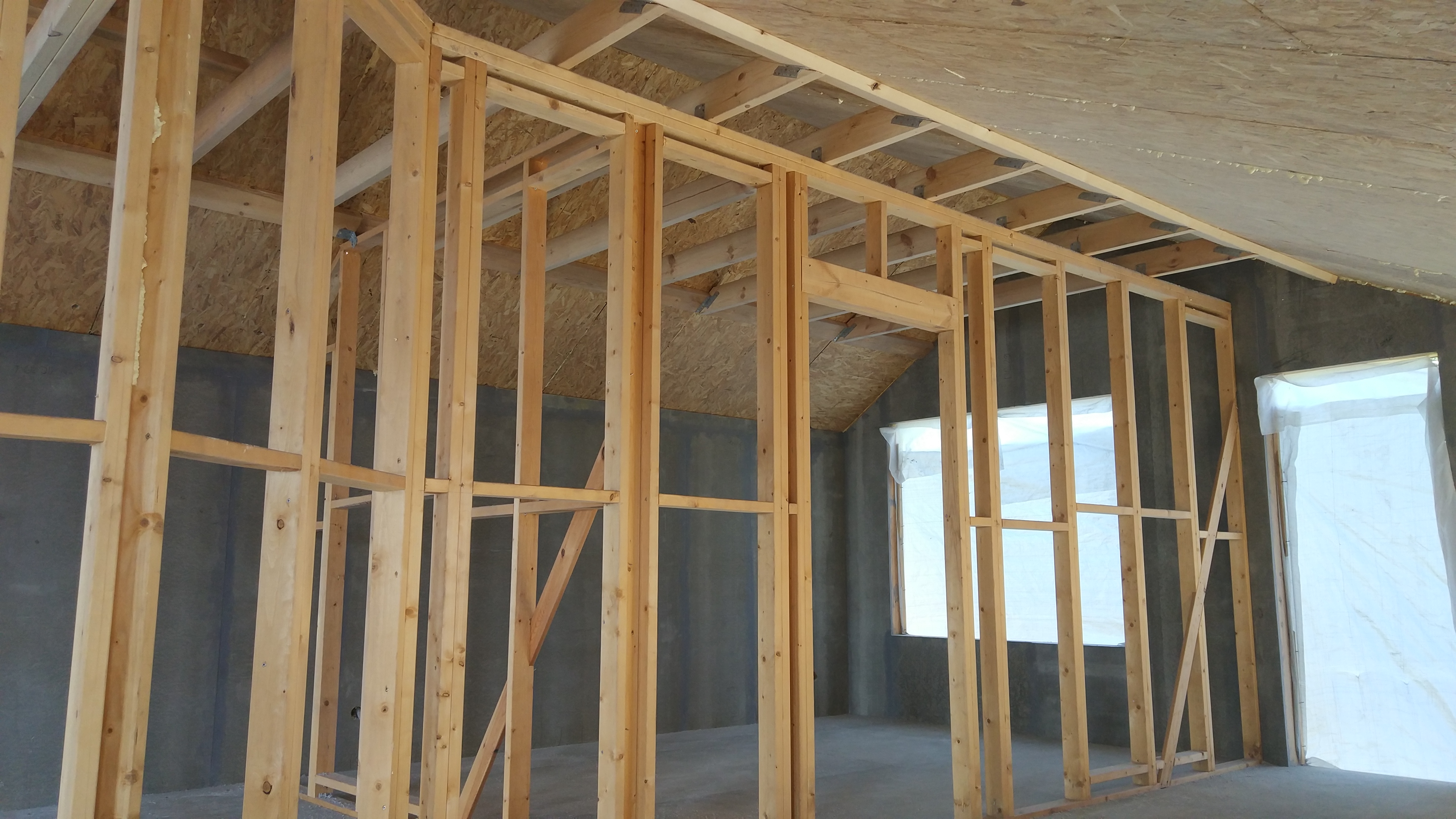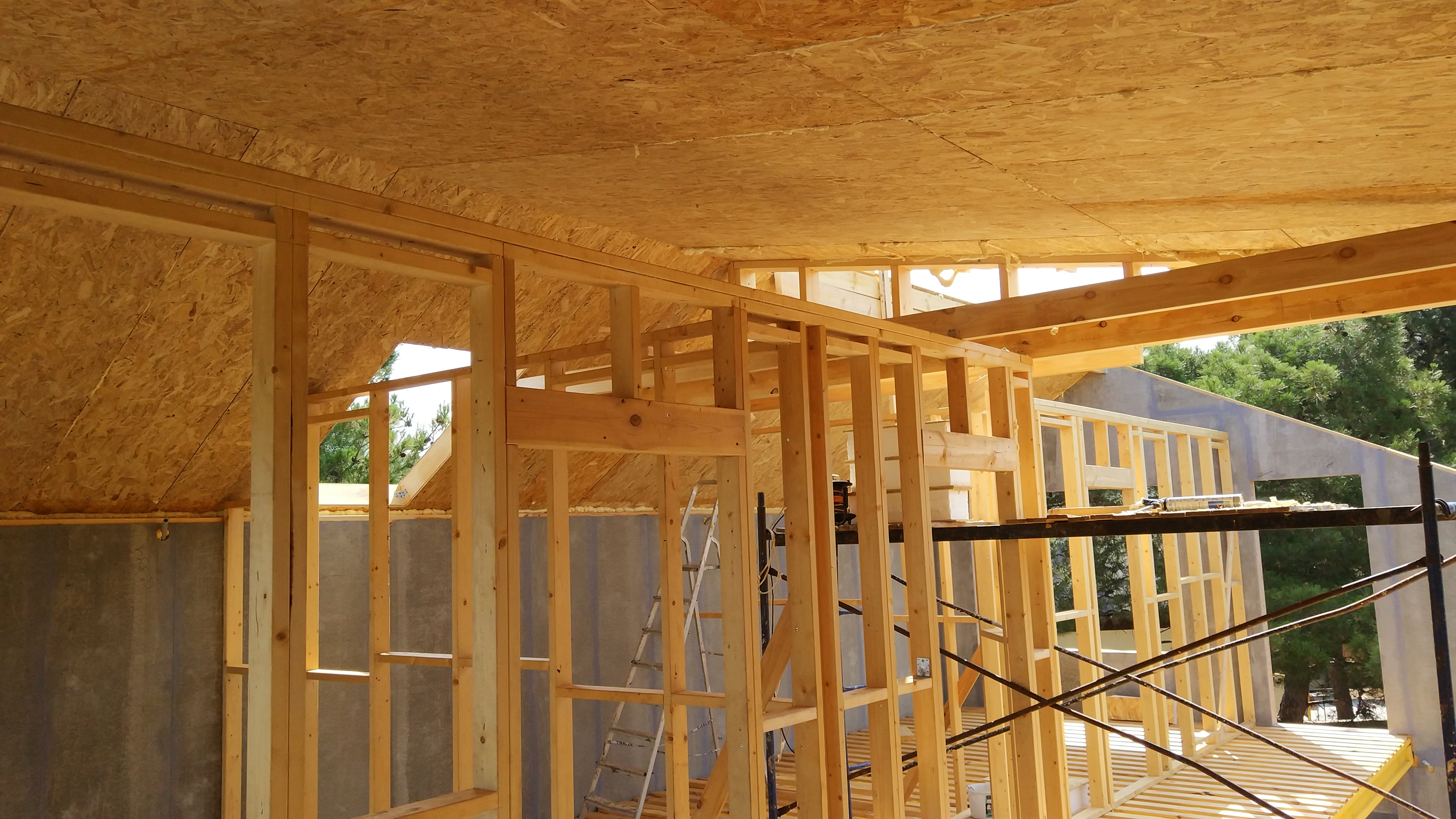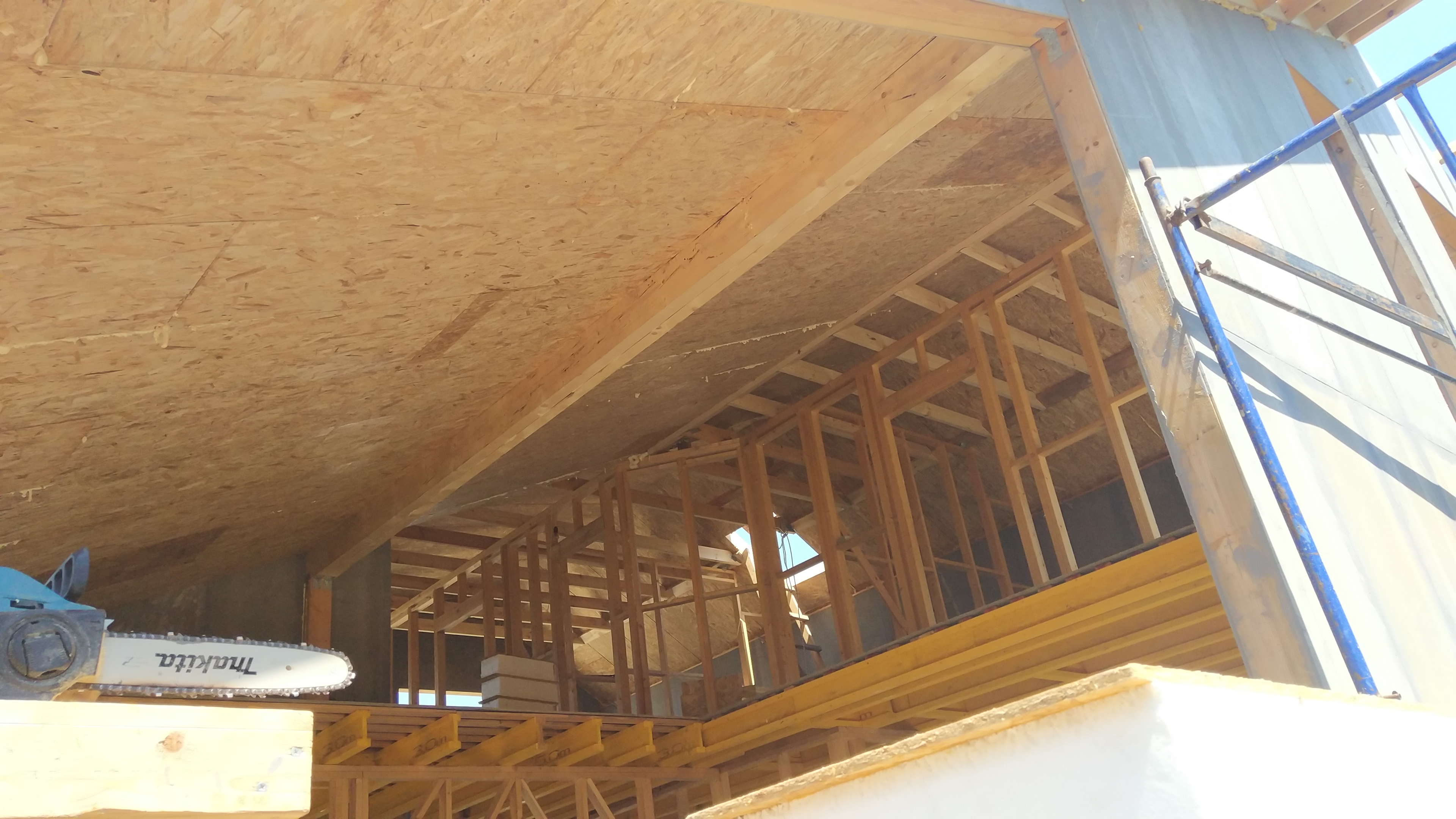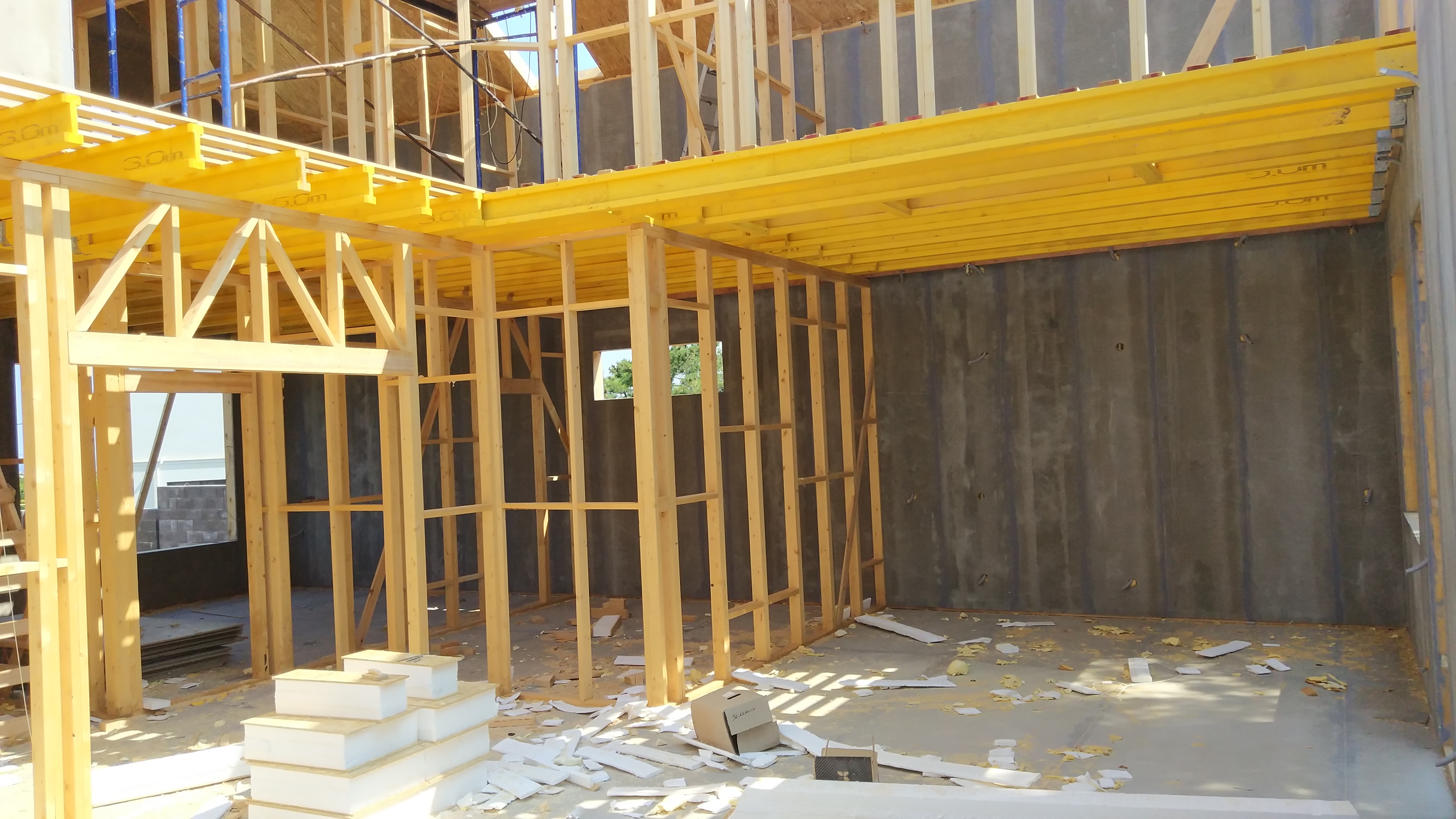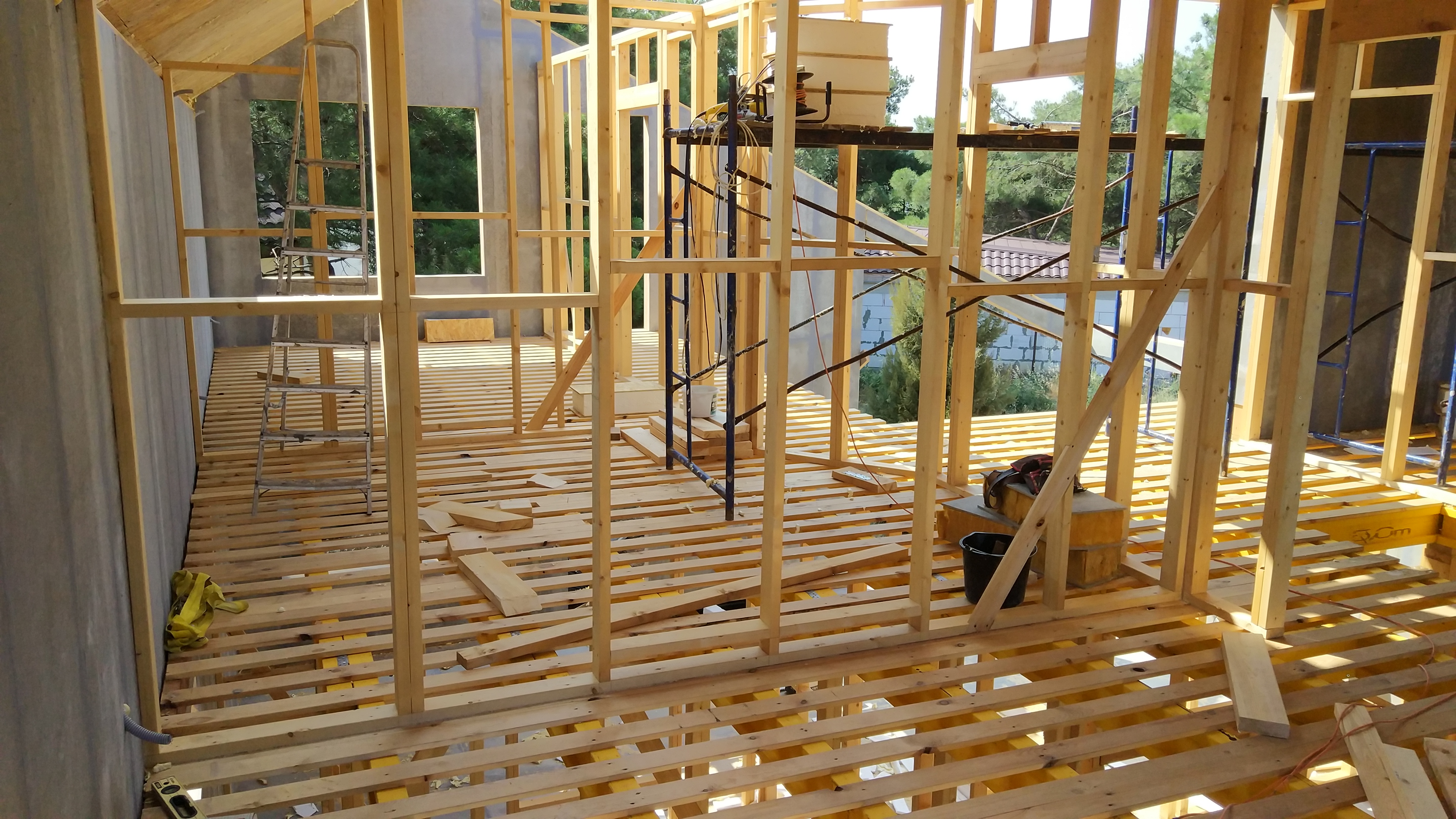 В межэтажных перекрытиях в качестве несущих лаг мы применяем двутавровые балки собственного производства с влагостойкой 24 мм. фанерой в сердечнике.