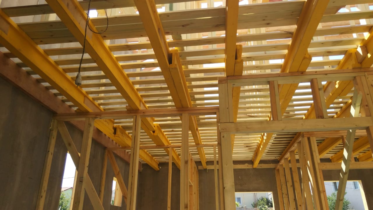 В межэтажных перекрытиях в качестве несущих лаг мы применяем двутавровые балки собственного производства с влагостойкой 24 мм. фанерой в сердечнике.