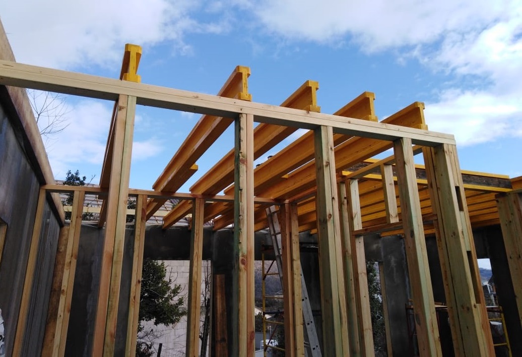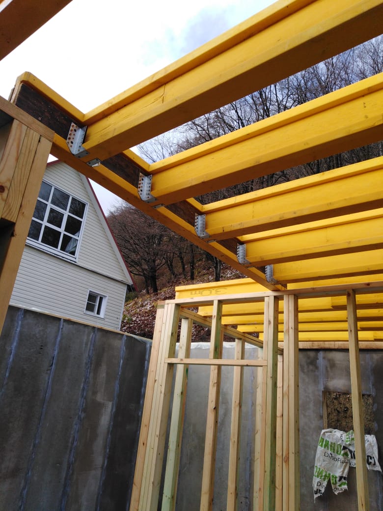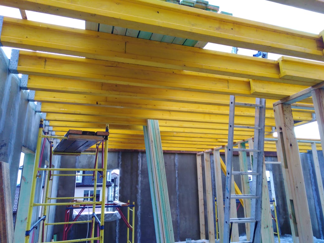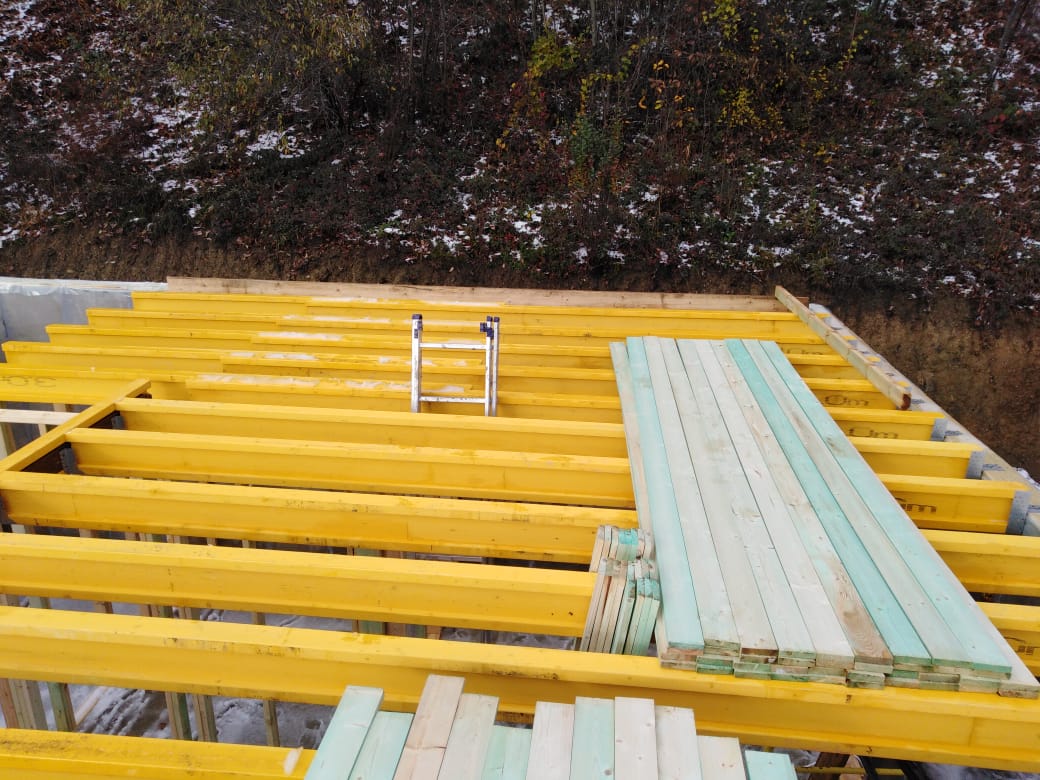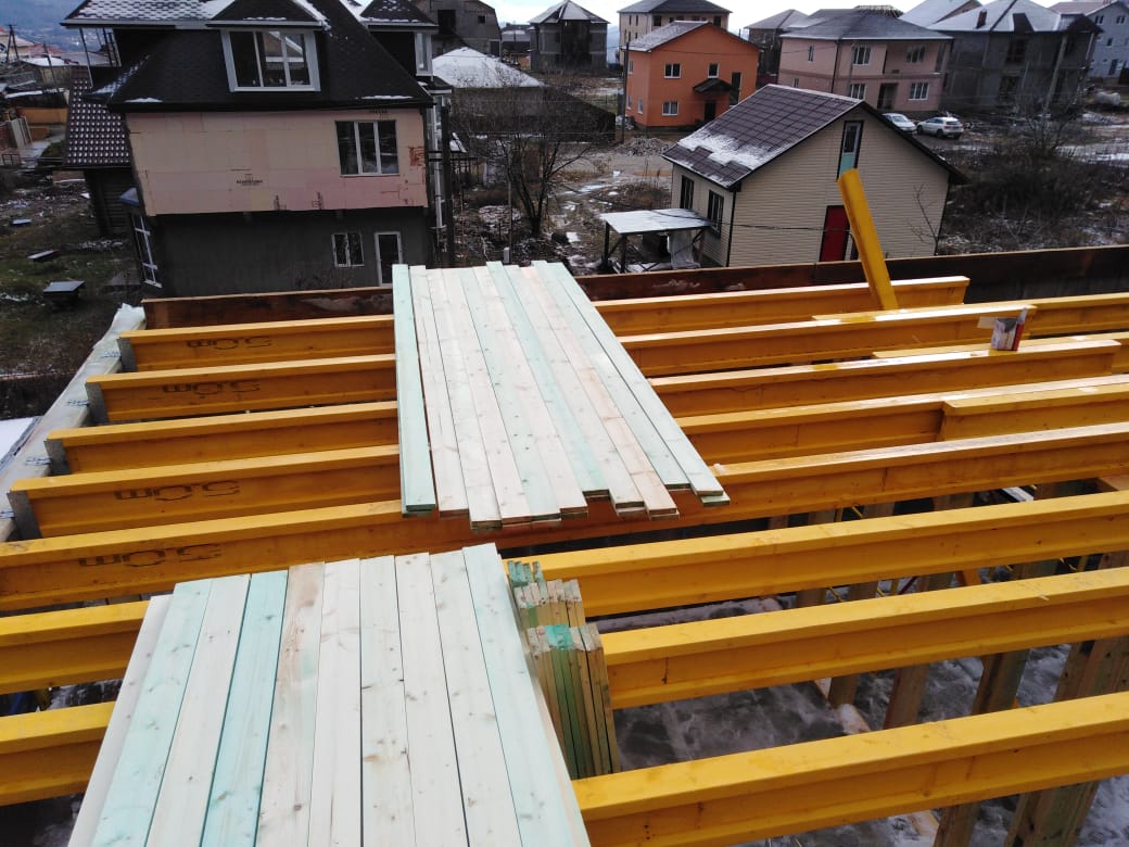 В межэтажных перекрытиях в качестве несущих лаг мы применяем двутавровые балки собственного производства с влагостойкой 24 мм. фанерой в сердечнике.