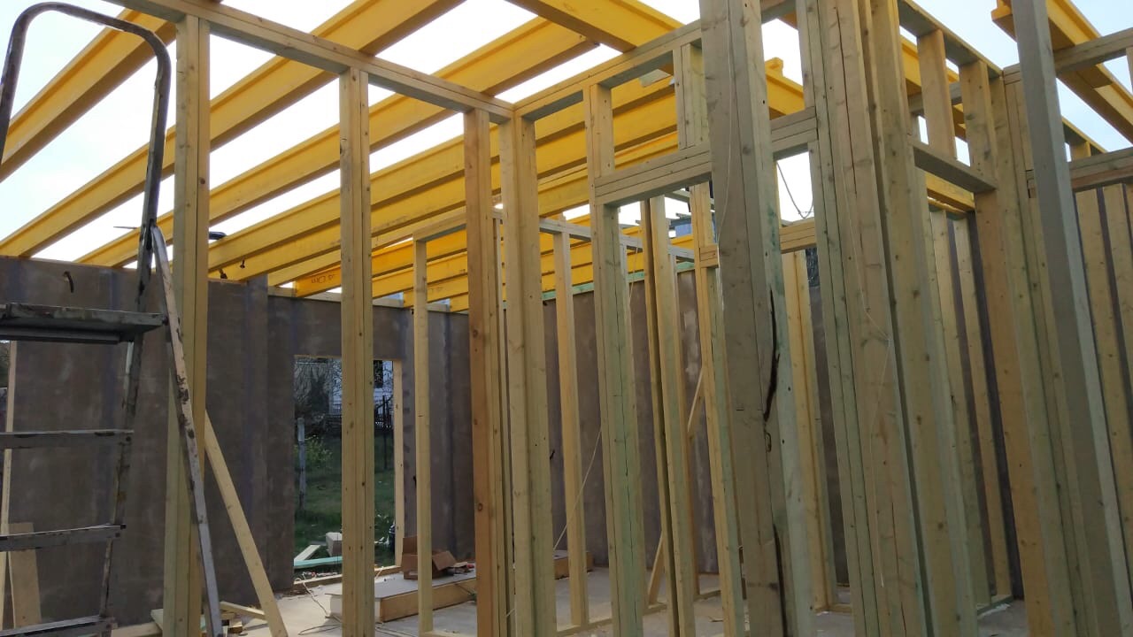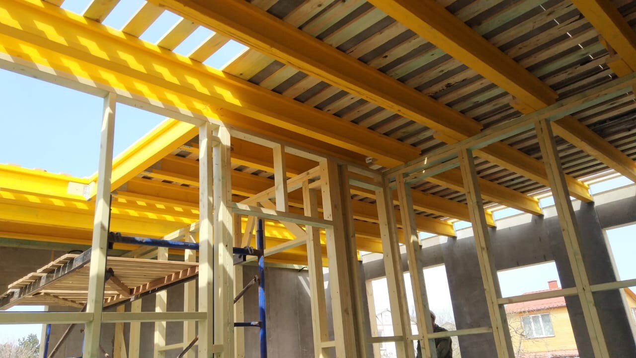 В межэтажных перекрытиях в качестве несущих лаг мы применяем двутавровые балки собственного производства с влагостойкой 24 мм. фанерой в сердечнике.