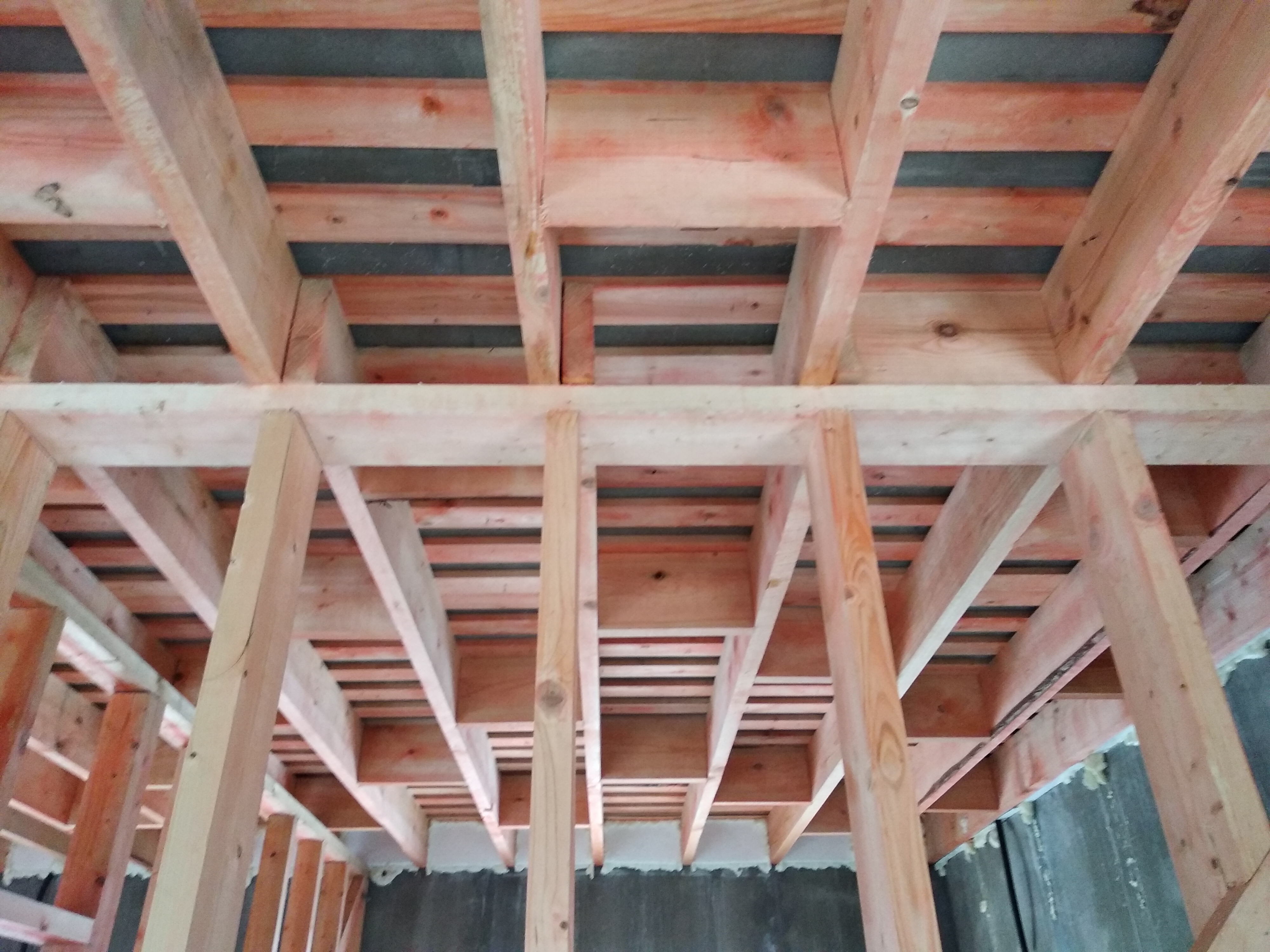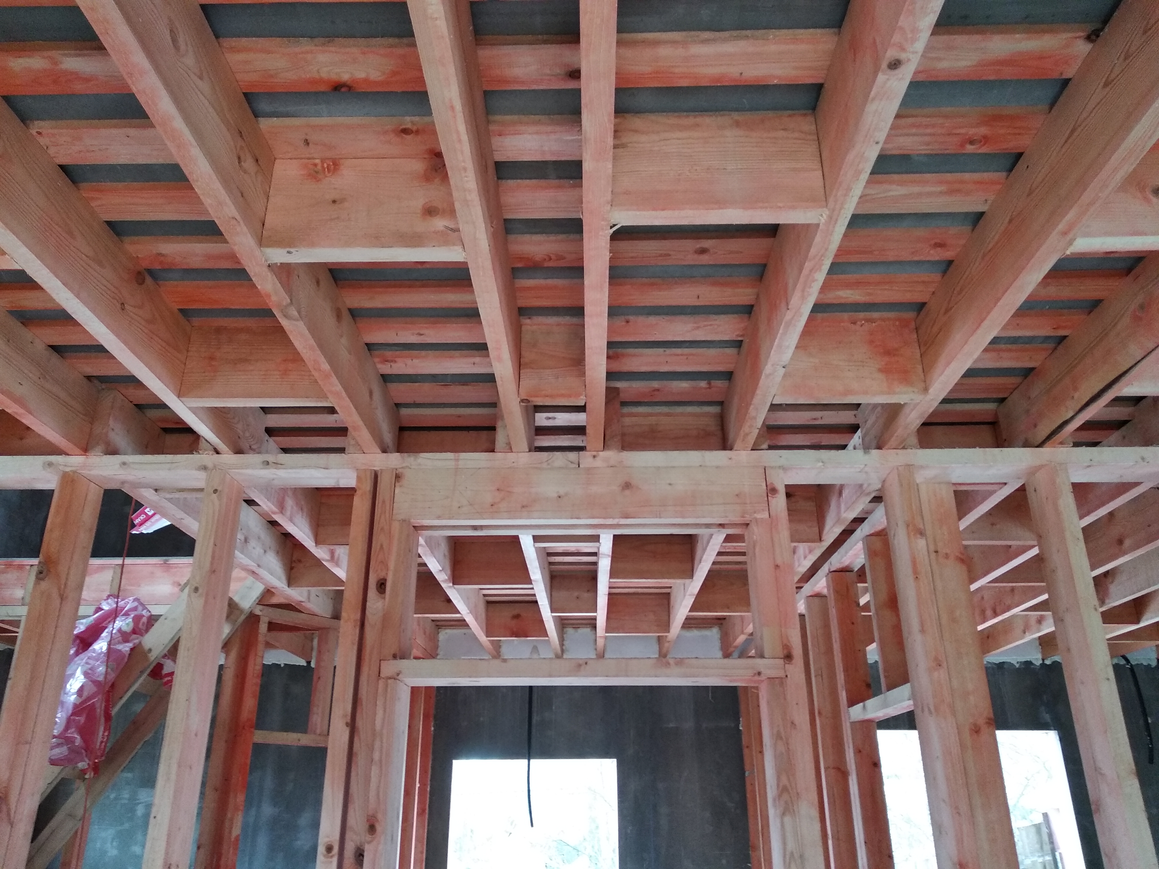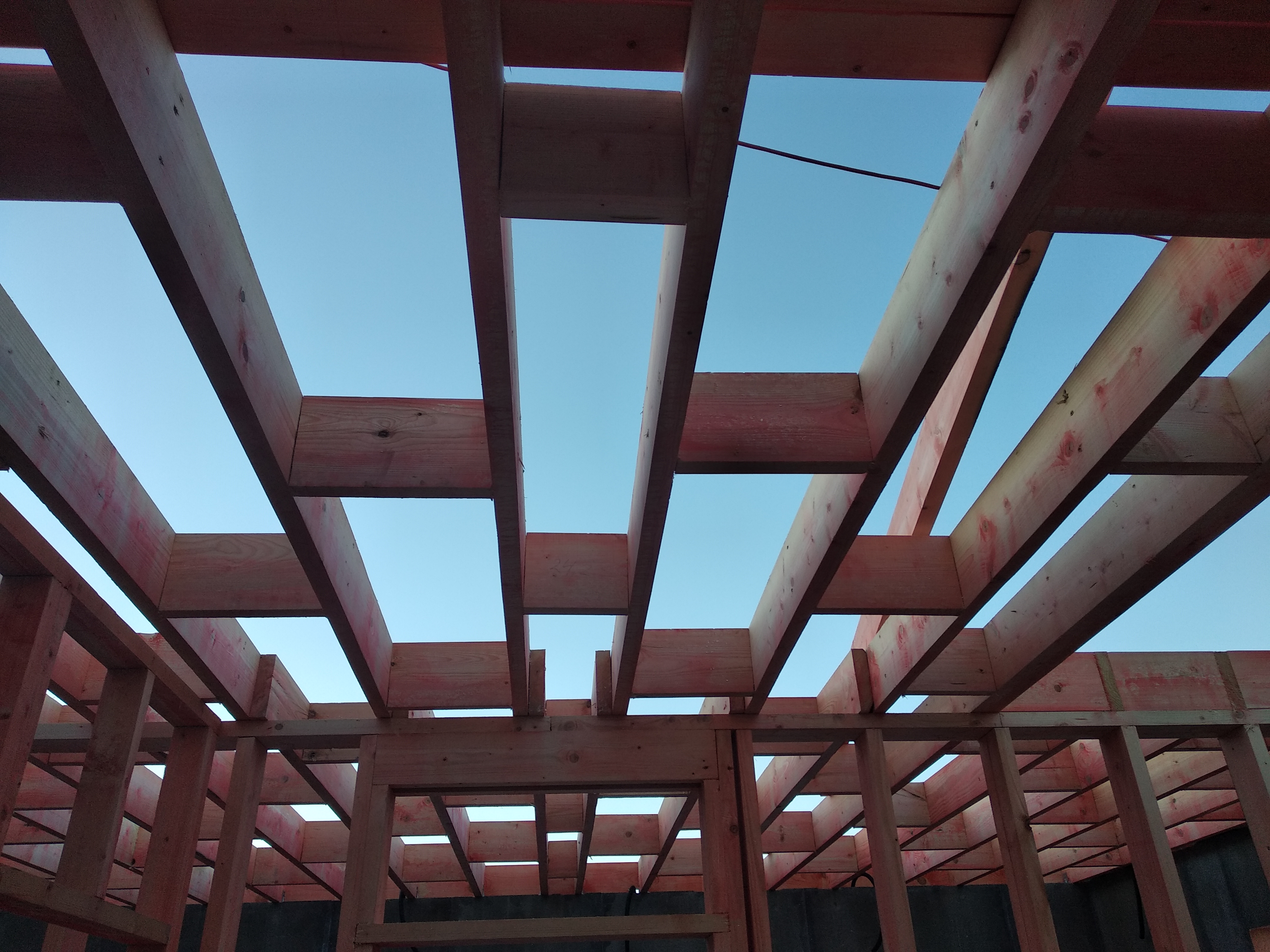 В межэтажных перекрытиях в качестве несущих лаг мы применяем двутавровые балки собственного производства с влагостойкой 24 мм. фанерой в сердечнике.