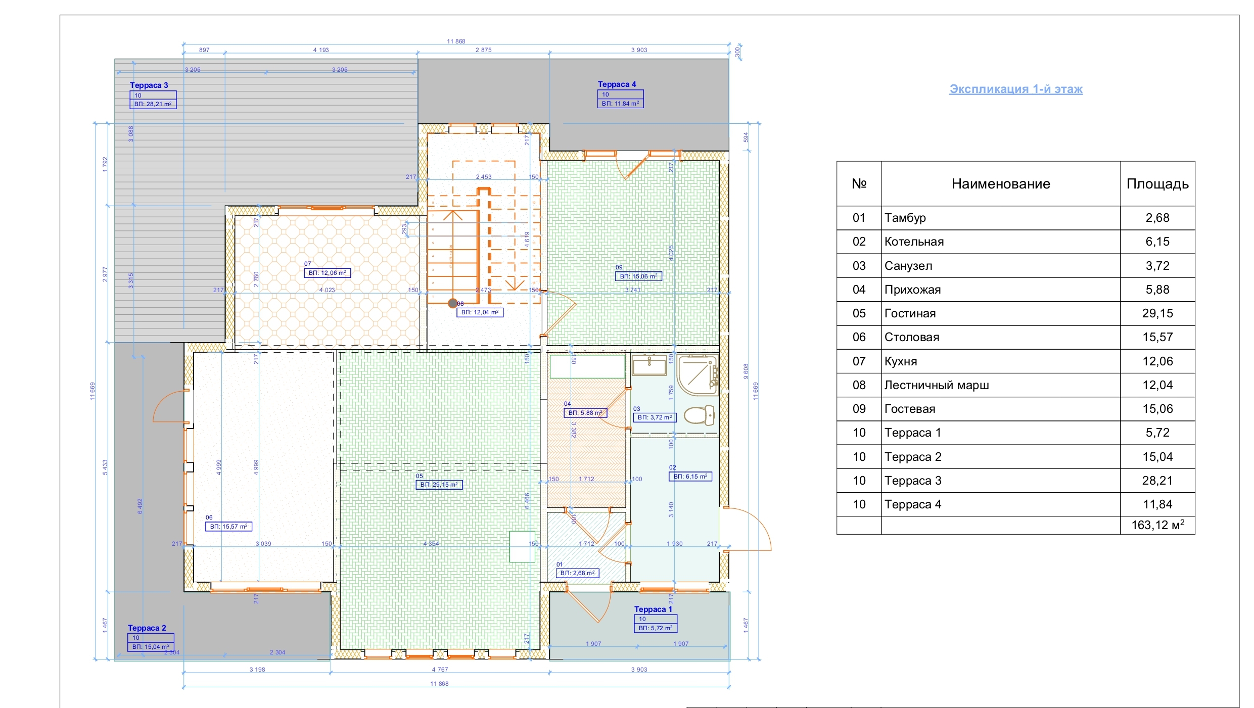Площадь застройки террас: 61 м2