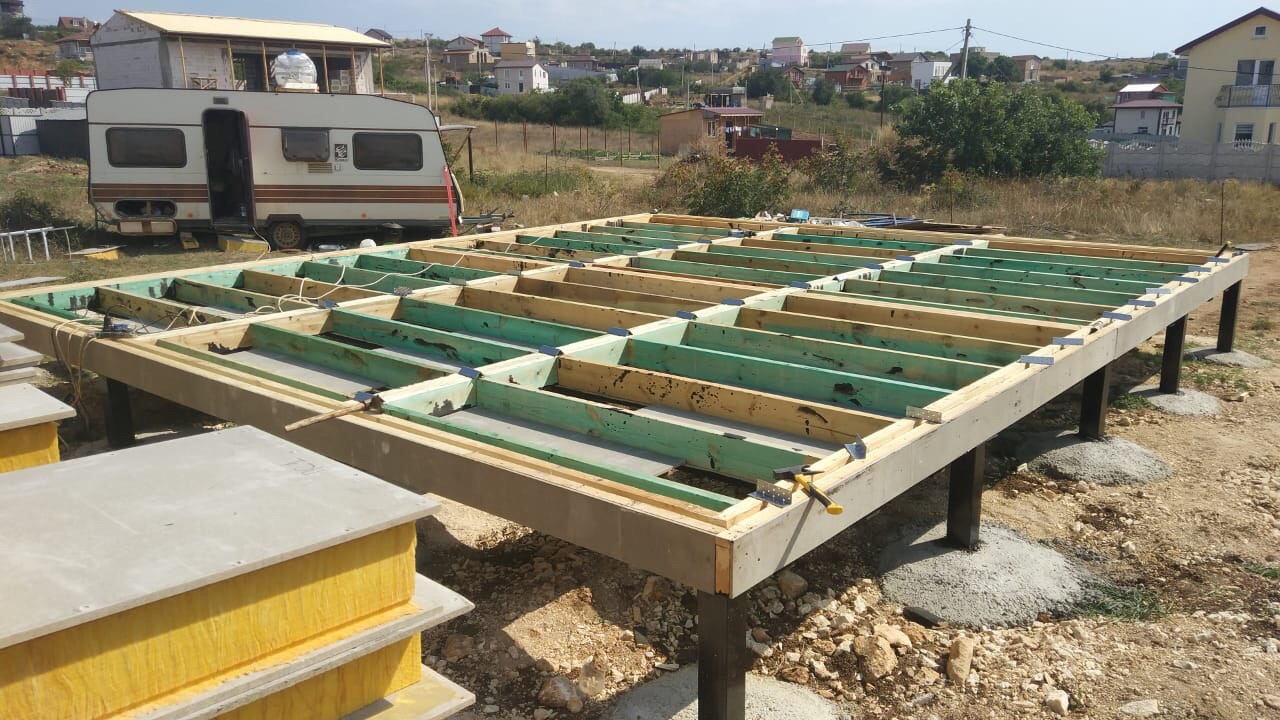 Ростверк изготовлен из калиброванного клееного бруса и защищен снаружи цементно-стружечной плитой