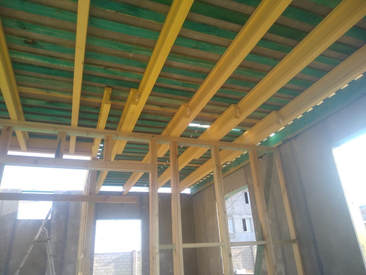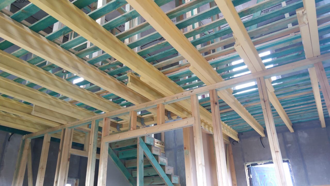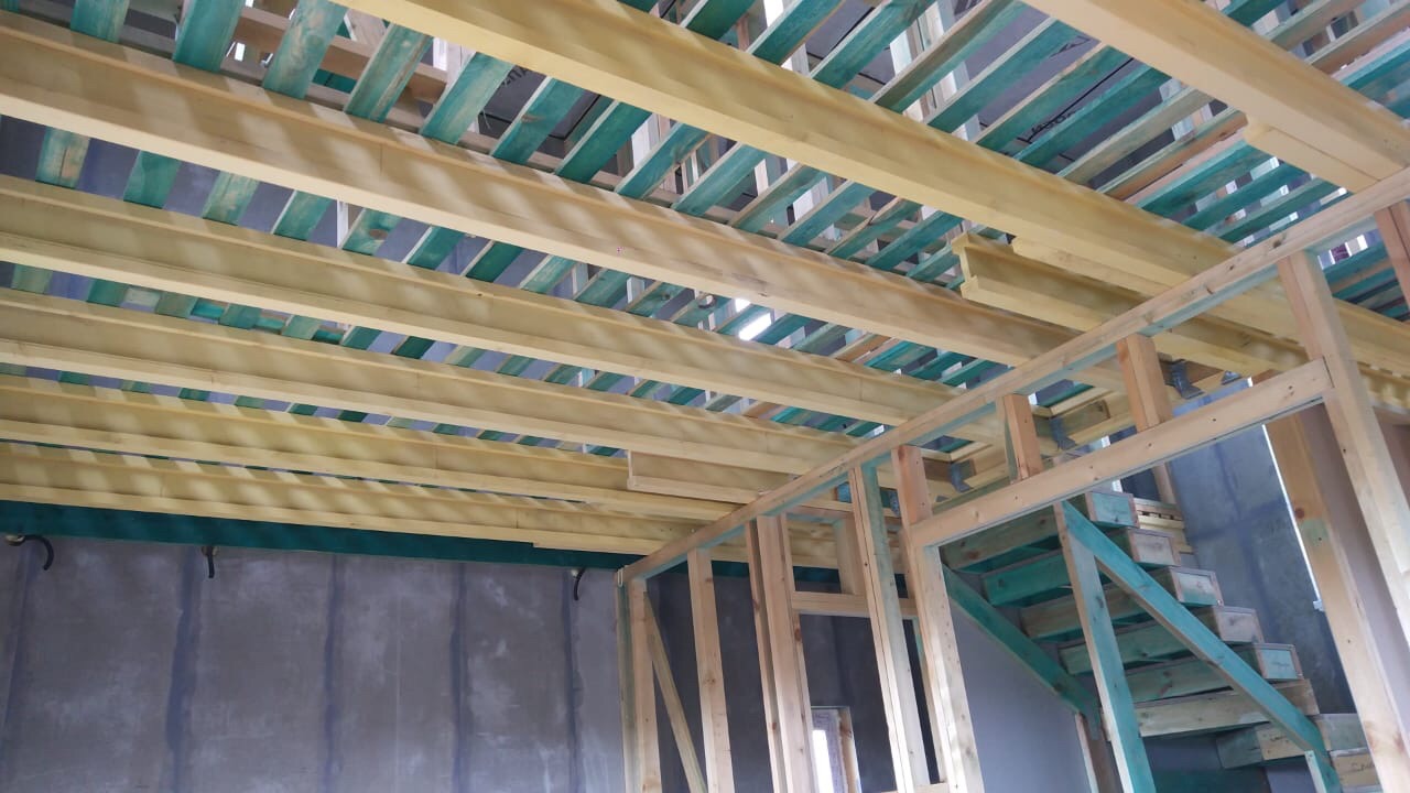 В межэтажных перекрытиях в качестве несущих лаг мы применяем двутавровые балки собственного производства с влагостойкой 24 мм. фанерой в сердечнике.