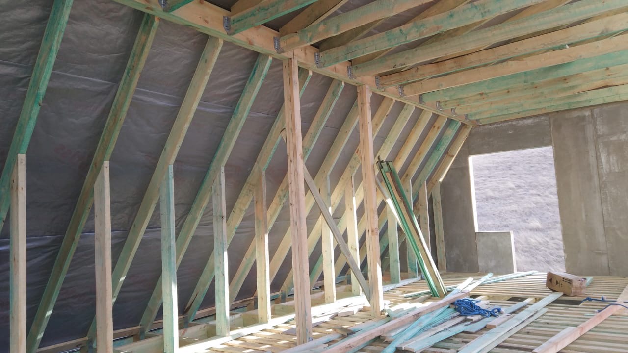 Кровля может быть построена из бруса 150х50мм или SIP панелей. В качестве кровельного материала можно использовать: металлочерепицу, битумную и керамическую черепицу. Также производим кровельные шовные сэндвич-панели.