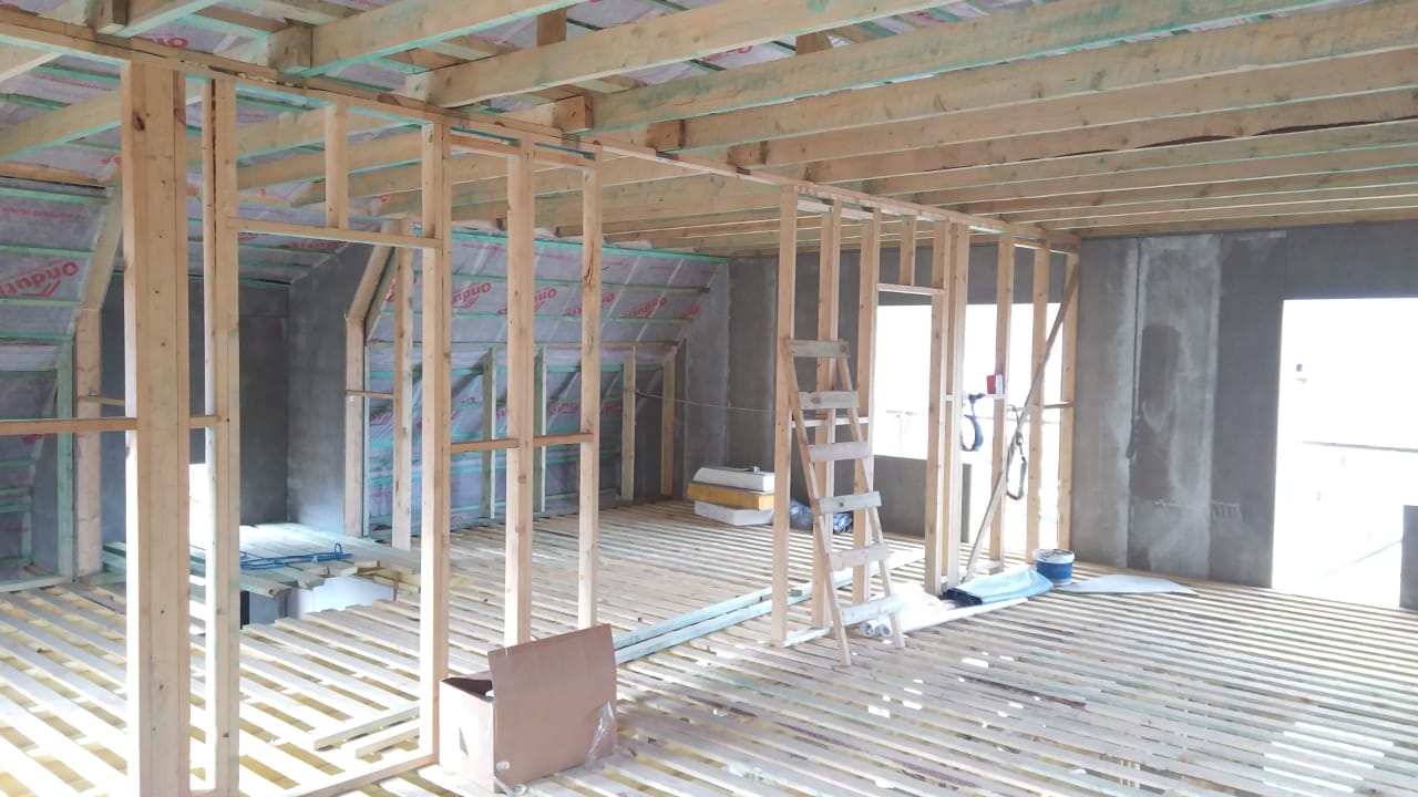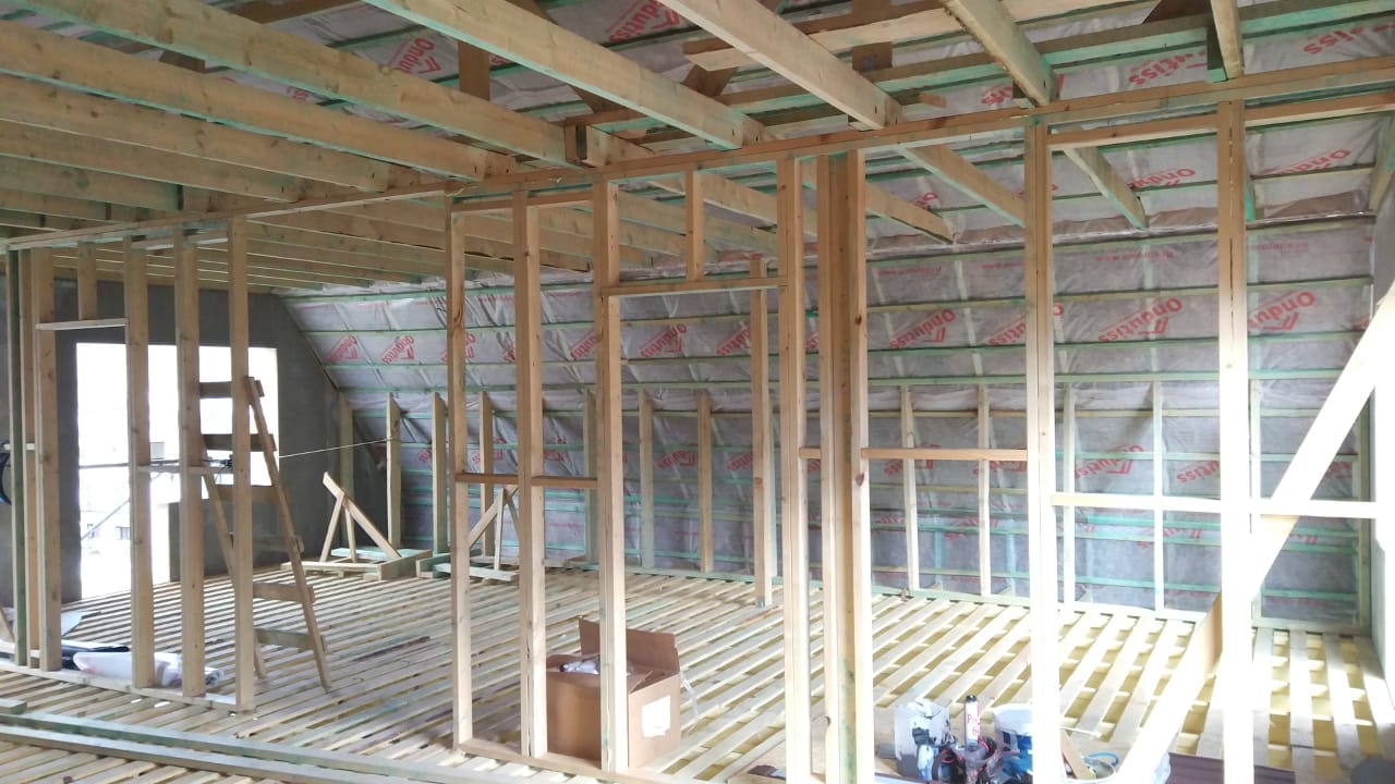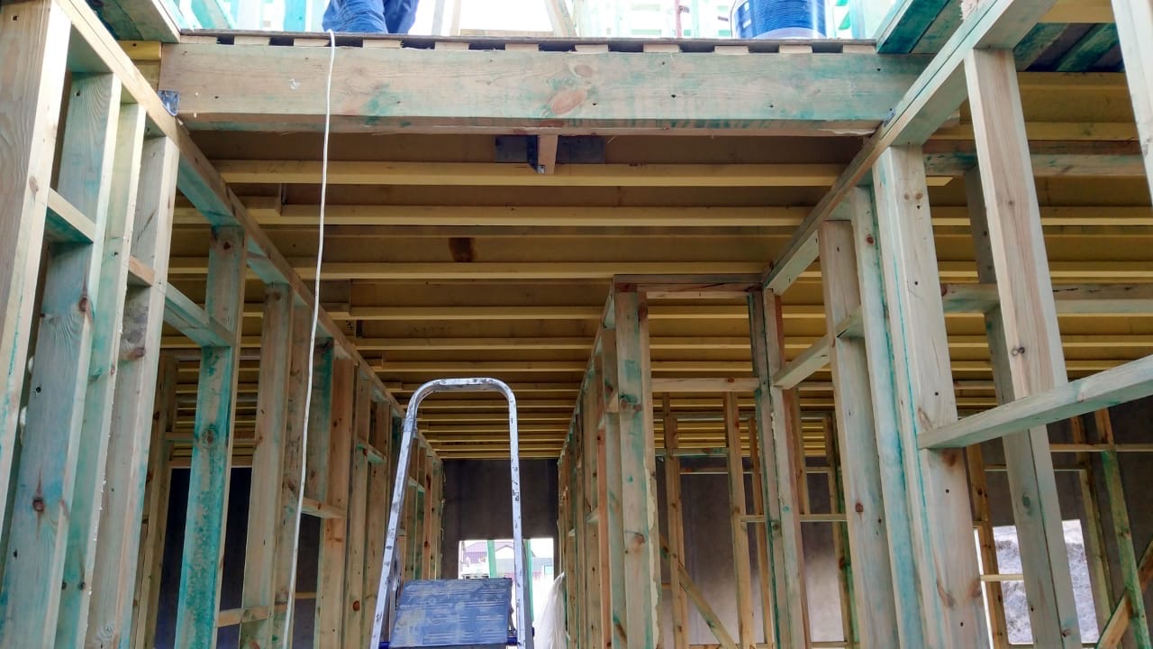 В межэтажных перекрытиях в качестве несущих лаг мы применяем двутавровые балки собственного производства с влагостойкой 24 мм. фанерой в сердечнике.
