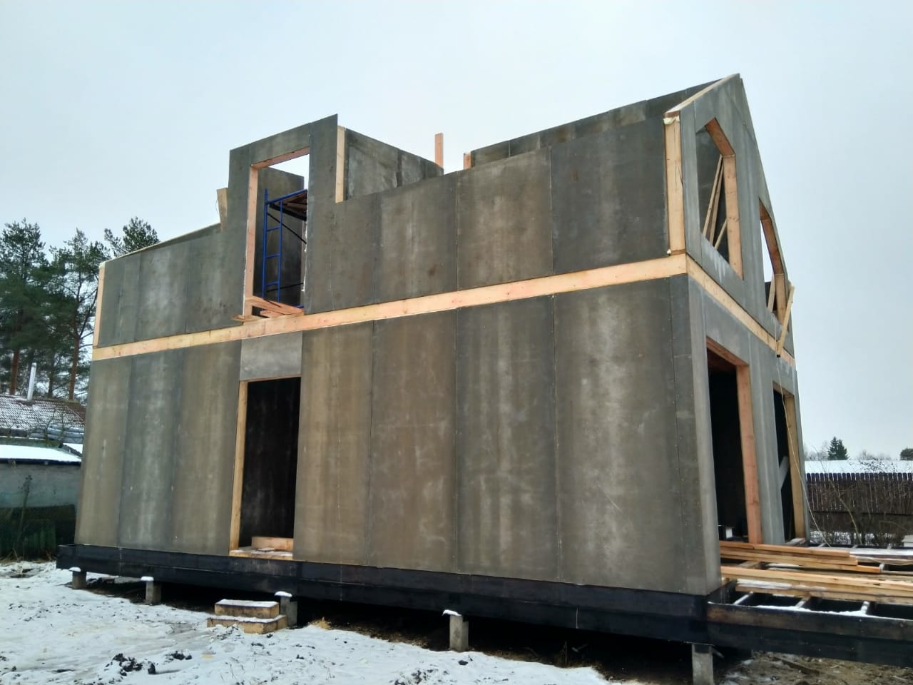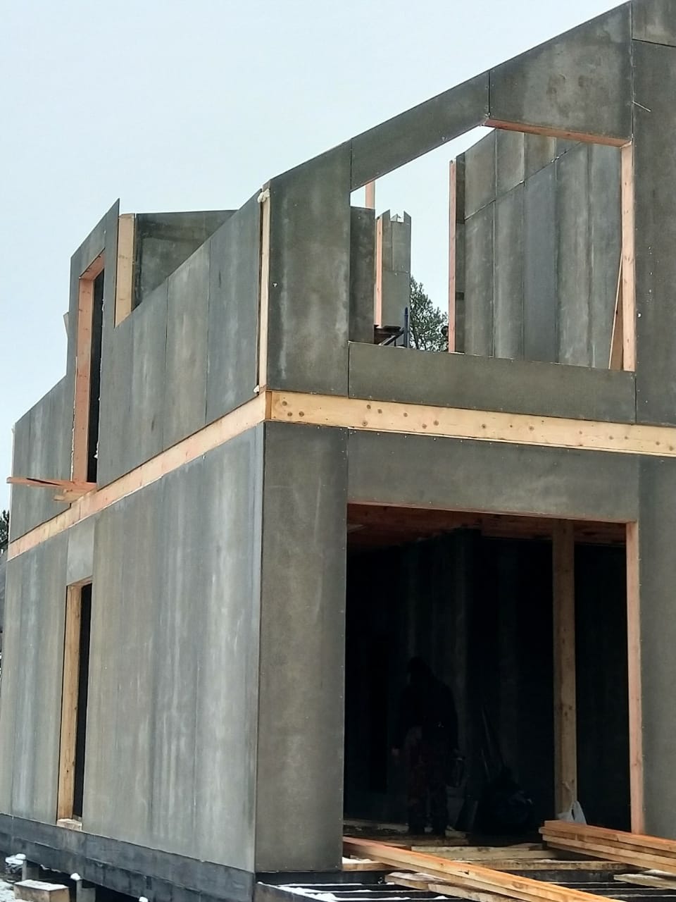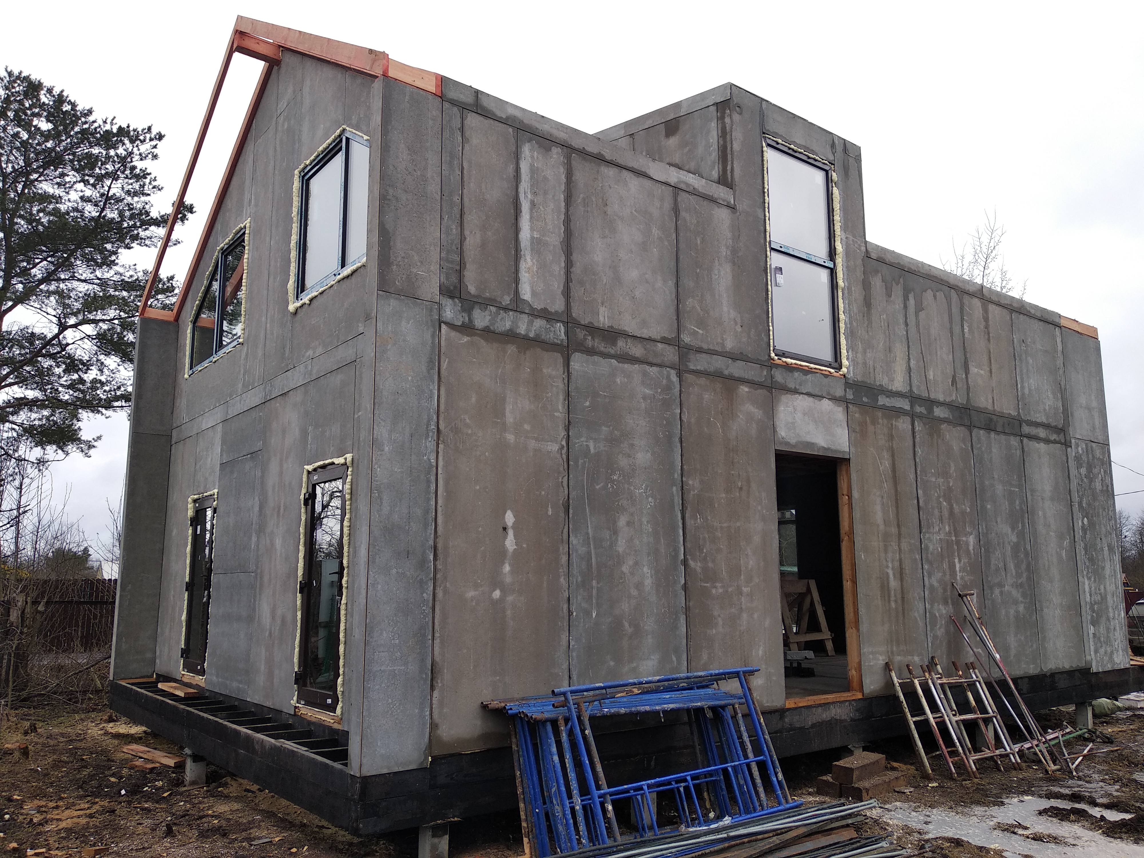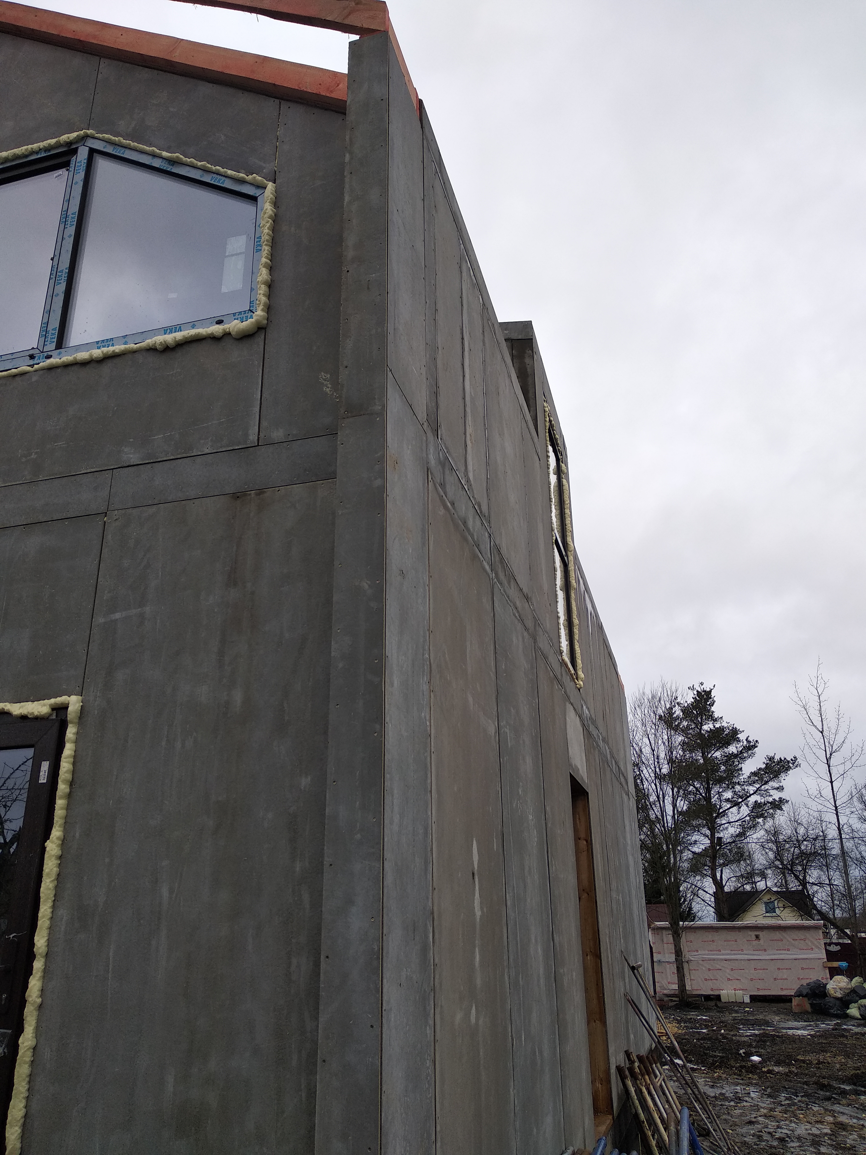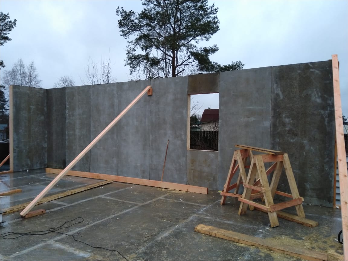 Все стены, как внешние, так и внутренние выполнены из СИП панелей с ЦСП высотой 3,0 м, поэтому стены 1-го этажа имеют высоту 3,0 м, а стены 2-го мансардного этажа от 1,5 м в нижней точке ската до 4,0 м в коньке.