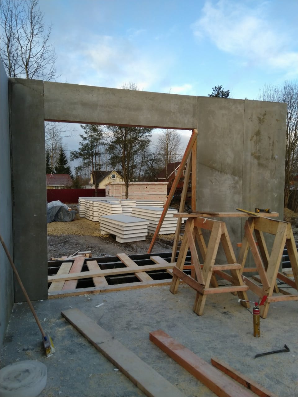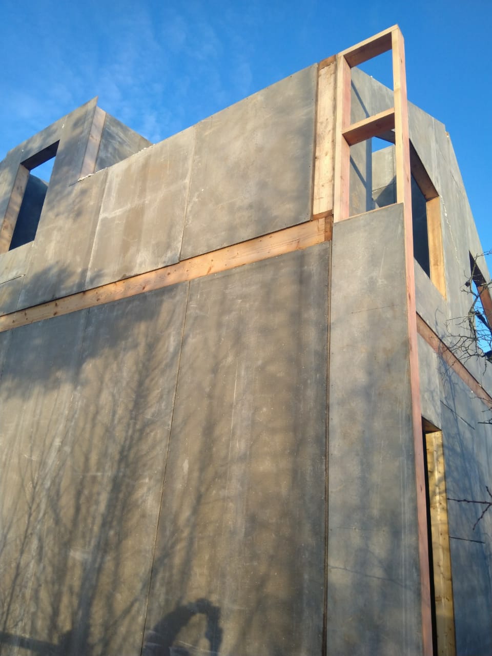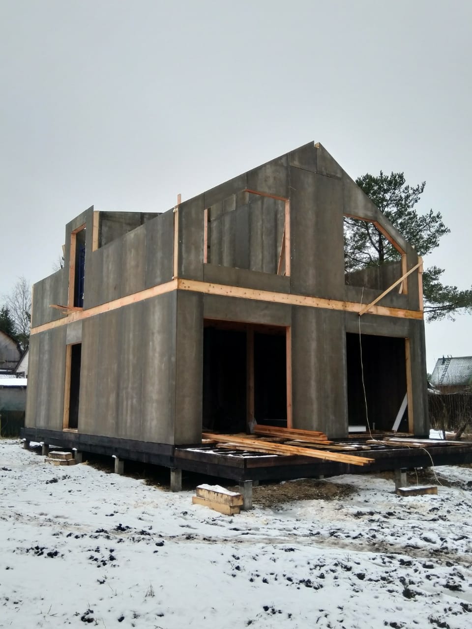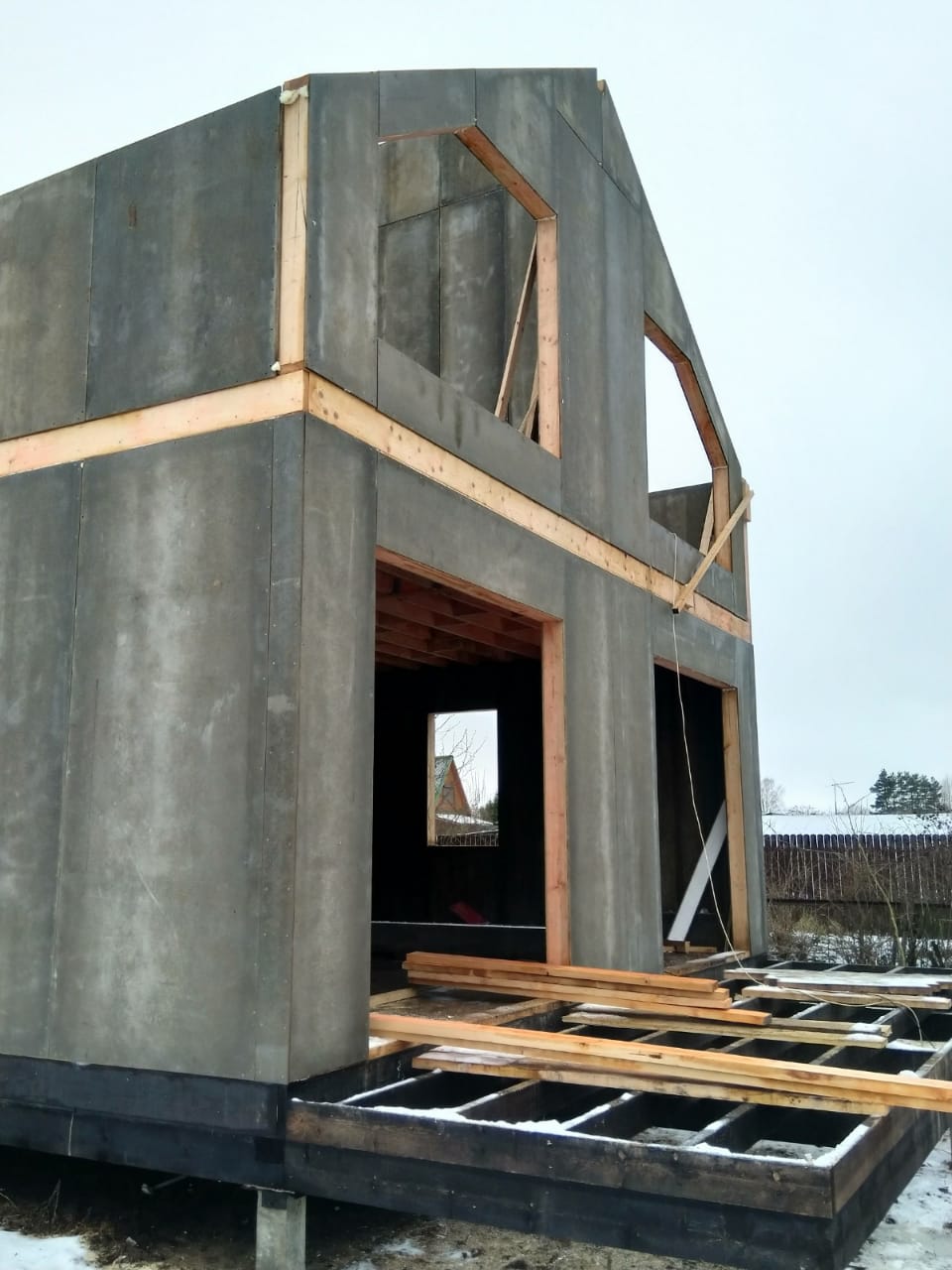 Все стены, как внешние, так и внутренние выполнены из СИП панелей с ЦСП высотой 3,0 м, поэтому стены 1-го этажа имеют высоту 3,0 м, а стены 2-го мансардного этажа от 1,5 м в нижней точке ската до 4,0 м в коньке.
