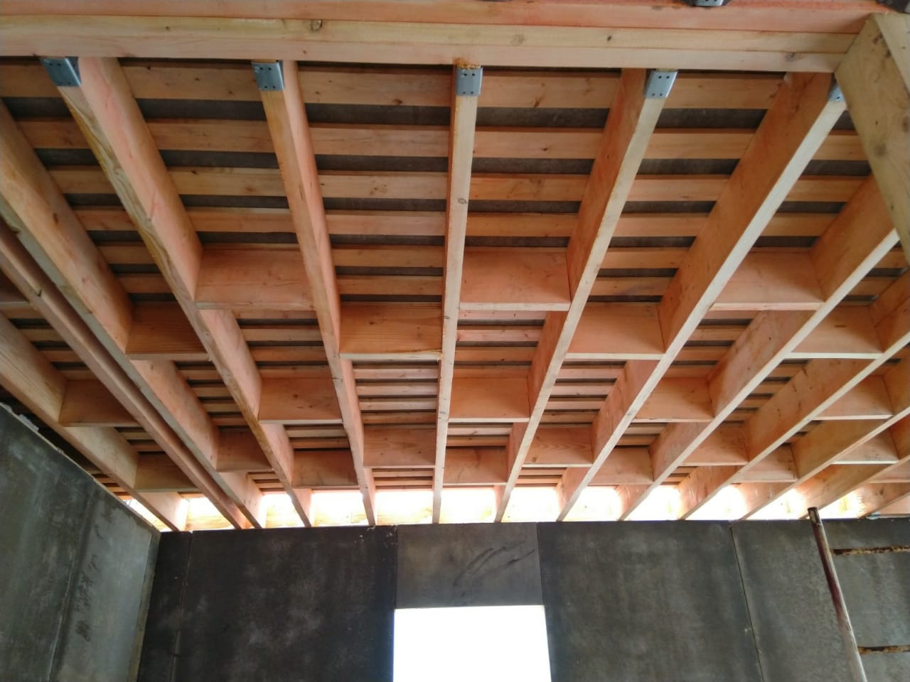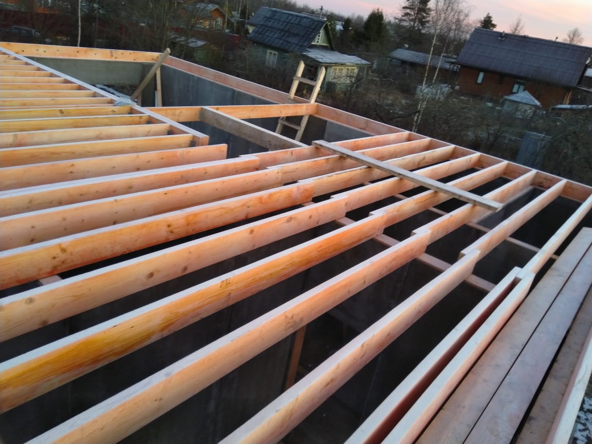 В межэтажных перекрытиях в качестве несущих лаг мы применяем двутавровые балки собственного производства с влагостойкой 24 мм. фанерой в сердечнике.