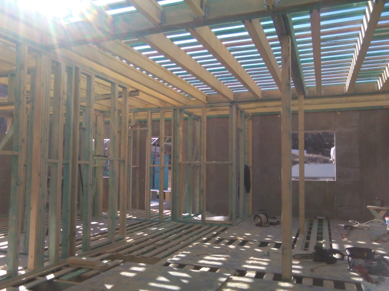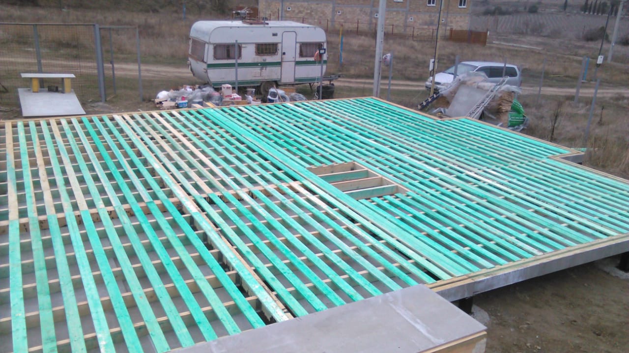 В межэтажных перекрытиях в качестве несущих лаг мы применяем двутавровые балки собственного производства с влагостойкой 24 мм. фанерой в сердечнике.