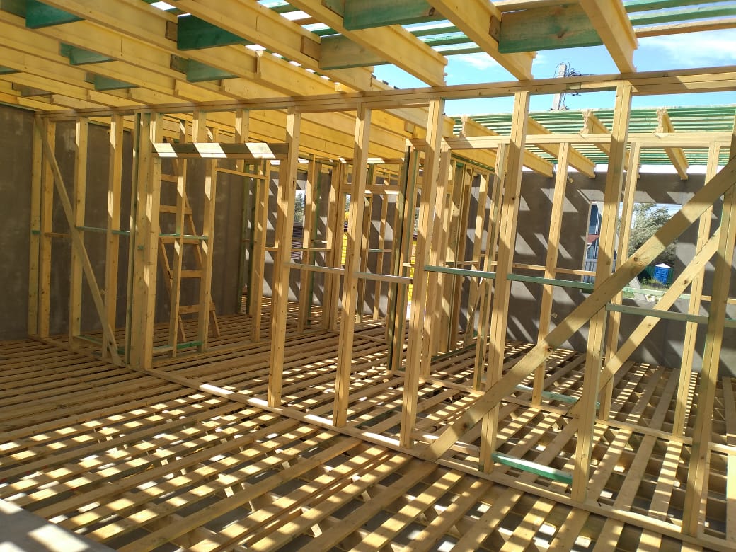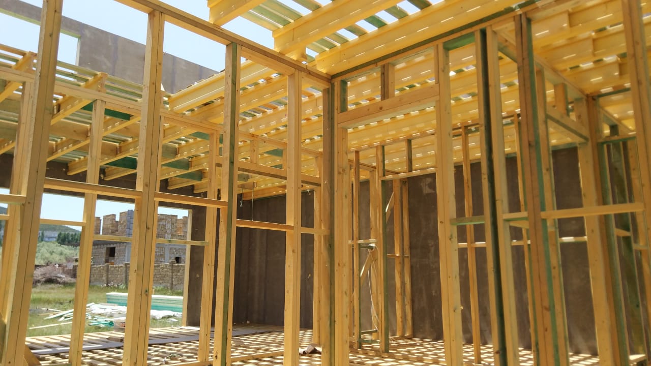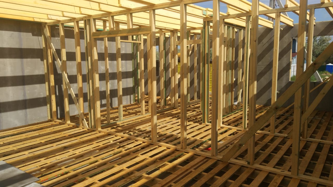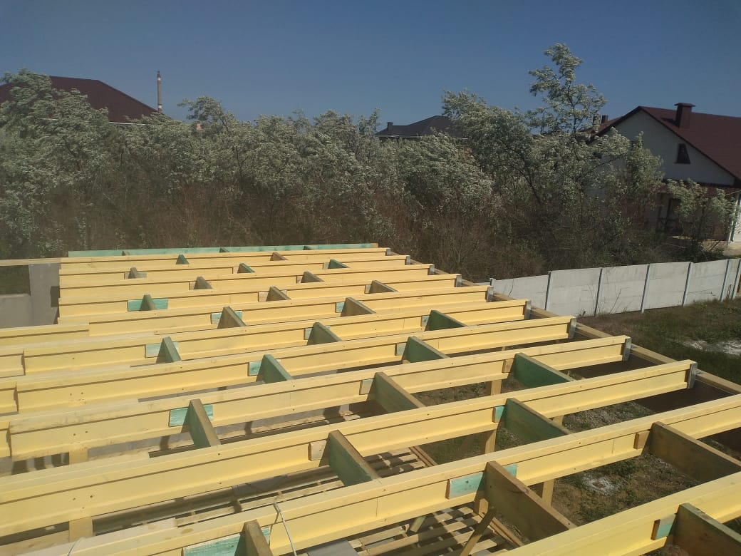 В межэтажных перекрытиях в качестве несущих лаг мы применяем двутавровые балки собственного производства с влагостойкой 24 мм. фанерой в сердечнике.