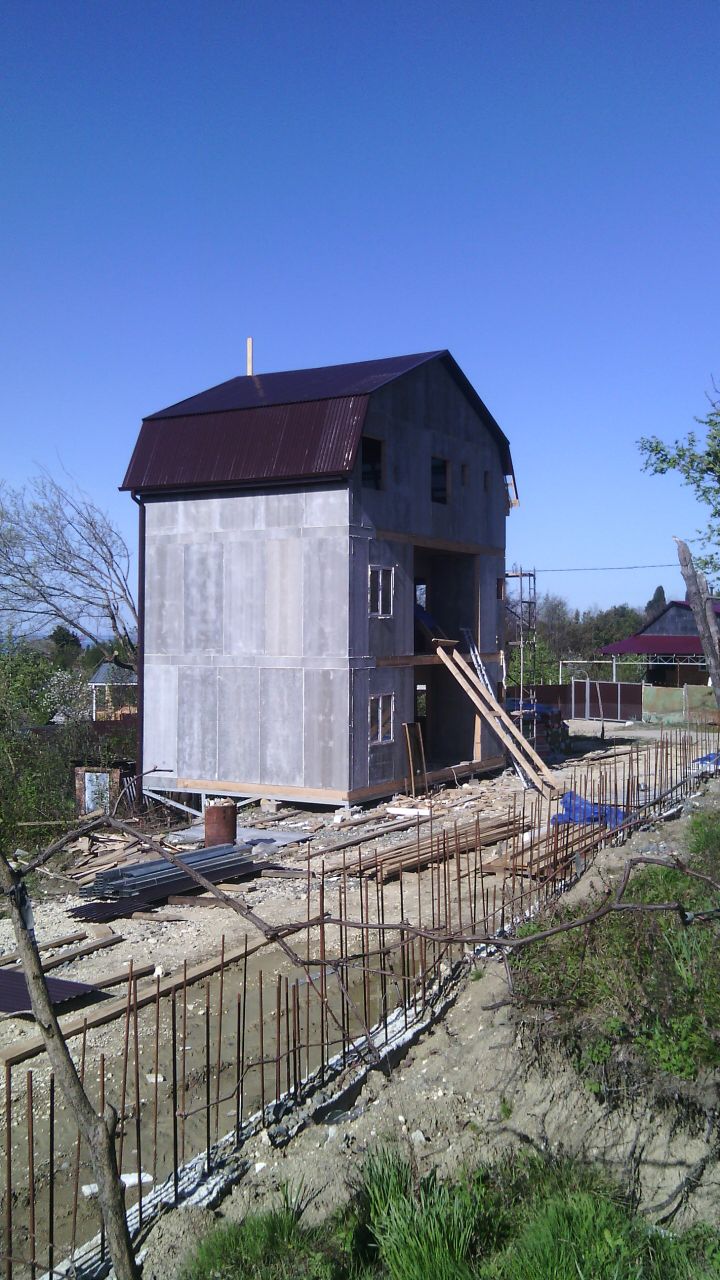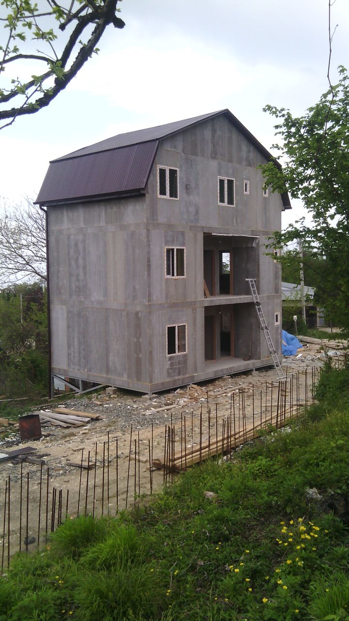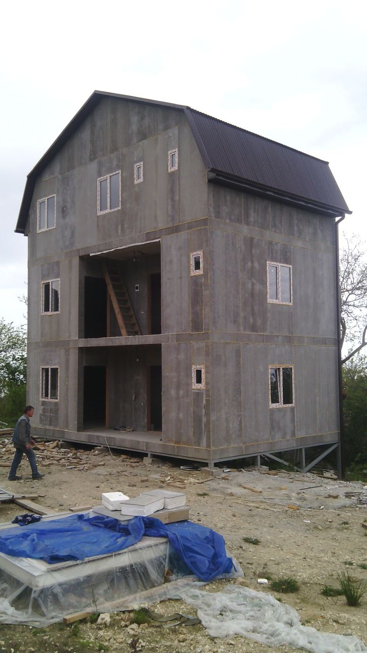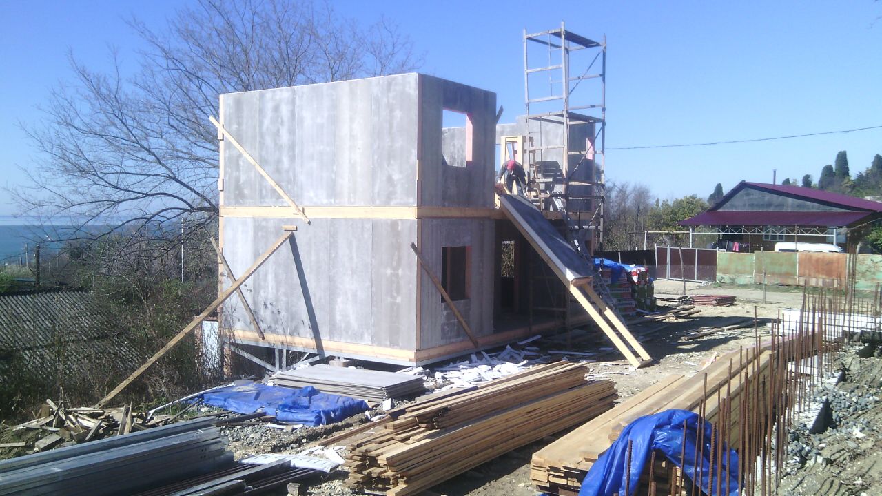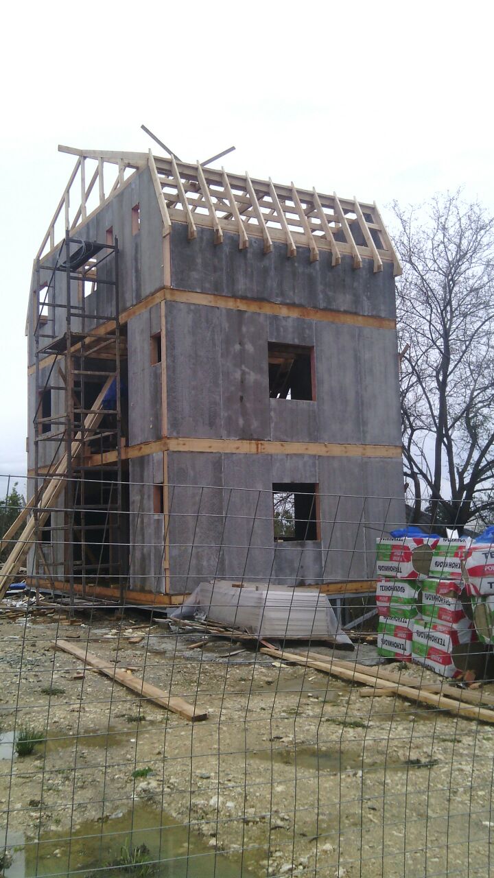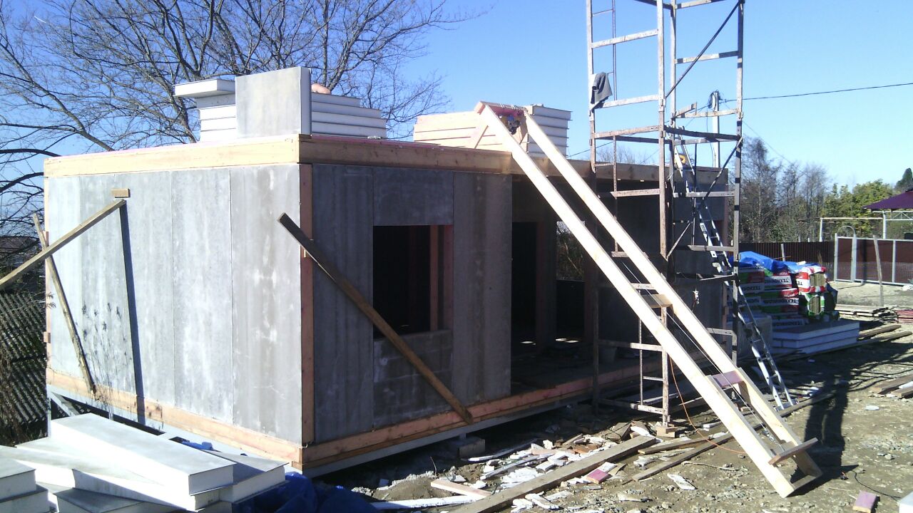 из СИП панелей из ЦСП размером 2700*1200*168 мм с антисептированным калиброванным пиломатериалом камерной сушки (46*140 мм). Монтаж каркасов несущих перегородок из пиломатериала 38*89 мм (76*89 мм).