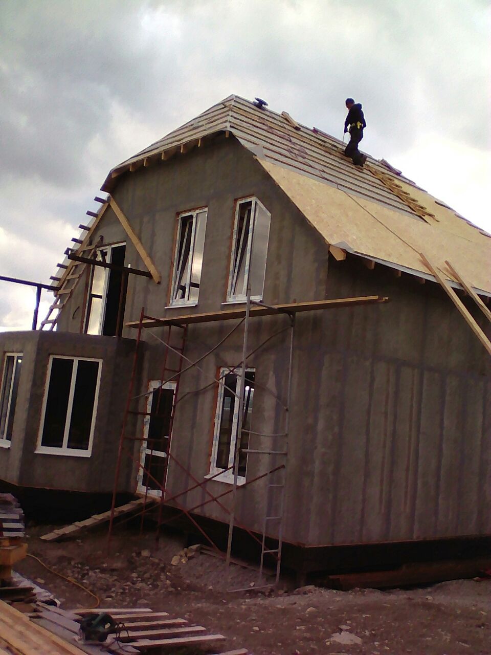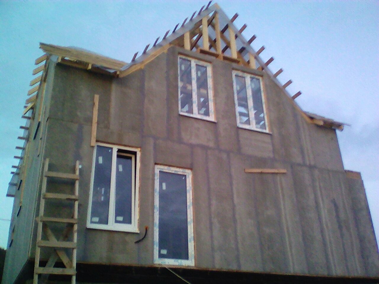 из СИП панелей из ЦСП размером 2700*1200*168 мм с антисептированным калиброванным пиломатериалом камерной сушки (46*140 мм). Монтаж каркасов несущих перегородок из пиломатериала 38*89 мм (76*89 мм).