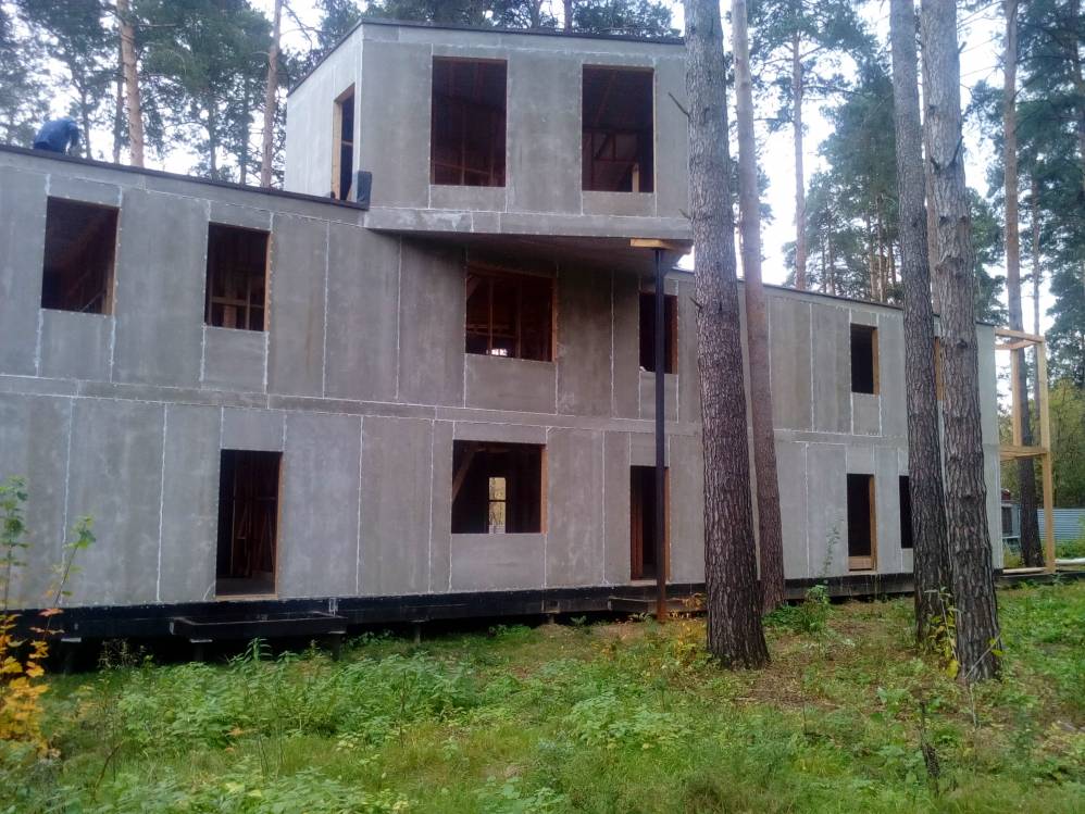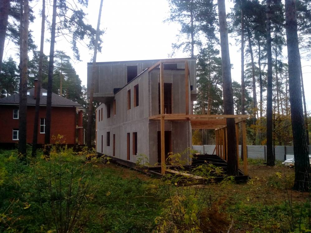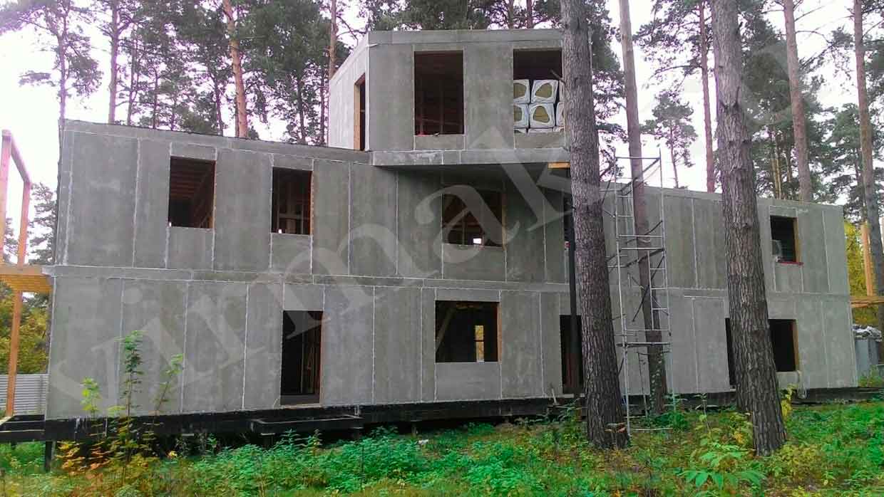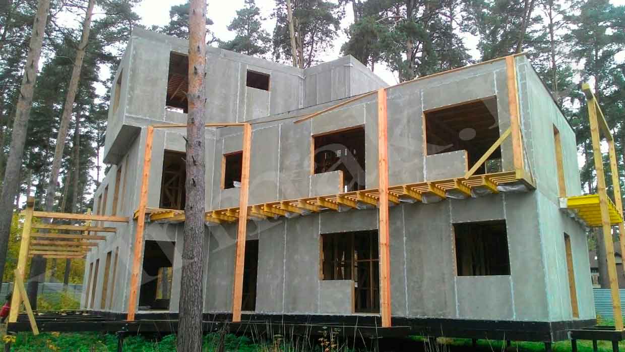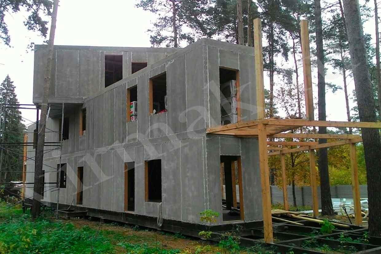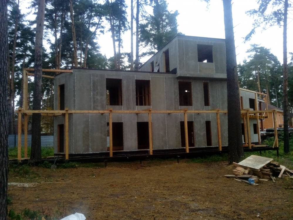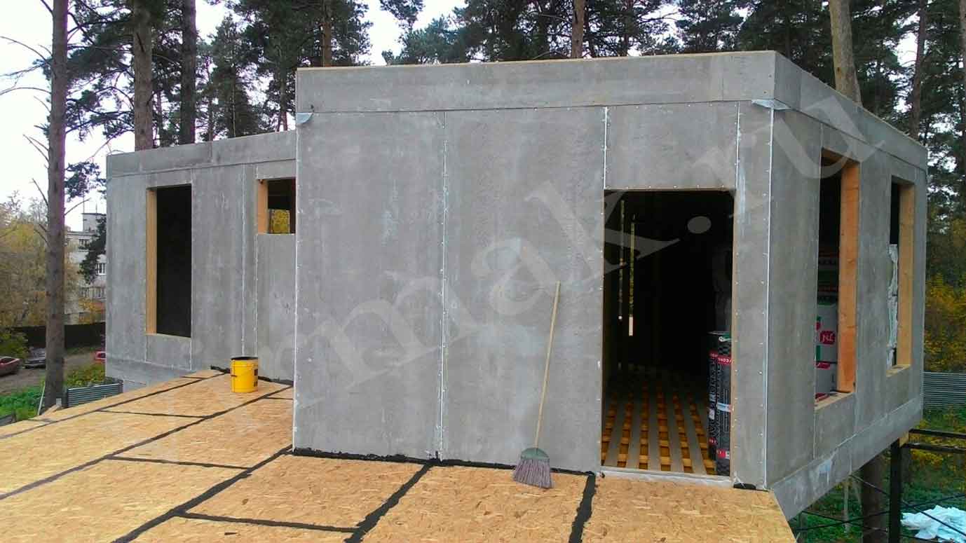 из СИП панелей из ЦСП размером 2700*1200*168 мм с антисептированным калиброванным пиломатериалом камерной сушки (46*140 мм). Монтаж каркасов несущих перегородок из пиломатериала 38*89 мм (76*89 мм).