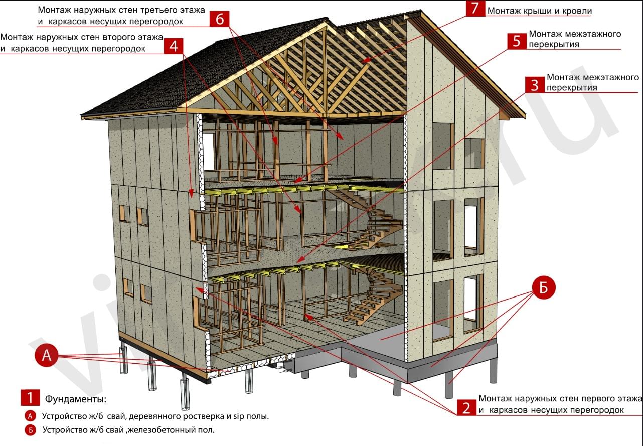 из СИП панелей из ЦСП размером 2700*1200*168 мм с антисептированным калиброванным пиломатериалом камерной сушки (46*140 мм). Монтаж каркасов несущих перегородок из пиломатериала 38*89 мм (76*89 мм).