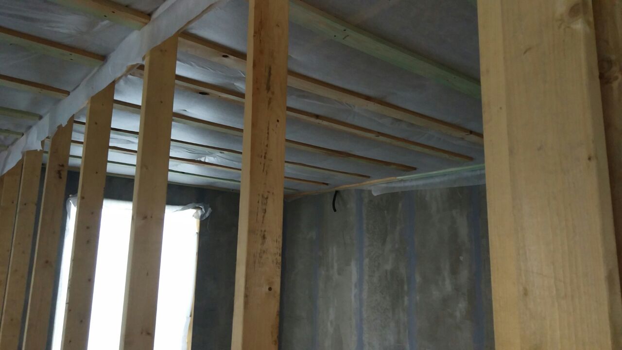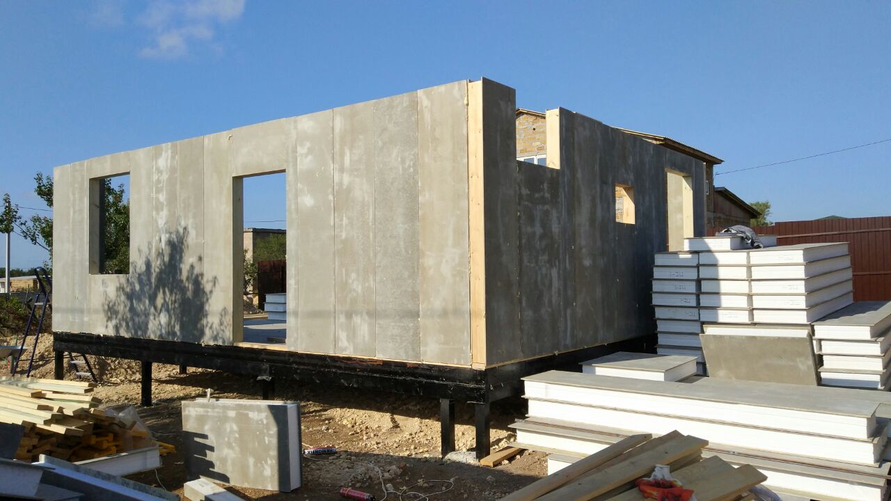 из СИП панелей из ЦСП размером 2700*1200*168 мм с антисептированным калиброванным пиломатериалом камерной сушки (46*140 мм). Монтаж каркасов несущих перегородок из пиломатериала 38*89 мм (76*89 мм).