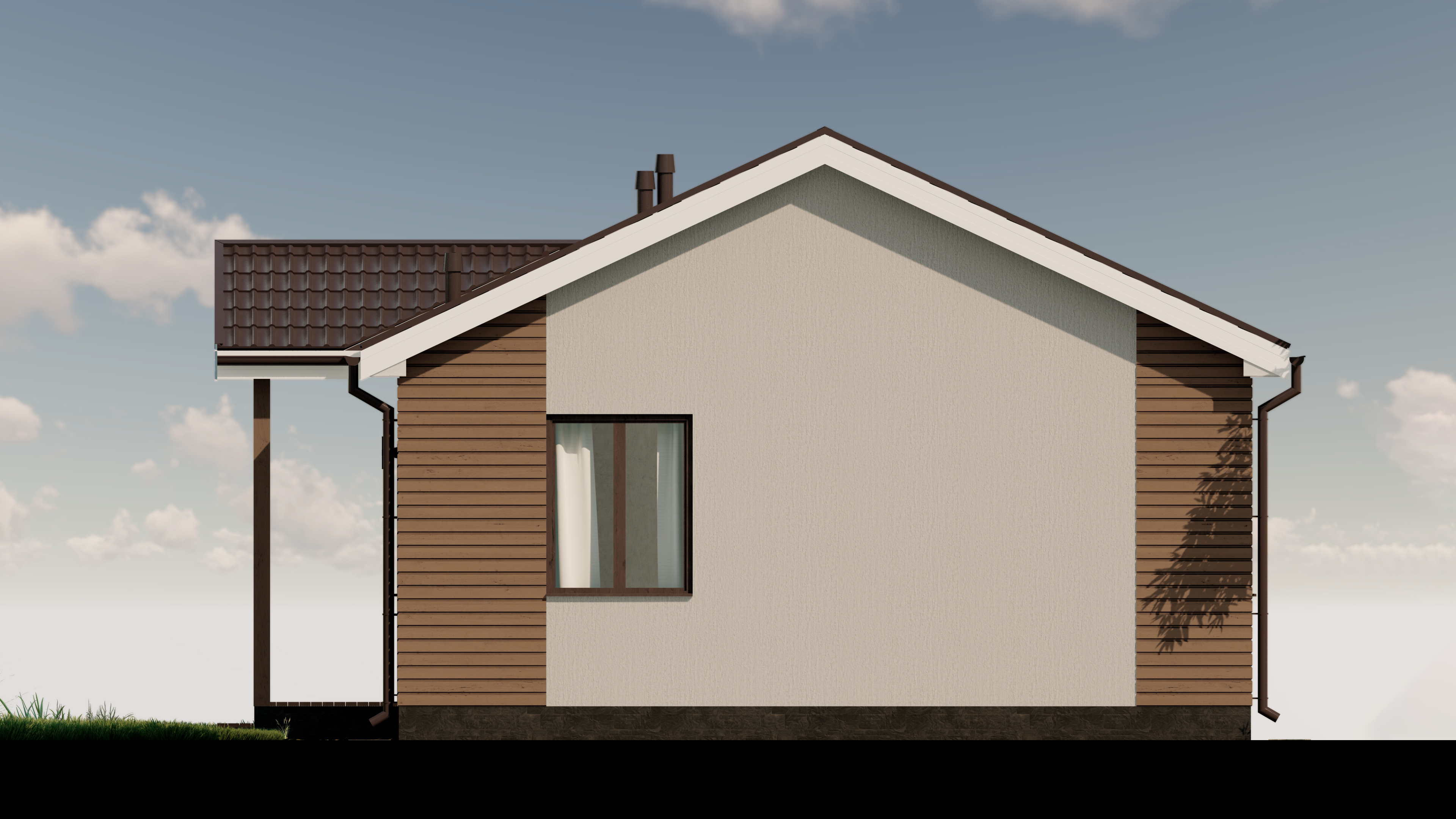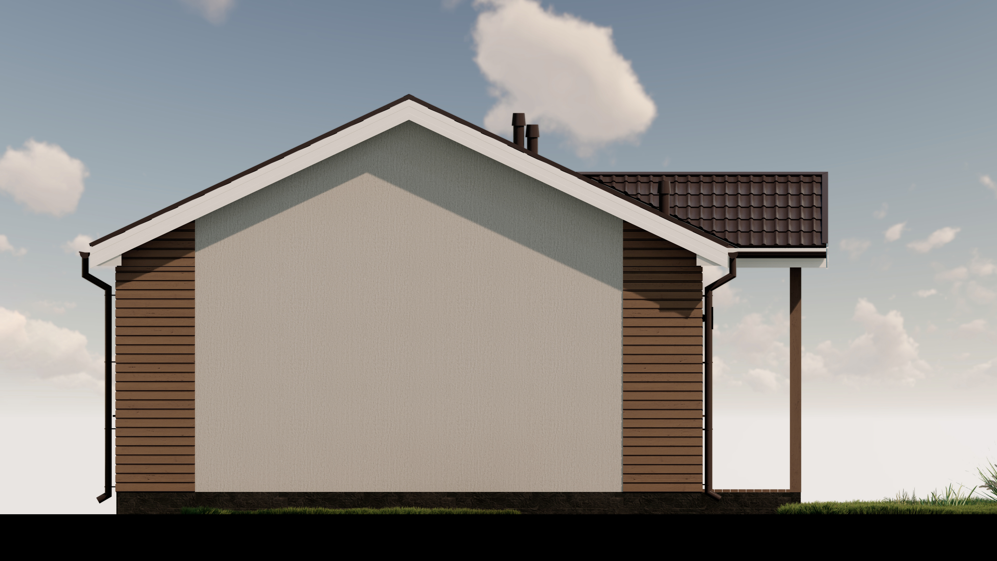 пиломатериал 1-го сорта естественной влажности, антисептированный (стропила 50*150 мм, обрешетка, поперечная обрешетка), пароизоляция А, D, утеплитель 150 мм, софиты (С-8 профиль), кровля - металлопрофиль (металлочерепица).