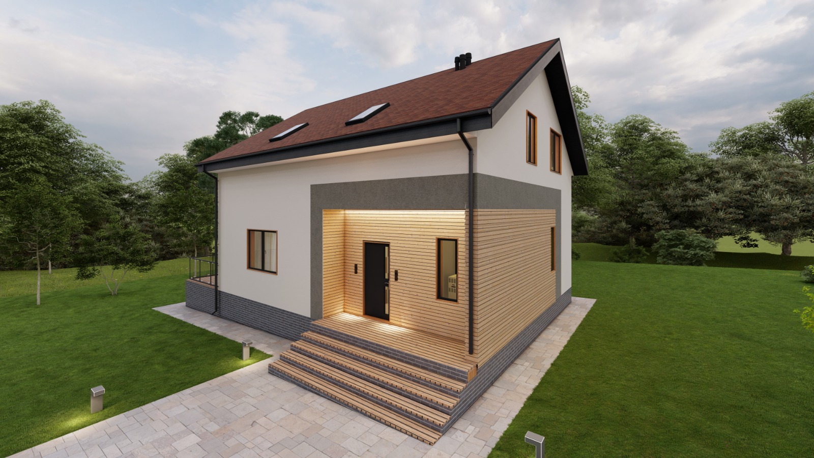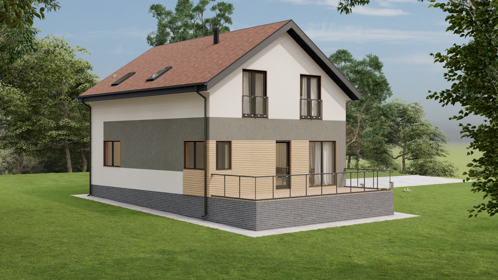 • Плоская или скатная утепленная кровля (пароизоляционная пленка, утеплитель вата на основе стекловолокна или базальта, гидро-ветрозащитная мембрана) с покрытием из металлочерепицы, полимерной мембраны или гибкой черепицы. (цена отличается от выбранного типа) (Ширина карнизного свеса от 30 см. Водосточная система в стоимость не входит