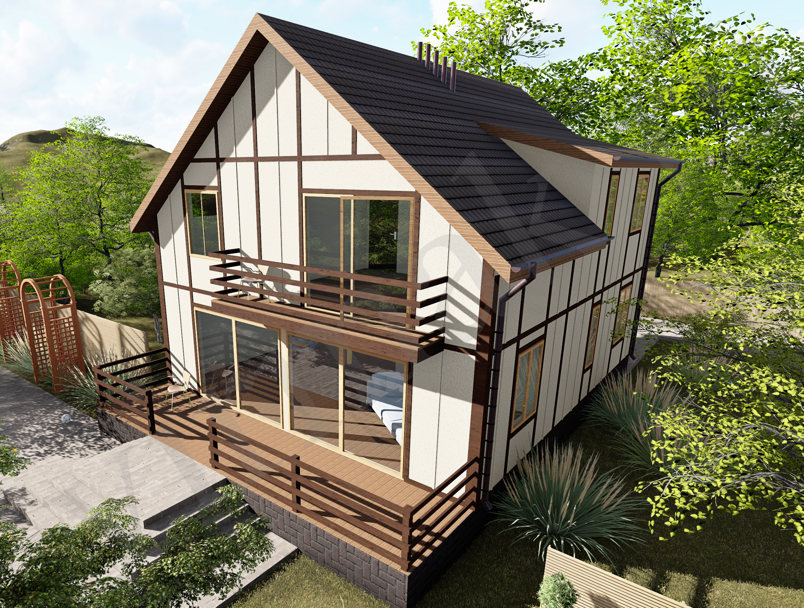 пиломатериал 1-го сорта естественной влажности, антисептированный (стропила 50*150 мм, обрешетка, поперечная обрешетка), пароизоляция А, D, утеплитель 150 мм, софиты (С-8 профиль), кровля - металлопрофиль (металлочерепица).
