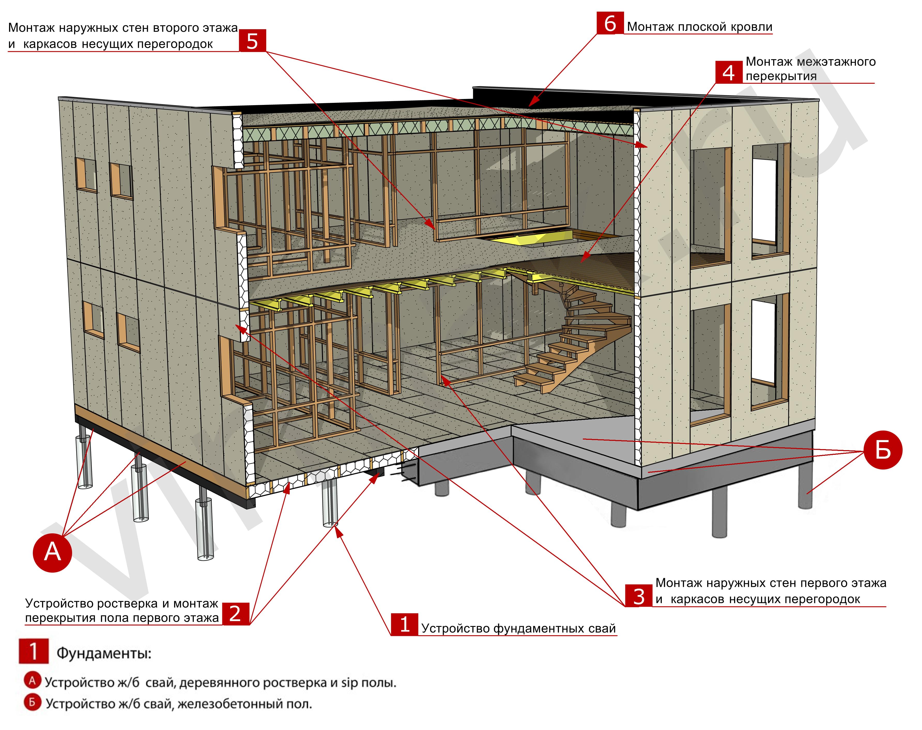 Монтаж наружных стен первого этажа и каркасов несущих перегородок