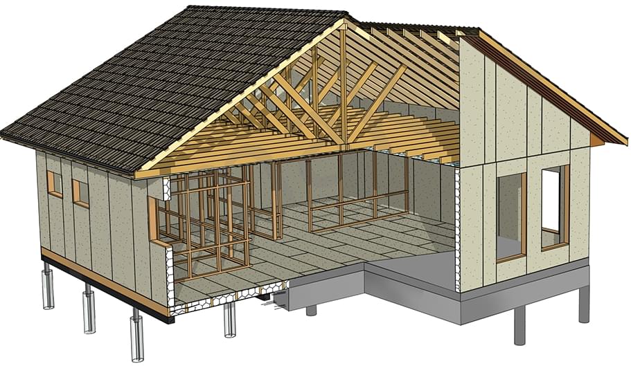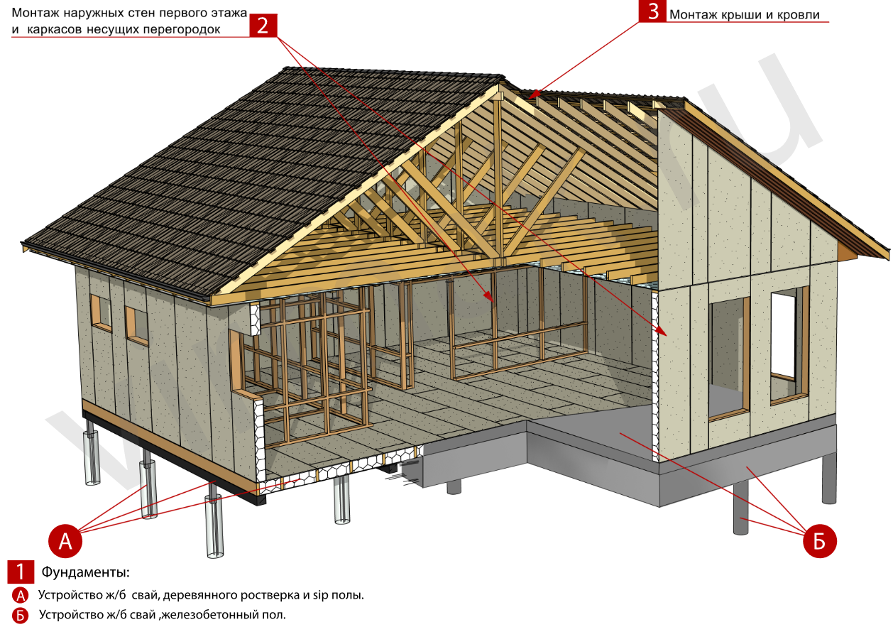 из СИП панелей из ЦСП размером 2700*1200*168 мм с антисептированным калиброванным пиломатериалом камерной сушки (46*140 мм). Монтаж каркасов несущих перегородок из пиломатериала 38*89 мм (76*89 мм).