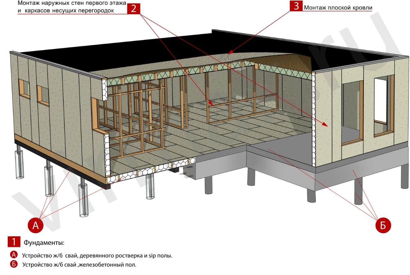 Монтаж наружных стен первого этажа и каркасов несущих перегородок