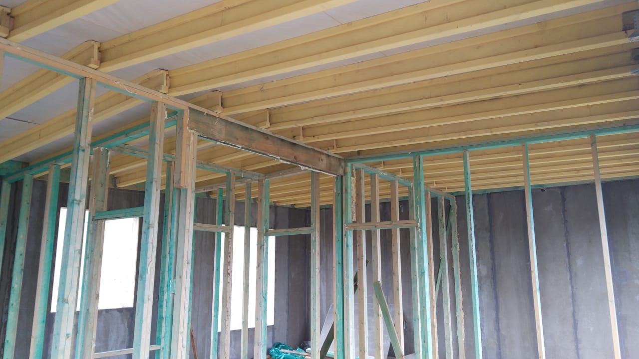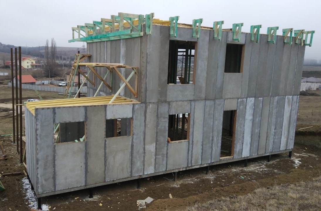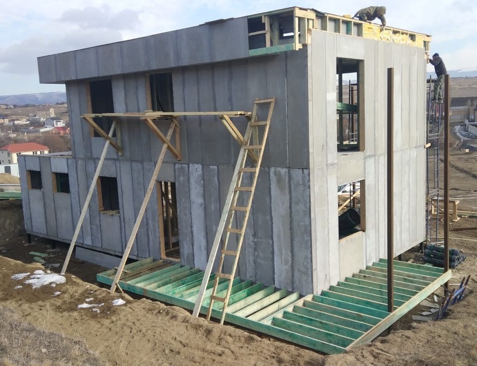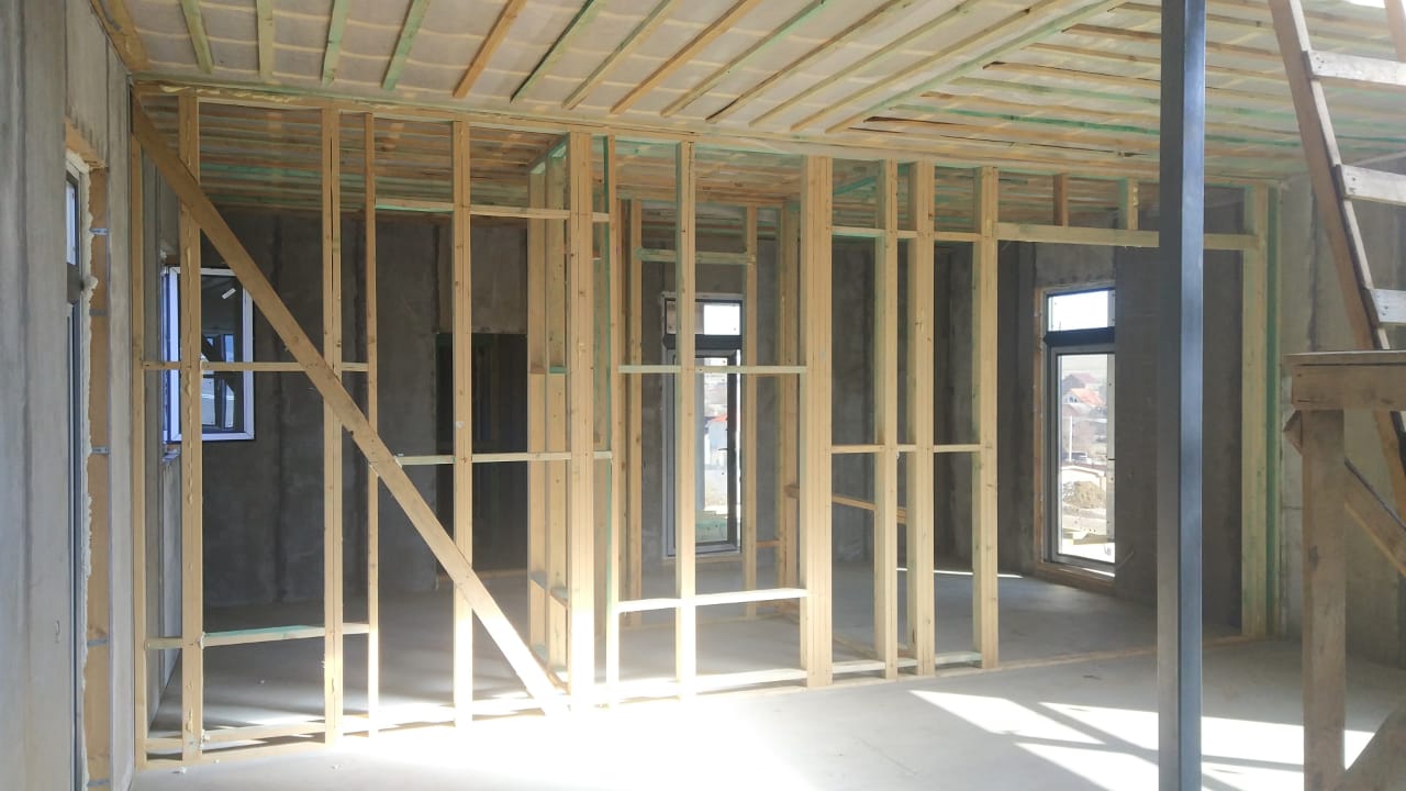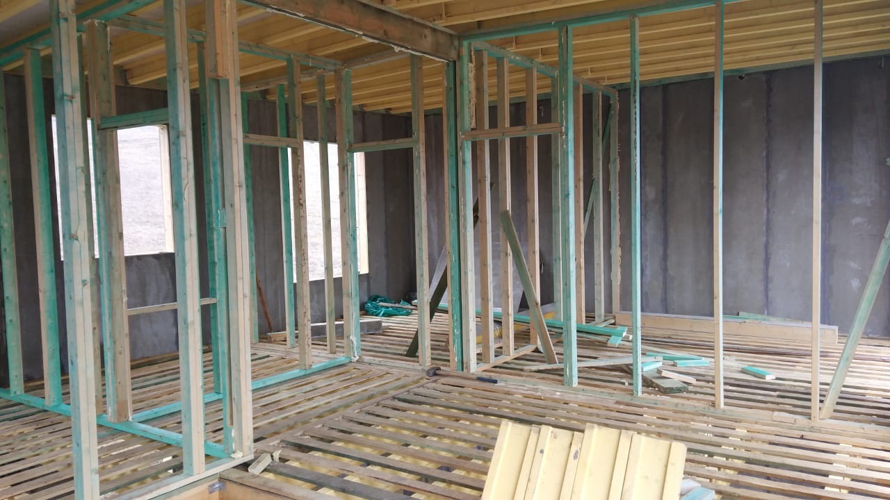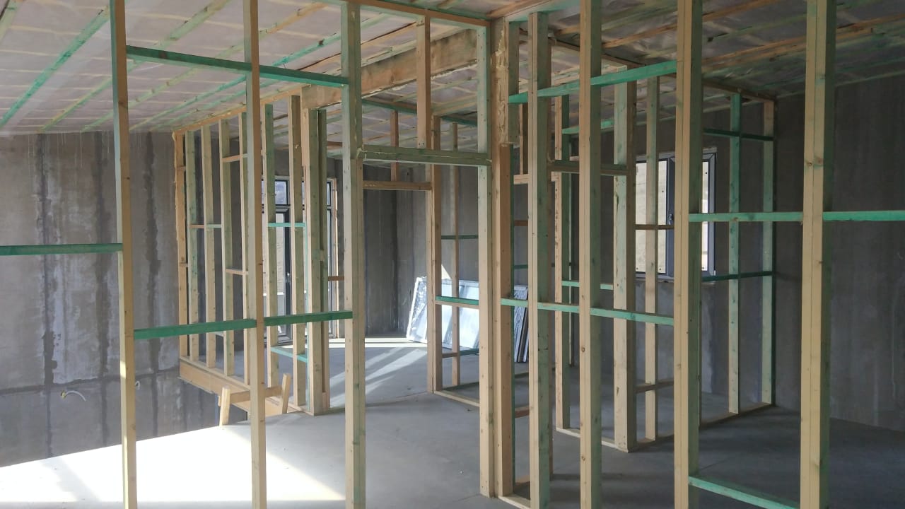 из СИП панелей из ЦСП размером 2700*1200*168 мм с антисептированным калиброванным пиломатериалом камерной сушки (46*140 мм). Монтаж каркасов несущих перегородок из пиломатериала 38*89 мм (76*89 мм).