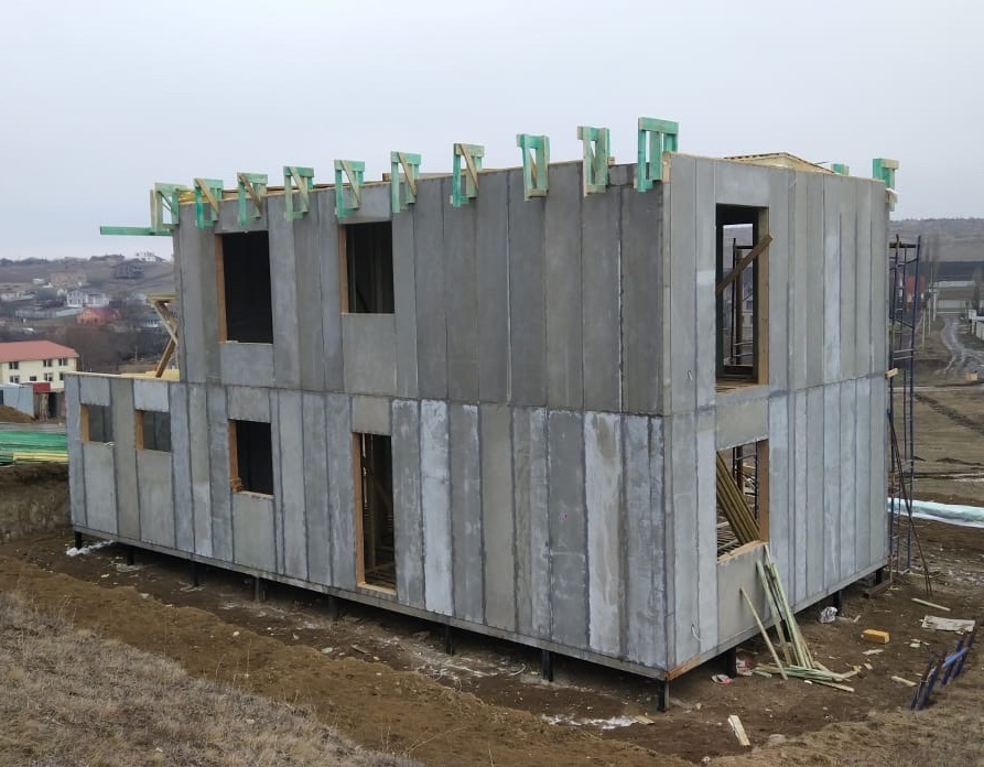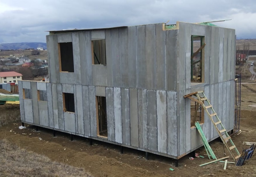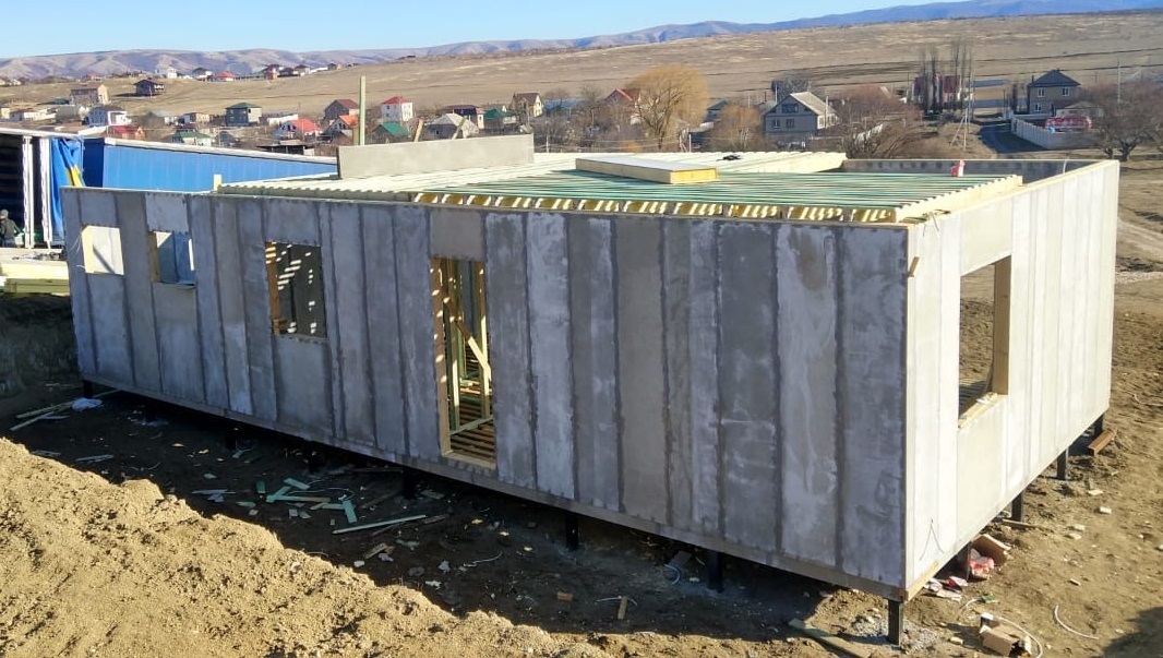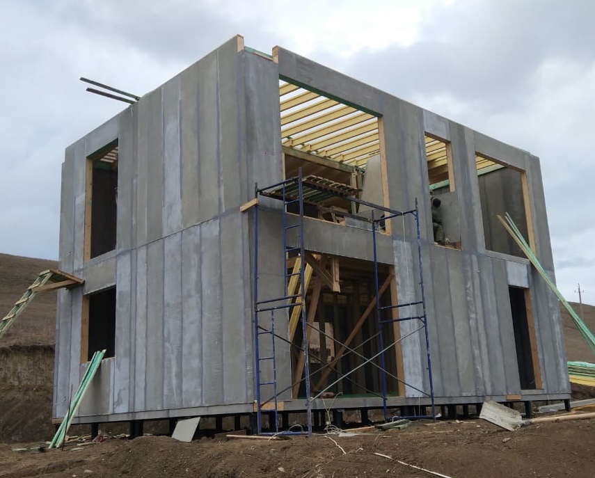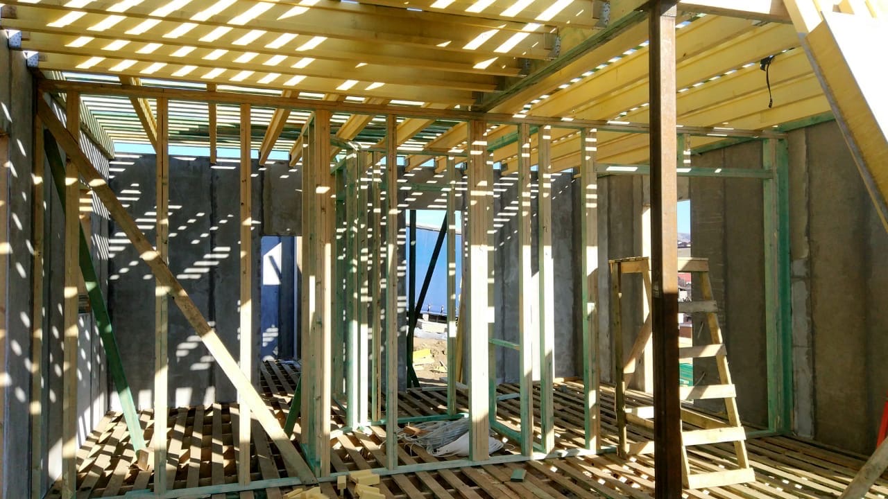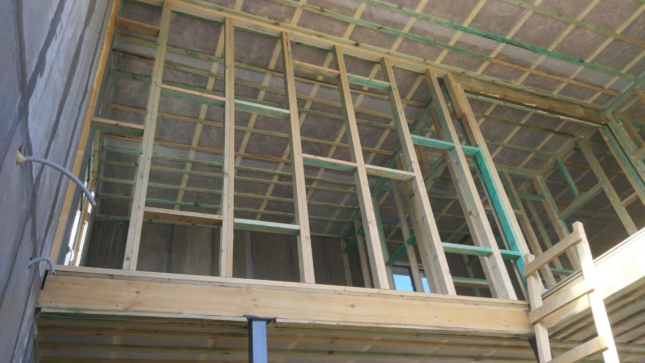 из СИП панелей из ЦСП размером 2700*1200*168 мм с антисептированным калиброванным пиломатериалом камерной сушки (46*140 мм). Монтаж каркасов несущих перегородок из пиломатериала 38*89 мм (76*89 мм).