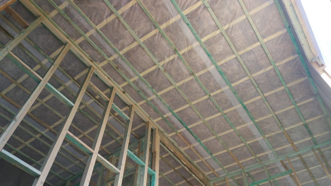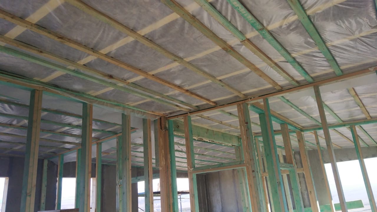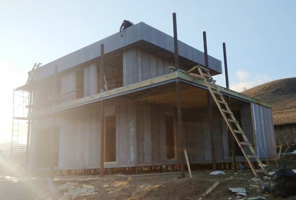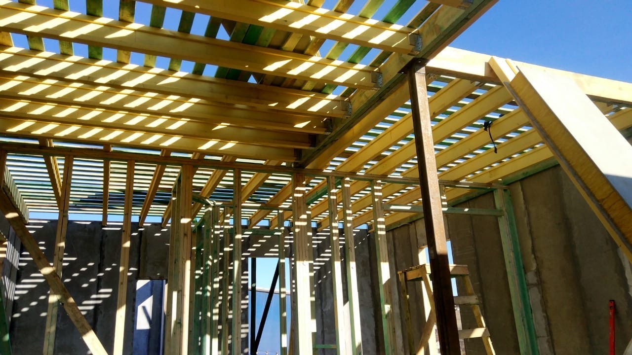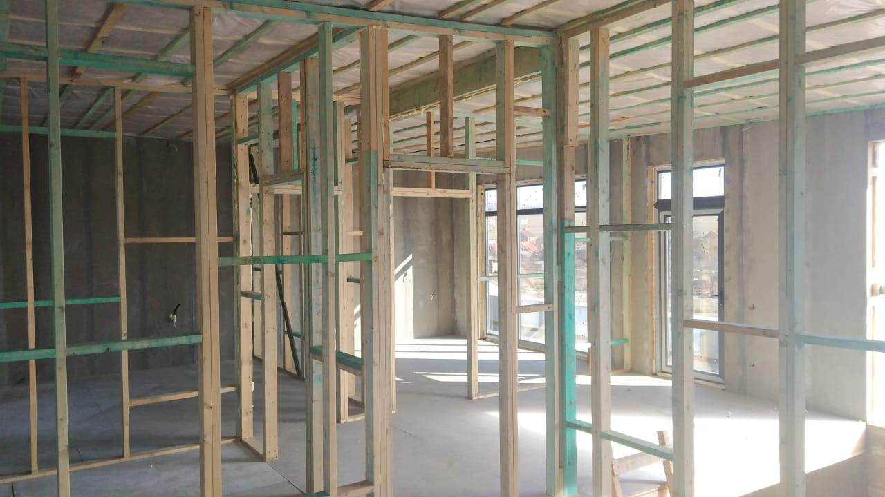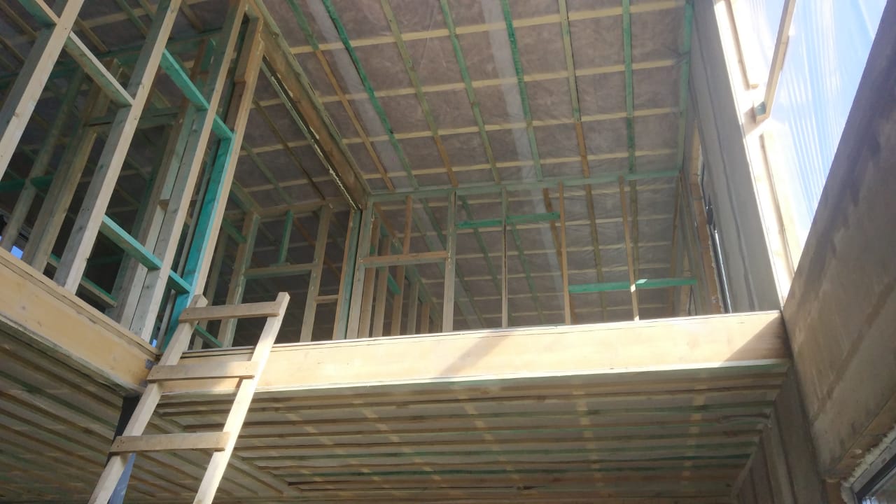 из СИП панелей из ЦСП размером 2700*1200*168 мм с антисептированным калиброванным пиломатериалом камерной сушки (46*140 мм). Монтаж каркасов несущих перегородок из пиломатериала 38*89 мм (76*89 мм).