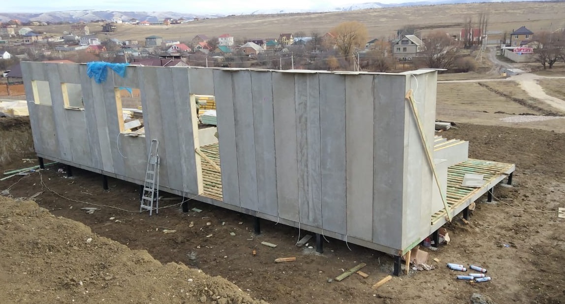 Монтаж наружных стен первого этажа и каркасов несущих перегородок