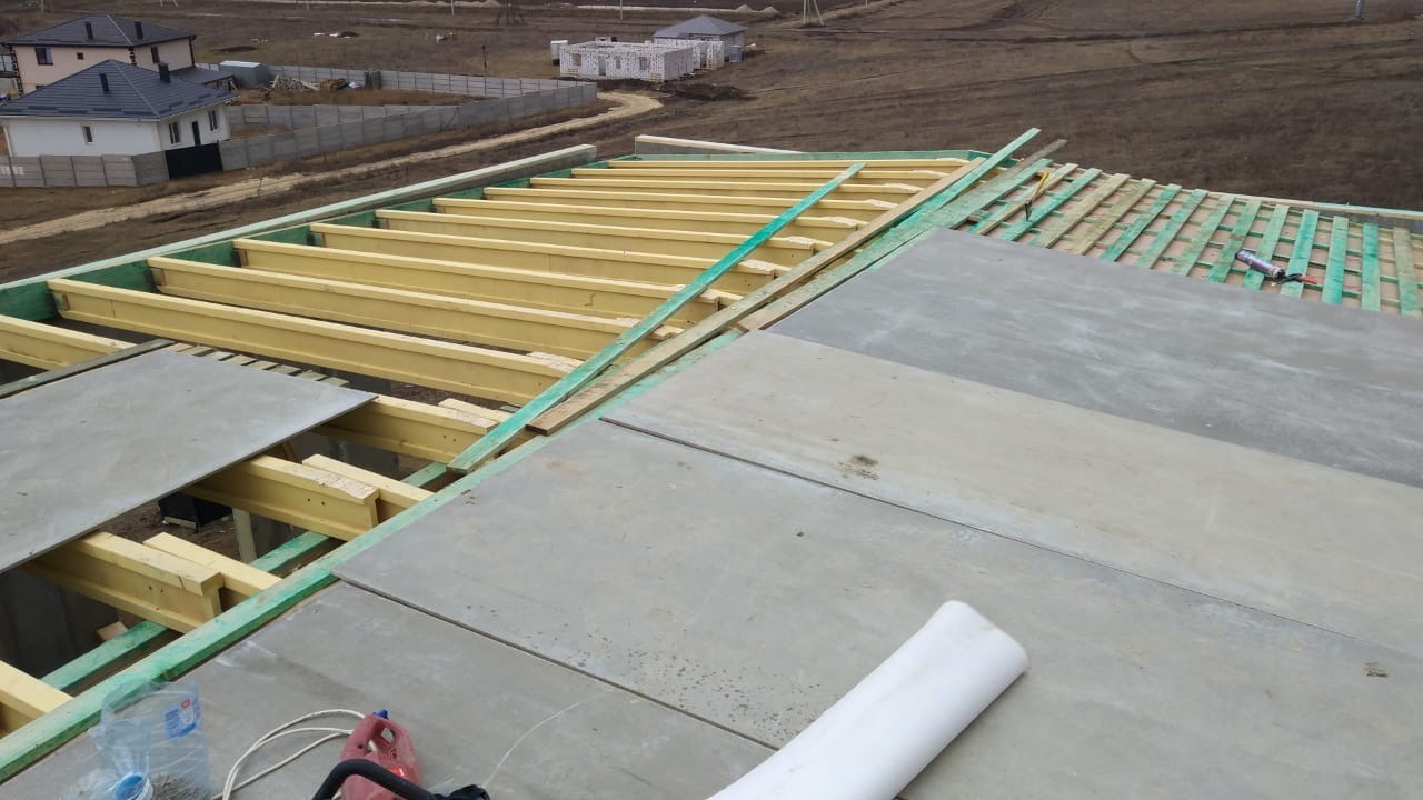 Кровля может быть построена из бруса 150х50мм или SIP панелей. В качестве кровельного материала можно использовать: металлочерепицу, битумную и керамическую черепицу. Также производим кровельные шовные сэндвич-панели.
