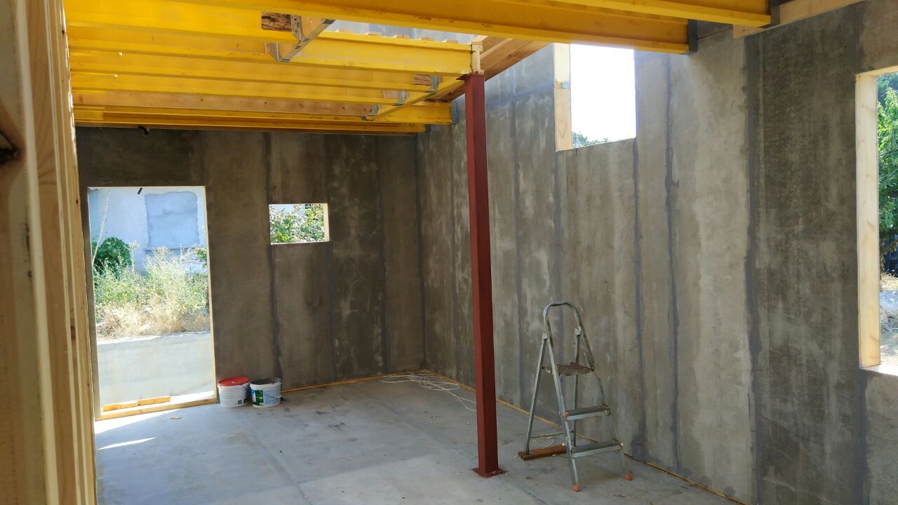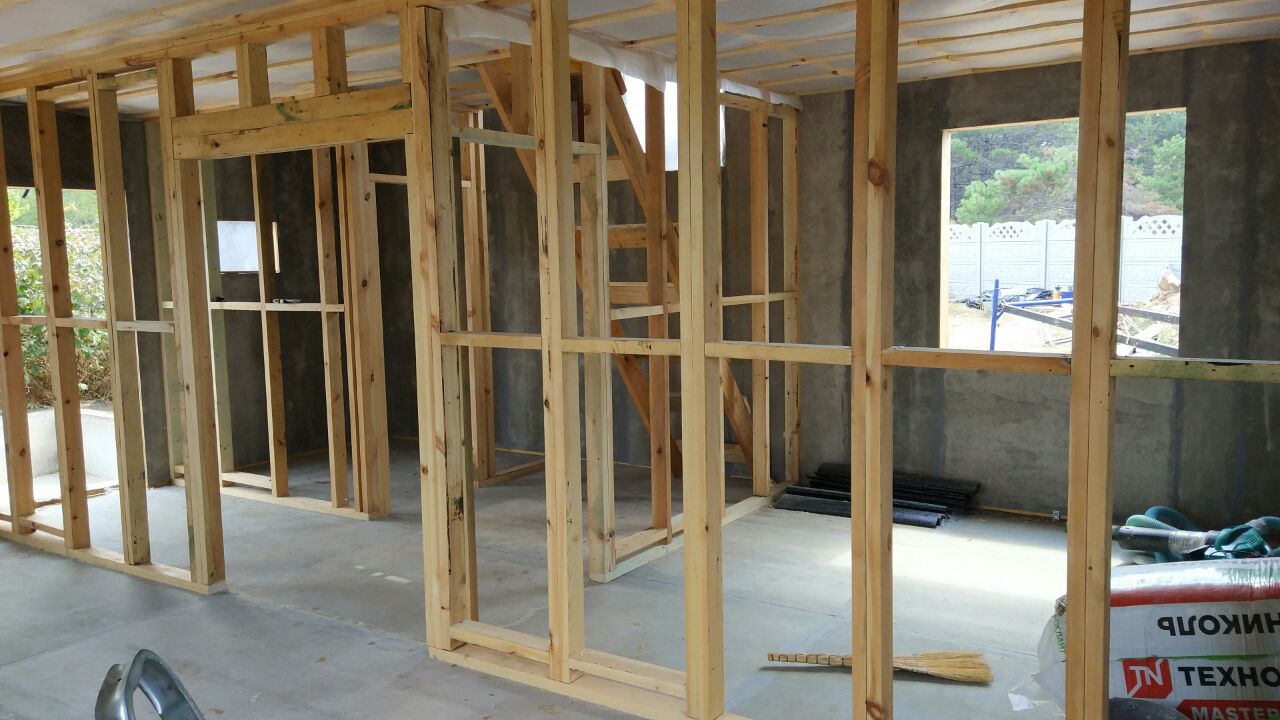 из СИП панелей из ЦСП размером 2700*1200*168 мм с антисептированным калиброванным пиломатериалом камерной сушки (46*140 мм). Монтаж каркасов несущих перегородок из пиломатериала 38*89 мм (76*89 мм).