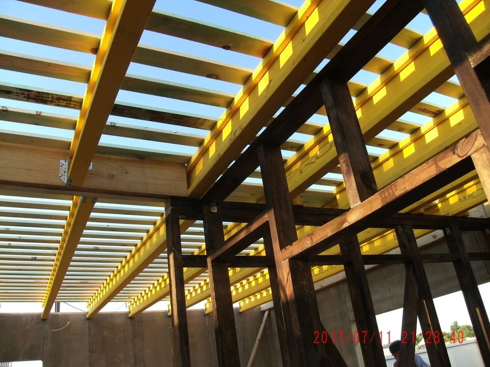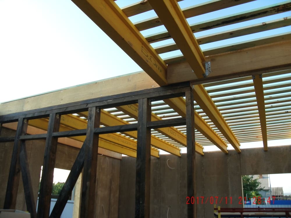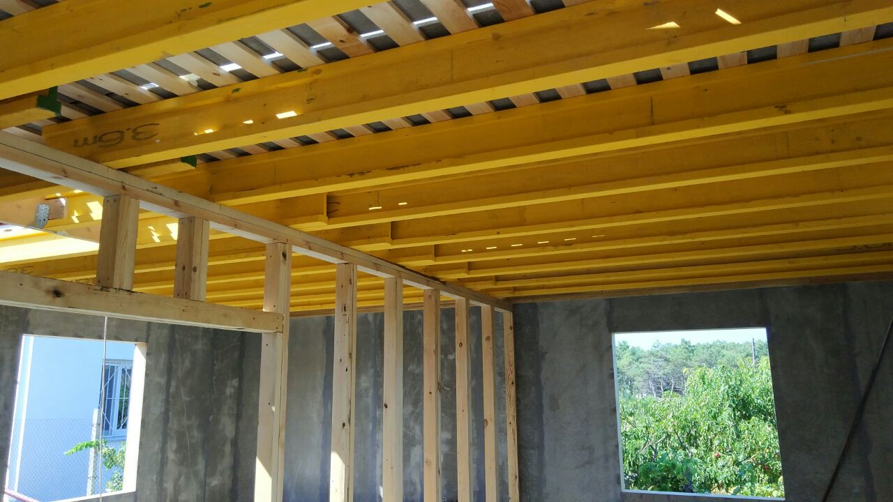 В межэтажных перекрытиях в качестве несущих лаг мы применяем двутавровые балки собственного производства с влагостойкой 24 мм. фанерой в сердечнике.