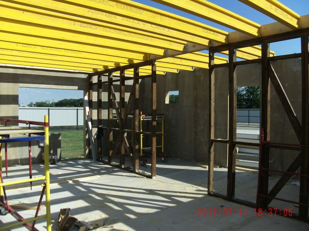 Монтаж наружных стен первого этажа и каркасов несущих перегородок